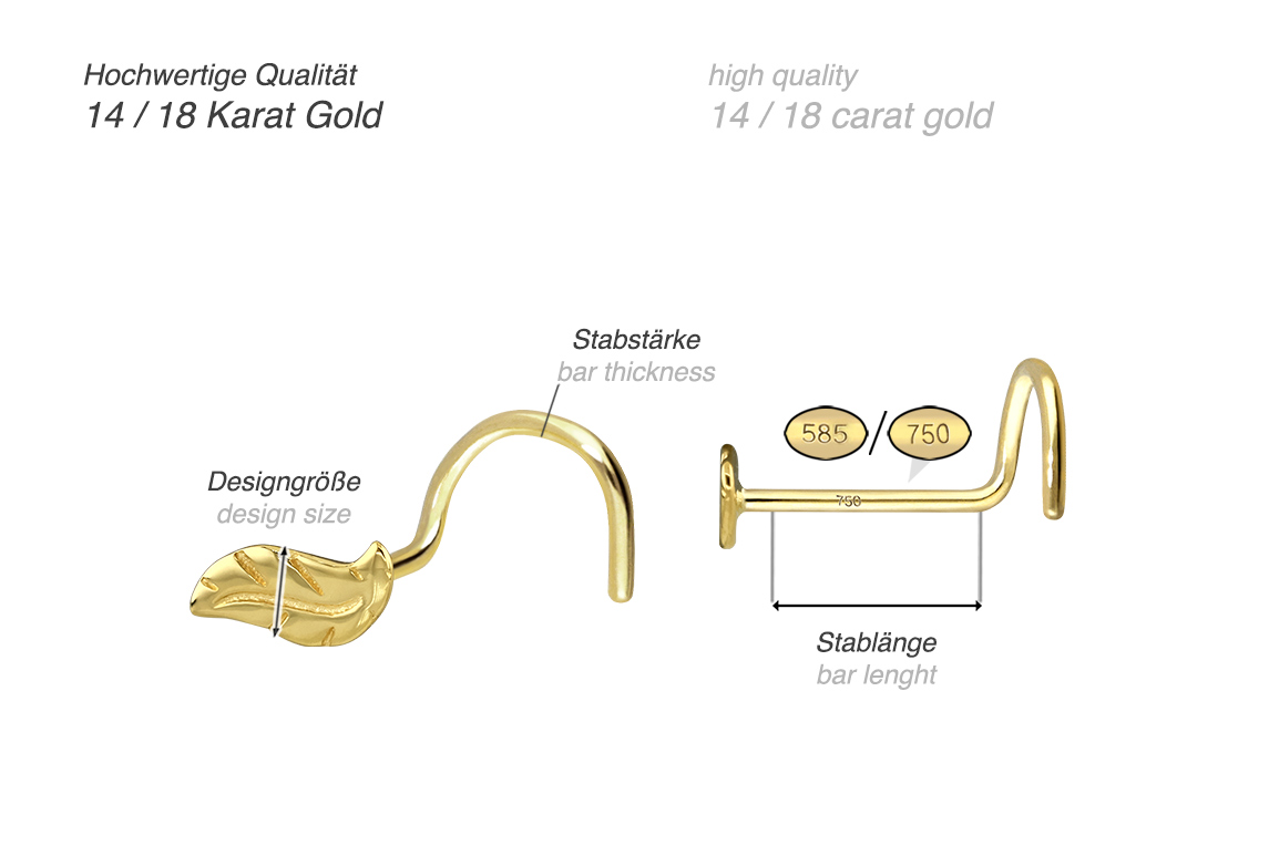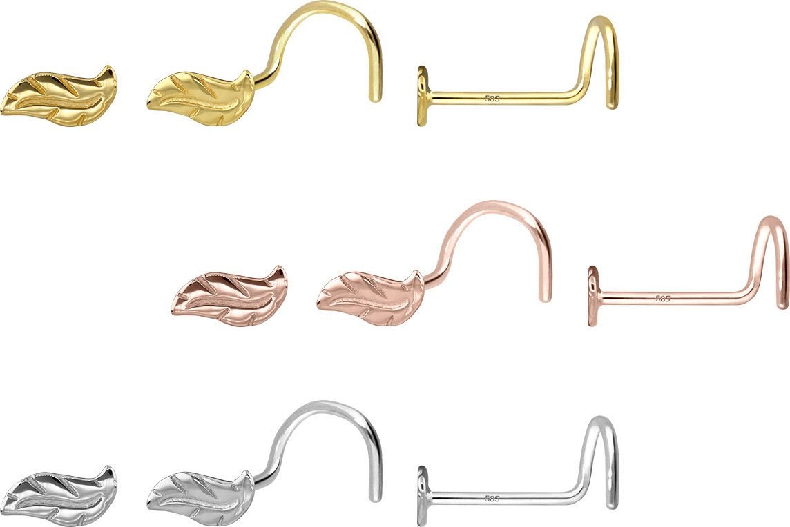 This nose stud with the design in form of a leaf is made entirely of high quality 14 carat (585) or 18 carat (750) gold, which in addition to its excellent quality also knows how to impress with properties such as good skin compatibility and high durability. Color-wise, it is available in yellow gold, rose gold and rhodium-plated white gold, depending on the fineness desired. Each and every one of our gold items is handcrafted with great attention to detail, making it one of a kind. Thanks to the spiral-shaped bar of this piece of jewelry, a particularly firm hold in the nose is ensured. It always has a bar thickness of 0.6 mm, whereas its bar length is 6 mm.