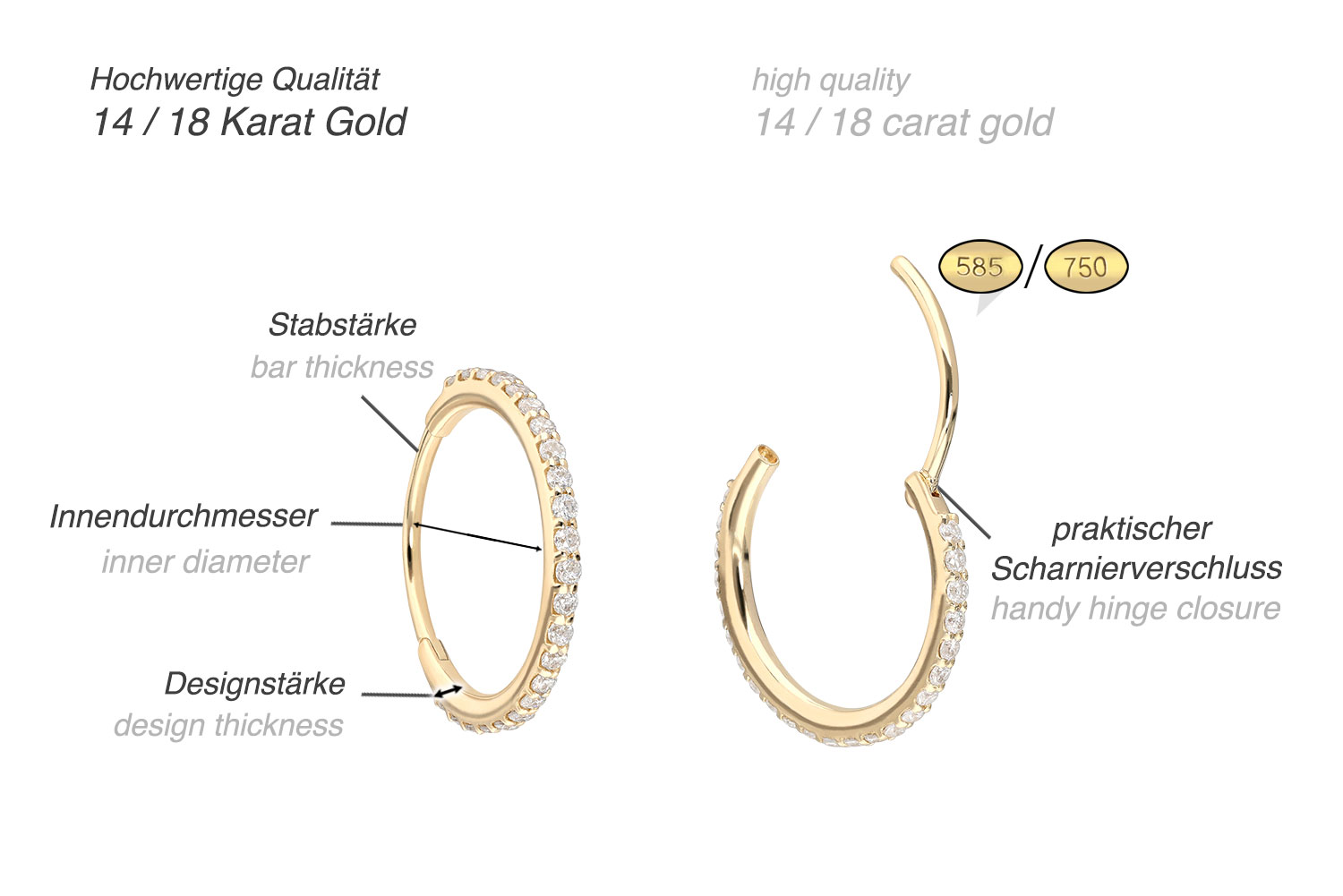 Easy handling and gorgeous design - that is what our ear clickers are all about! The main feature of the clickers is the practical hinge, which simplifies the piercing's insertion. Except for the moissanites, these precious clickers are made entirely of high quality 14 carat (585) and 18 carat (750) yellow gold, which in addition to its excellent quality also knows how to impress with properties such as good skin compatibility and high durability. The moissanite gives the piece of jewellery its extraordinary, diamond-like shine. Each and every one of our gold items is handcrafted with great attention to detail, making it one of a kind. Thanks to the sparkling moissanites with settings, these creoles are wonderfully suited as everyday companions. Their insertable part has a bar thickness of 0.8 mm, wheareas their visible design has a thickness of 1.2 mm. The creoles are supplied in pairs as depicted.Moissanite is a mineral that rarely occurs in nature and is usually produced in the laboratory. As it resembles a diamond in many ways and at the same time has extraordinary characteristics, moissanite is also known as “imitation diamond”. The difference between the two minerals is that a diamond consists of hard-pressed carbon, whereas a moissanite is composed of silicon carbide. On the Moh's scale of hardness for gemstones, moissanite has a very high value of 9.25, which can be attributed to its resistance and very hard structure.
