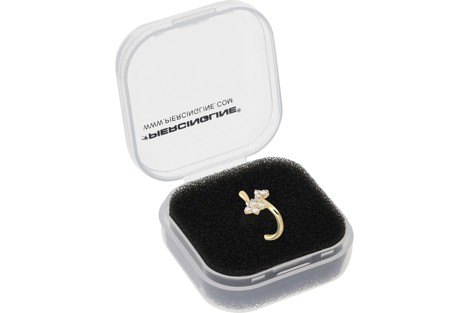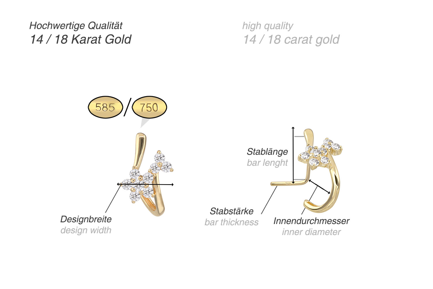 Except for the moissanites, this nose stud is made entirely of high quality 14 carat (585) or 18 carat (750) yellow gold, which in addition to its excellent quality also knows how to impress with properties such as good skin compatibility and high durability. The moissanite gives the piece of jewellery its extraordinary, diamond-like shine. Each and every one of our gold items is handcrafted with great attention to detail, making it one of a kind. Thanks to the L-shaped bar of this piece of jewelry, a particularly firm hold in the nose is ensured. At the same time, the flower design, visible from the outside, is reminiscent of a closed nose ring. It always has a bar thickness of 0.6 mm, whereas its bar length is 7 mm.