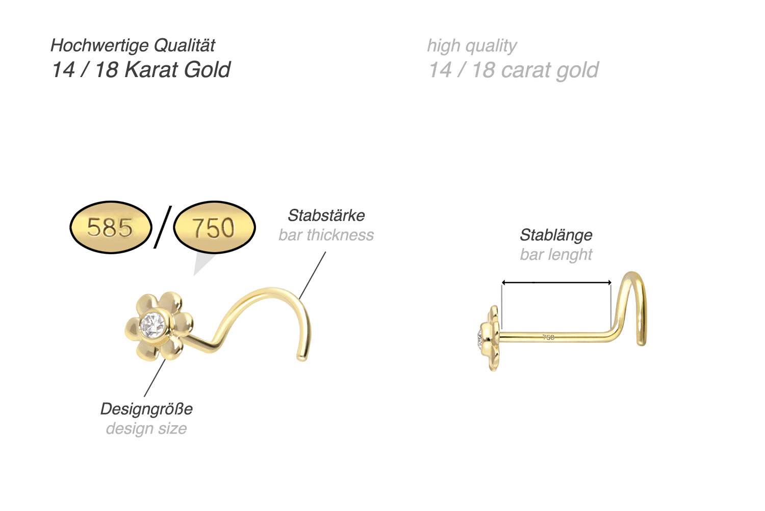 Except for the moissanite, this nose stud with the design in form of flower is made entirely of high quality 14 carat (585) or 18 carat (750) gold, which in addition to its excellent quality also knows how to impress with properties such as good skin compatibility and high durability. Color-wise, it is available in yellow gold, rose gold and rhodium-plated white gold. The moissanite gives the piece of jewellery its extraordinary, diamond-like shine. Each and every one of our gold items is handcrafted with great attention to detail, making it one of a kind. Thanks to the spiral-shaped bar of this piece of jewelry, a particularly firm hold in the nose is ensured. It always has a bar thickness of 0.6 mm, whereas its bar length is 6 mm.