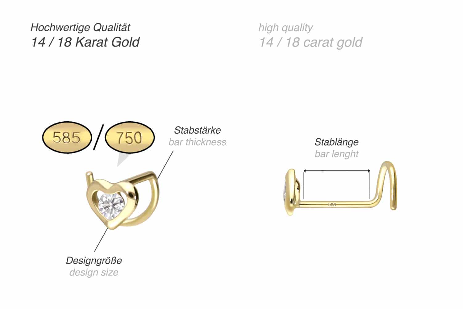 Except for the moissanite, this nose stud with the design in form of a heart is made entirely of high quality 14 carat (585) or 18 carat (750) gold, which in addition to its excellent quality also knows how to impress with properties such as good skin compatibility and high durability. Color-wise, it is available in yellow gold, rose gold and rhodium-plated white gold. The moissanite gives the piece of jewellery its extraordinary, diamond-like shine. Each and every one of our gold items is handcrafted with great attention to detail, making it one of a kind. Thanks to the spiral-shaped bar of this piece of jewelry, a particularly firm hold in the nose is ensured. It always has a bar thickness of 0.6 mm, whereas its bar length is 6 mm.
