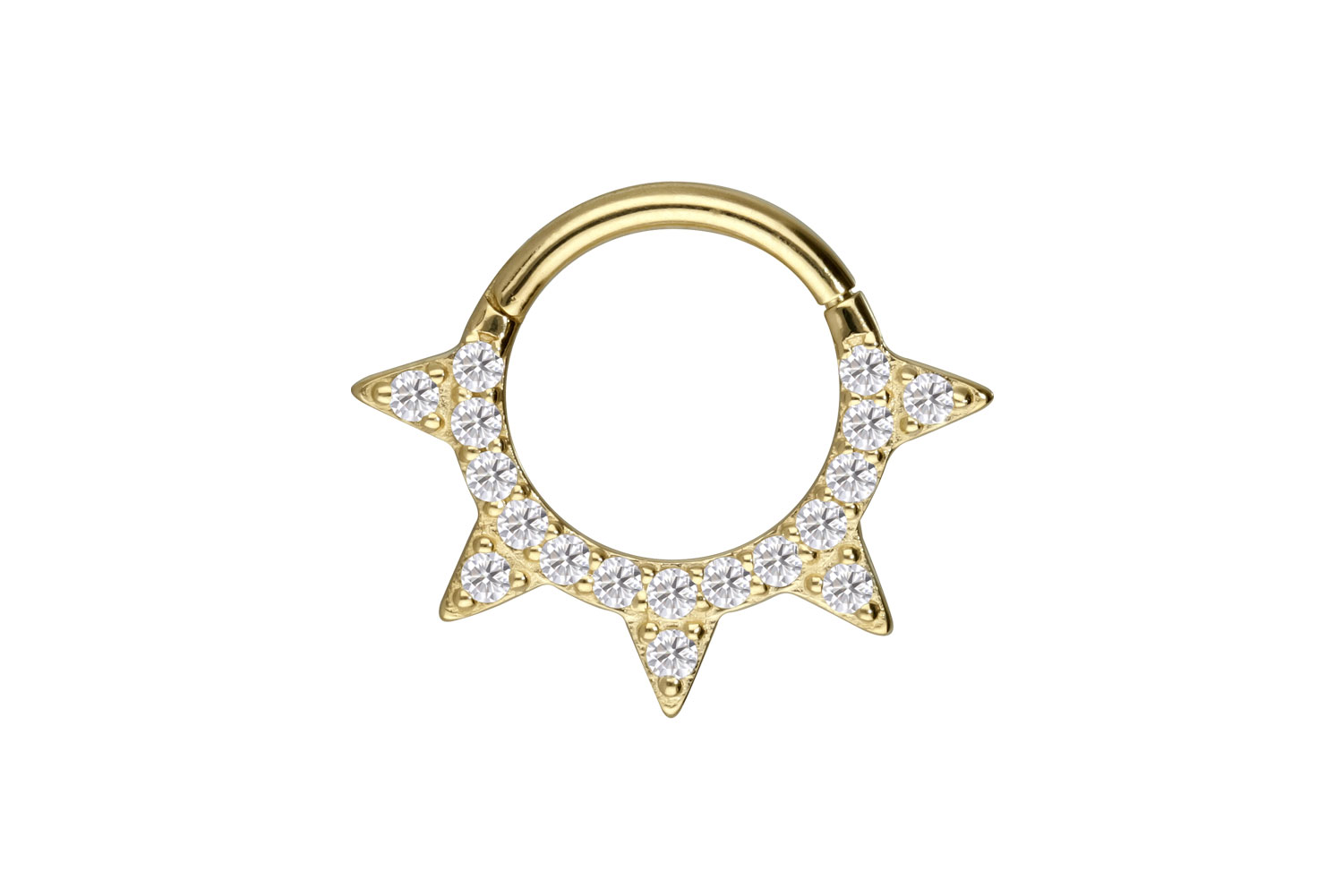 Easy handling and gorgeous design - that is what our clickers are all about! The main feature of the clickers is the practical hinge, which simplifies the piercing's insertion. Except for the moissanites, this precious clicker is made entirely of high quality 14 carat (585) or 18 carat (750) yellow gold, which in addition to its excellent quality also knows how to impress with properties such as good skin compatibility and high durability. The moissanite gives the piece of jewellery its extraordinary, diamond-like shine. Each and every one of our gold items is handcrafted with great attention to detail, making it one of a kind. As a special highlight, several cones adorn the stylish clicker. Whether at the ear, the nose or the lip - our clickers are suitable for a variety of different piercing locations. This clicker has a bar thickness of 1.2 mm, while its available inner diameters are listed below.