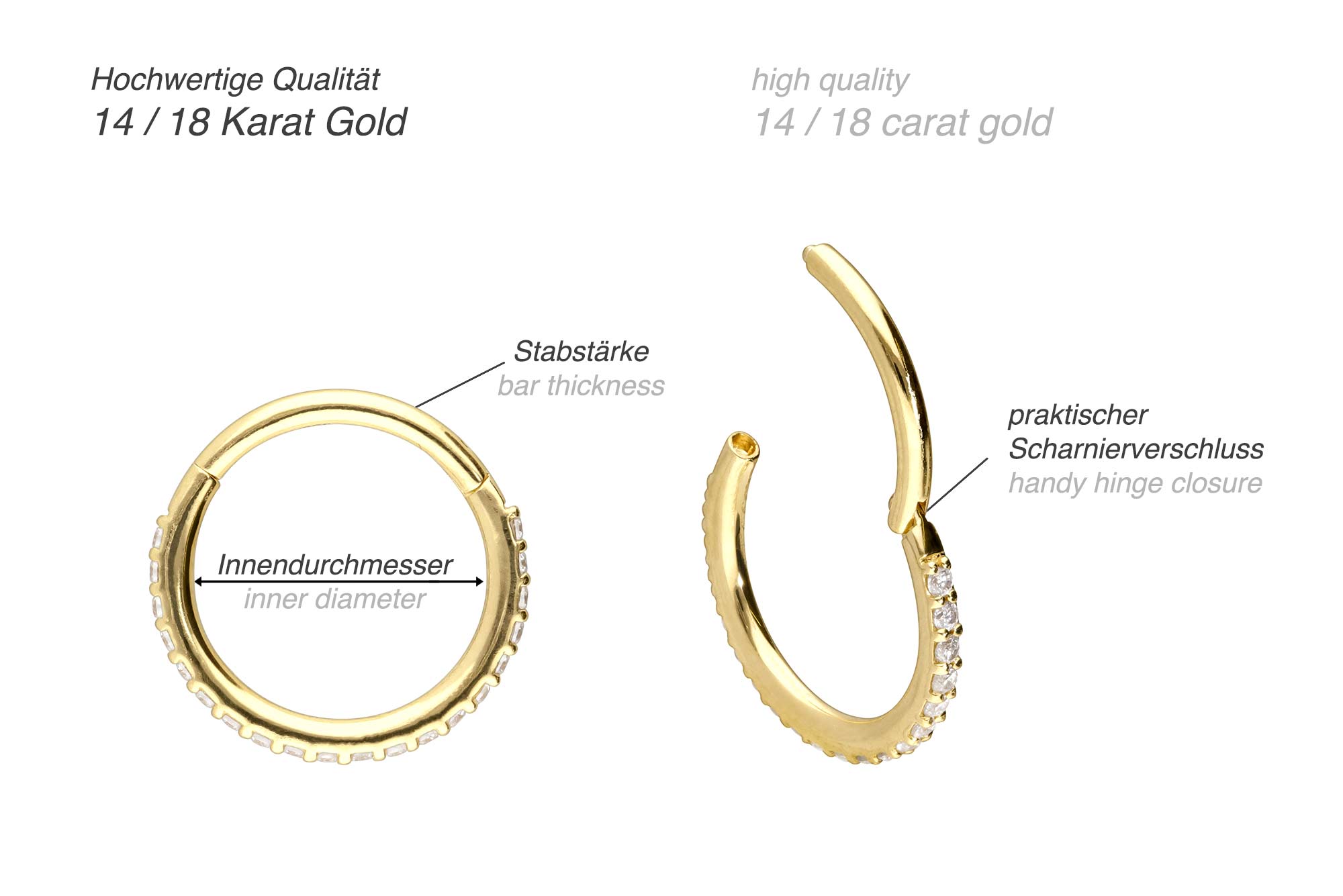 Easy handling and gorgeous design - that is what our clickers are all about! The main feature of the clickers is the practical hinge, which simplifies the piercing's insertion. Except for the set moissanites, this precious clicker is made entirely of high quality 14 carat (585) or 18 carat (750) gold, which in addition to its excellent quality also knows how to impress with properties such as good skin compatibility and high durability. Color-wise, it is available in yellow gold, rose gold and rhodium-plated white gold, depending on the fineness desired. The moissanite gives the piece of jewellery its extraordinary, diamond-like shine. Each and every one of our gold items is handcrafted with great attention to detail, making it one of a kind. Whether at the ear, the nose or the lip - our clickers are suitable for a variety of different piercing locations. This clicker has a bar thickness of either 1 mm or 1.2 mm, while its available inner diameters are listed below.