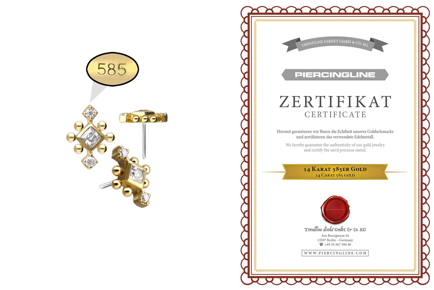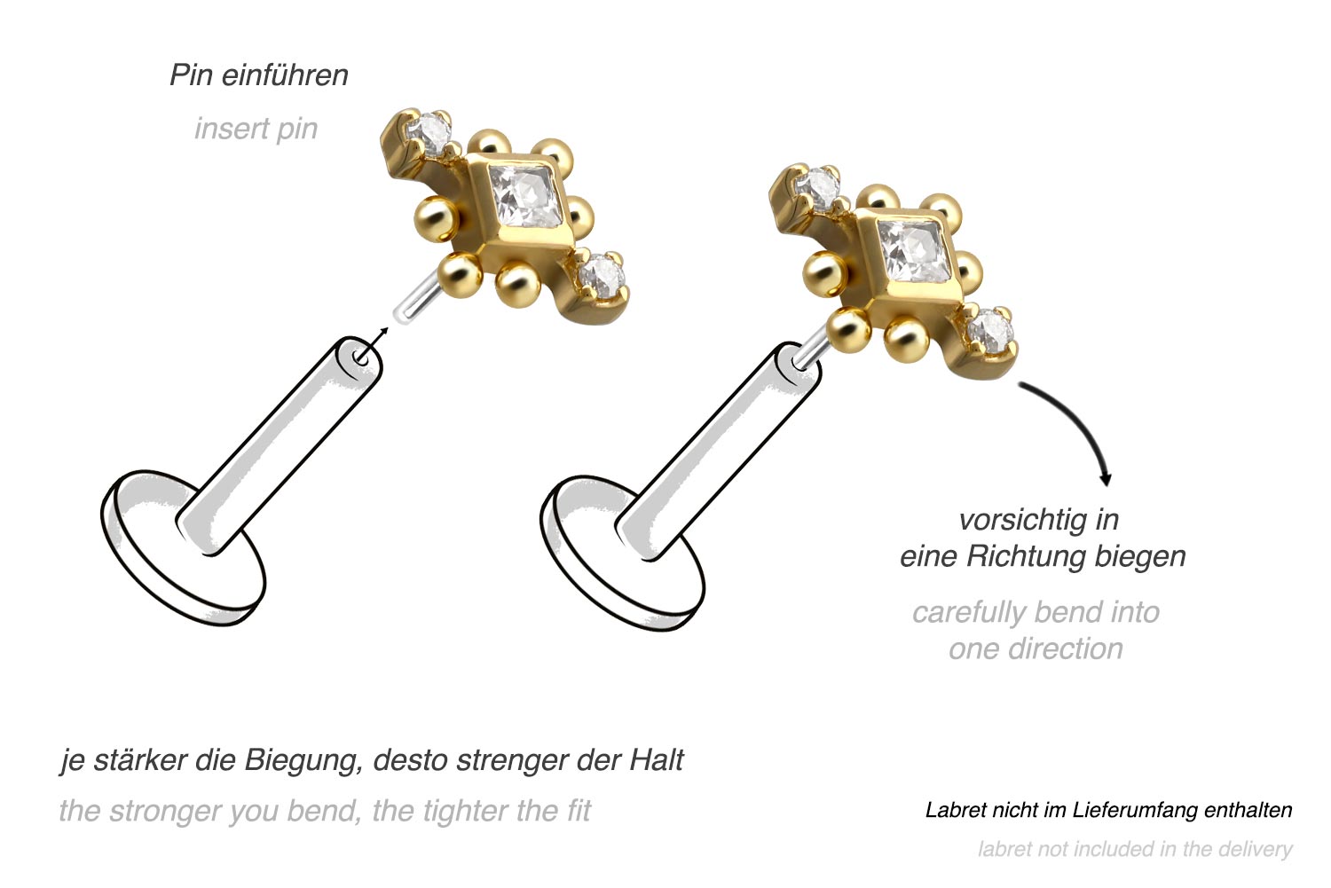 Except for the moissanites, this timelessly beautiful push pin attachment is made entirely of high quality 14 carat (585) gold, which in addition to its excellent quality also knows how to impress with properties such as good skin compatibility and high durability. Only the push pin is made of titanium (grade 23). Color-wise, it is available in yellow gold, rose gold and rhodium-plated white gold. The moissanites give the piece of jewellery its extraordinary, diamond-like shine. Each and every one of our gold items is handcrafted with great attention to detail, making it one of a kind. For insertion, the pin must be bent as desired. It should be noted that a firmer hold is ensured when the pin is bent a little more. Since the push pin attachment is compatible with all our gold products with push fit, there are various combination possibilities.