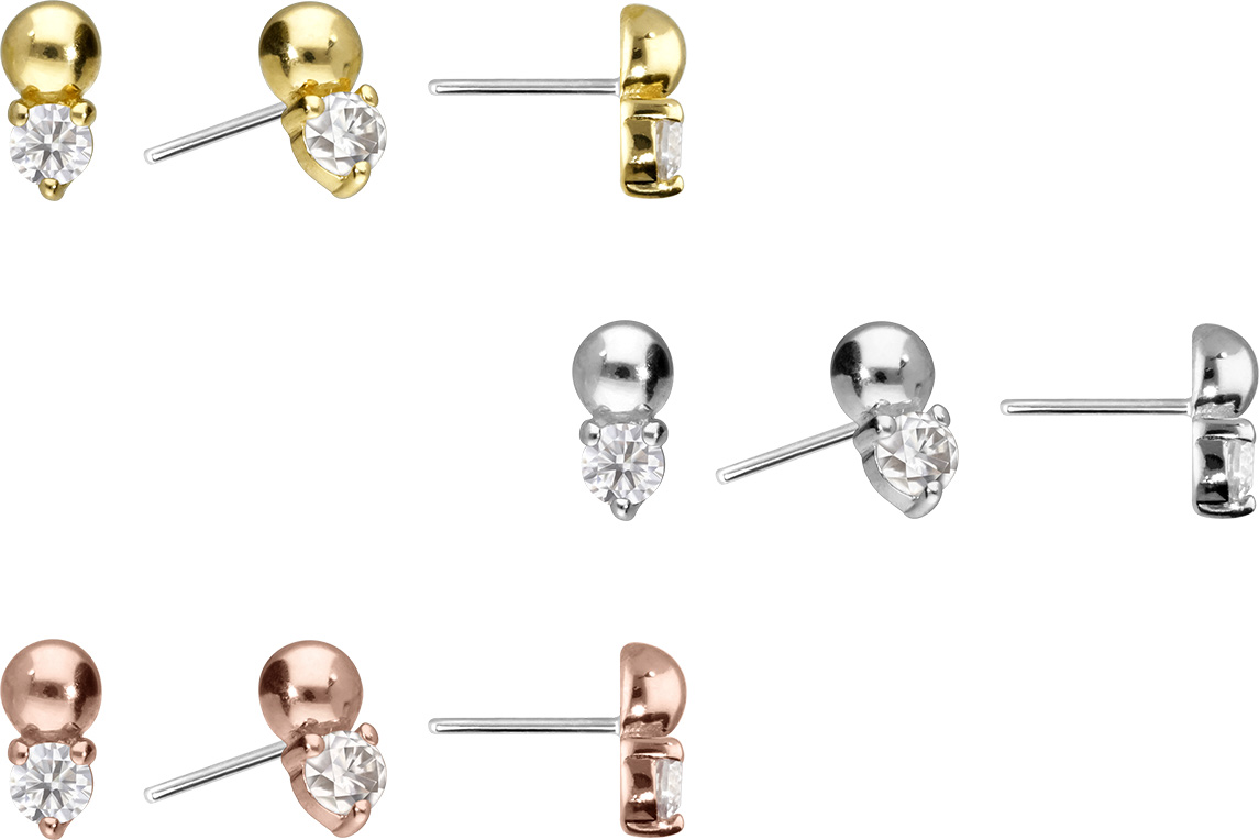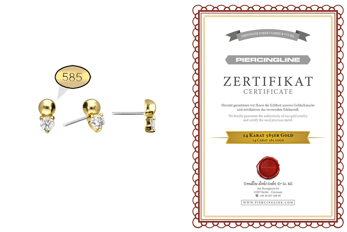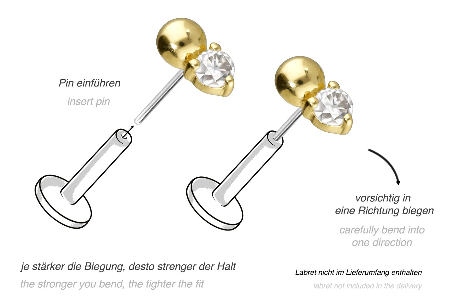 Except for the moissanite, this timelessly beautiful push pin attachment in form of a ball is made entirely of high quality 14 carat (585) gold, which in addition to its excellent quality also knows how to impress with properties such as good skin compatibility and high durability. Only the push pin is made of titanium (grade 23). Color-wise, it is available in yellow gold, rose gold and rhodium-plated white gold. The moissanites give the piece of jewellery its extraordinary, diamond-like shine. Each and every one of our gold items is handcrafted with great attention to detail, making it one of a kind. For insertion, the pin must be bent as desired. It should be noted that a firmer hold is ensured when the pin is bent a little more. Since the push pin attachment is compatible with all our 14 carat (585) gold products with push fit, there are various combination possibilities.
