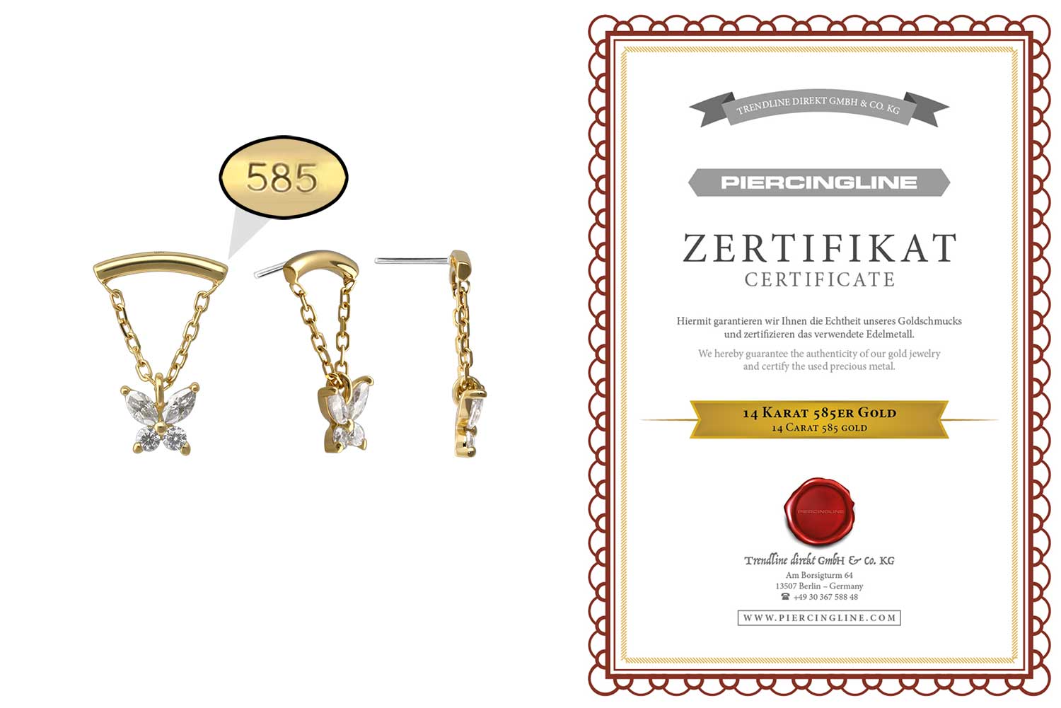 Except for the moissanites, this timelessly beautiful push pin attachment is made entirely of high quality 14 carat (585) gold, which in addition to its excellent quality also knows how to impress with properties such as good skin compatibility and high durability. Only the push pin is made of titanium (grade 23). Color-wise, it is available in yellow gold, rose gold and rhodium-plated white gold. The moissanites give the piece of jewellery its extraordinary, diamond-like shine. Each and every one of our gold items is handcrafted with great attention to detail, making it one of a kind. For insertion, the pin must be bent as desired. It should be noted that a firmer hold is ensured when the pin is bent a little more. Since the push pin attachment is compatible with all our gold products with push fit, there are various combination possibilities.