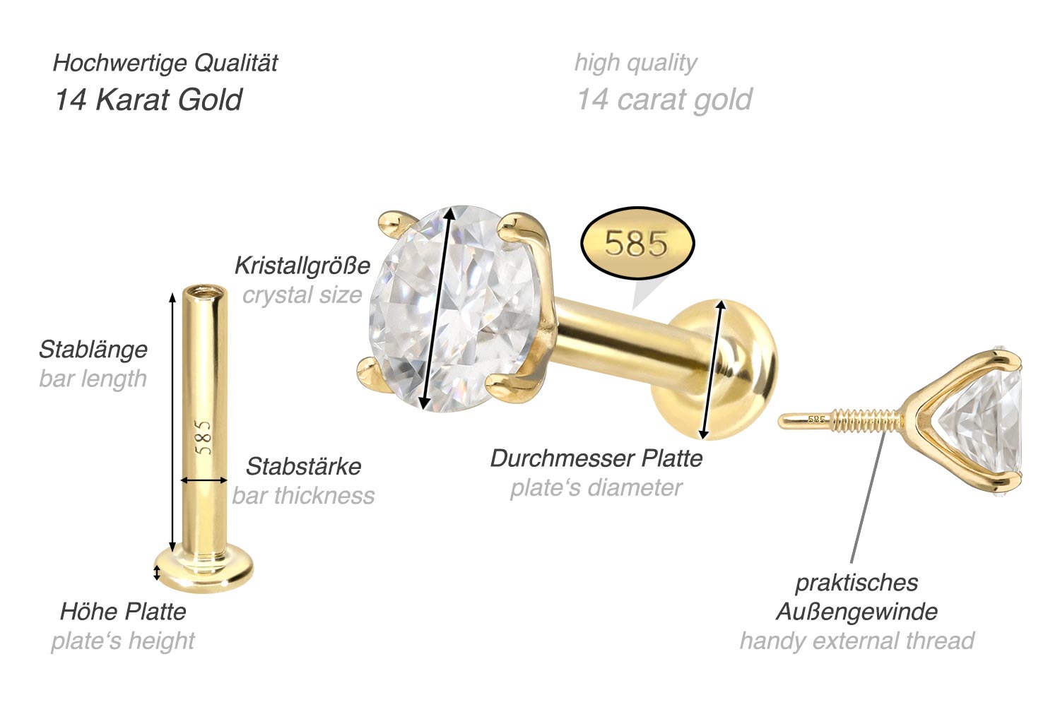 Except for the moissanite, this labret is made entirely of high quality 14 carat (585) gold, which in addition to its excellent quality also knows how to impress with properties such as good skin compatibility and high durability. Color-wise, it is available in yellow gold, rose gold and rhodium-plated white gold. The labret is supplied with a timelessly beautiful screw-in attachment with external thread, has a bar thickness of either 1 or 1.2 mm and is available with the bar lengths listed below. The moissanite gives the piece of jewellery its extraordinary, diamond-like shine. Each and every one of our gold items is handcrafted with great attention to detail, making it one of a kind. Since the 0.8 mm internal thread of the labret is compatible with all our gold products with this kind of external thread, there are various combination possibilities.