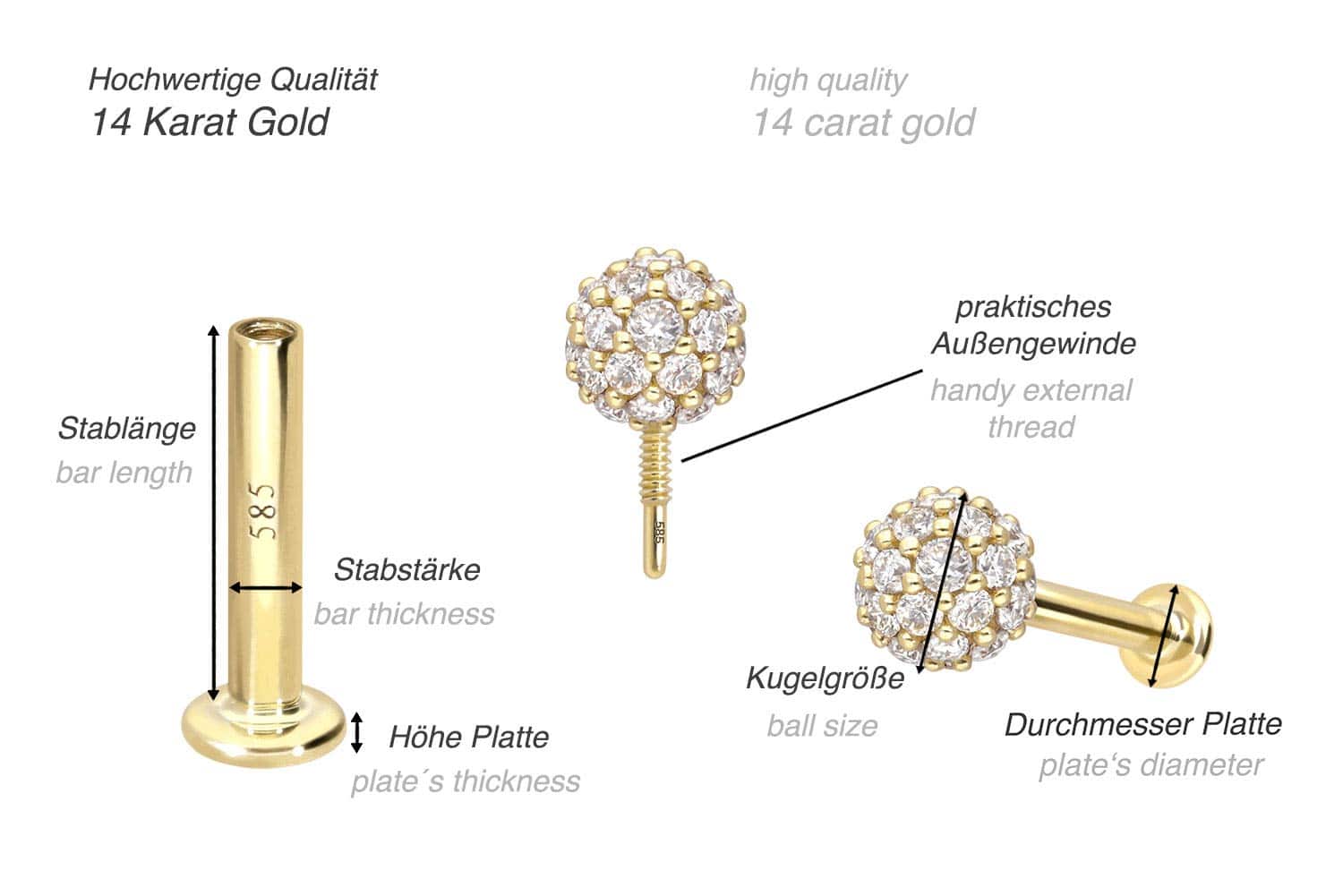 Except for the moissanites, this labret is made entirely of high quality 14 carat (585) gold, which in addition to its excellent quality also knows how to impress with properties such as good skin compatibility and high durability. Color-wise, it is available in yellow gold, rose gold and rhodium-plated white gold. The labret is supplied with a timelessly beautiful screw-in attachment with external thread, has a bar thickness of either 1 or 1.2 mm and is available with the bar lengths listed below. The moissanite gives the piece of jewellery its extraordinary, diamond-like shine. Each and every one of our gold items is handcrafted with great attention to detail, making it one of a kind. Since the 0.8 mm internal thread of the labret is compatible with all our gold products with this kind of external thread, there are various combination possibilities.