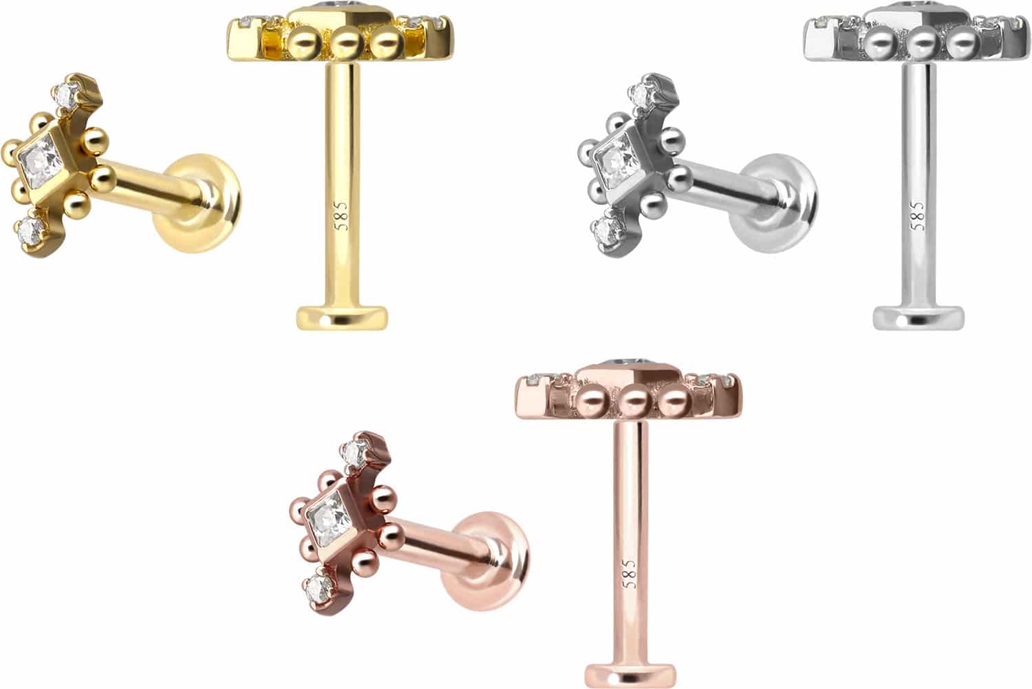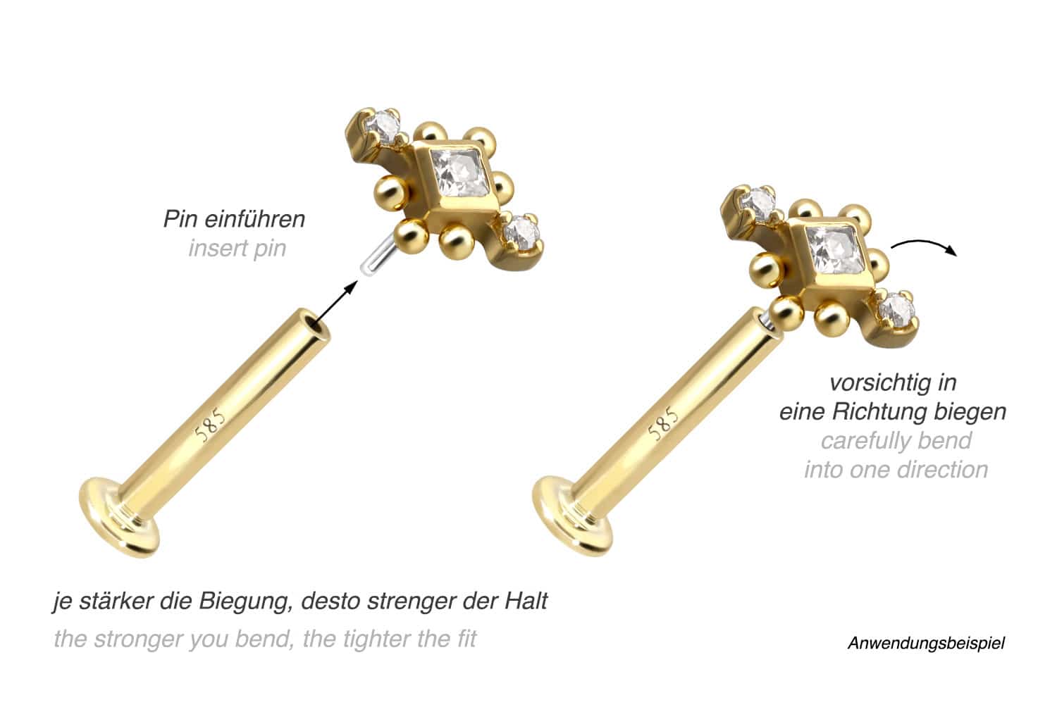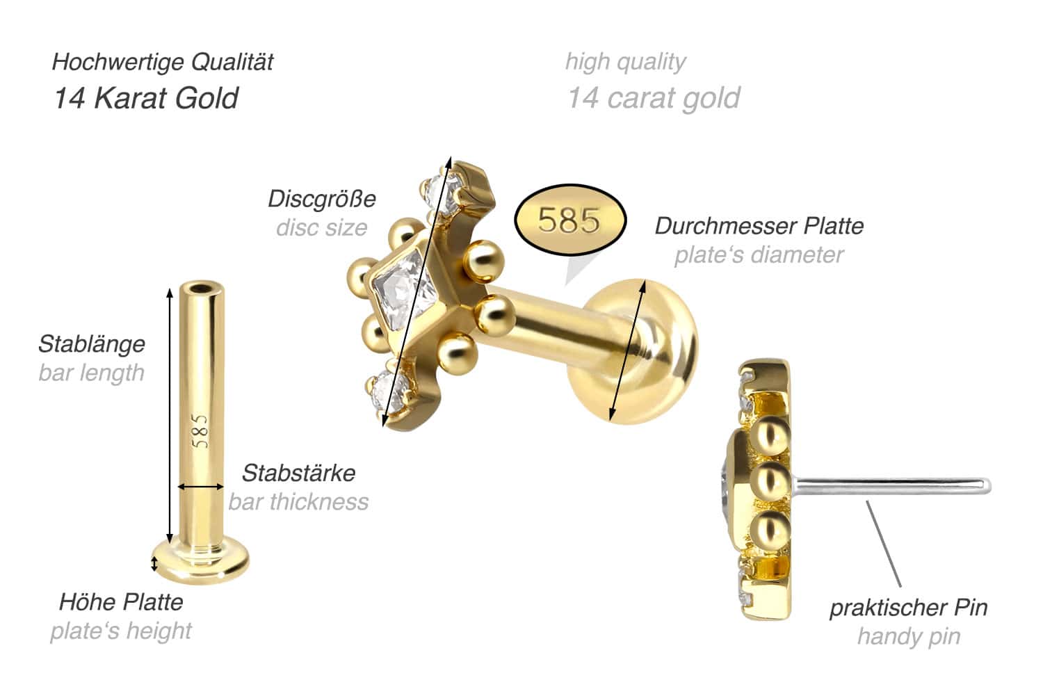 Except for the moissanites, this labret is made of high-quality 14 carat (585) gold, which, in addition to its excellent quality, also impresses with properties such as good skin compatibility and high durability. It is available in yellow gold, rose gold and rhodium-plated white gold. The labret is supplied with a timelessly beautiful attachment with titanium push pin, has a bar thickness of either 1 or 1.2 mm and is available in the bar lengths listed below. The moissanite gives the piece of jewellery its extraordinary, diamond-like shine. Every single one of our gold items is handcrafted with great attention to detail and is therefore unique. Thanks to the push fit technology used, the labret can be combined with any of our gold attachments with titanium push pin.