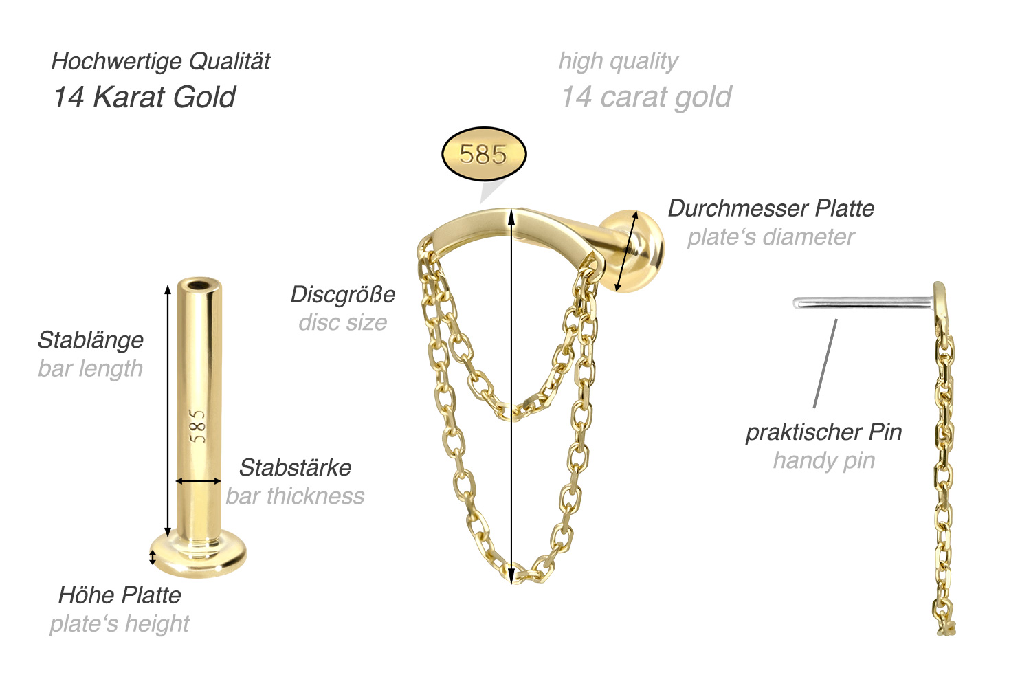 This labret is made of high-quality 14 carat (585) gold, which, in addition to its excellent quality, also impresses with properties such as good skin compatibility and high durability. It is available in yellow gold, rose gold and rhodium-plated white gold. The labret is supplied with a timelessly beautiful attachment with titanium push pin in form of an arch, to which two chains are attached, has a bar thickness of either 1 or 1.2 mm and is available in the bar lengths listed below. Every single one of our gold items is handcrafted with great attention to detail and is therefore unique. Thanks to the push fit technology used, the labret can be combined with any of our gold attachments with titanium push pin.