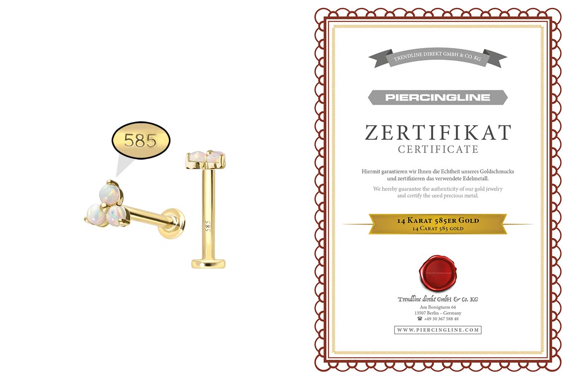 Except for the synthetic opals, this labret is made of high-quality 14 carat (585) gold, which, in addition to its excellent quality, also impresses with properties such as good skin compatibility and high durability. It is available in yellow gold, rose gold and rhodium-plated white gold. The labret is supplied with a timelessly beautiful attachment with titanium push pin in form of a flower, has a bar thickness of either 1 or 1.2 mm and is available in the bar lengths listed below. Every single one of our gold items is handcrafted with great attention to detail and is therefore unique. Thanks to the push fit technology used, the labret can be combined with any of our gold attachments with titanium push pin.