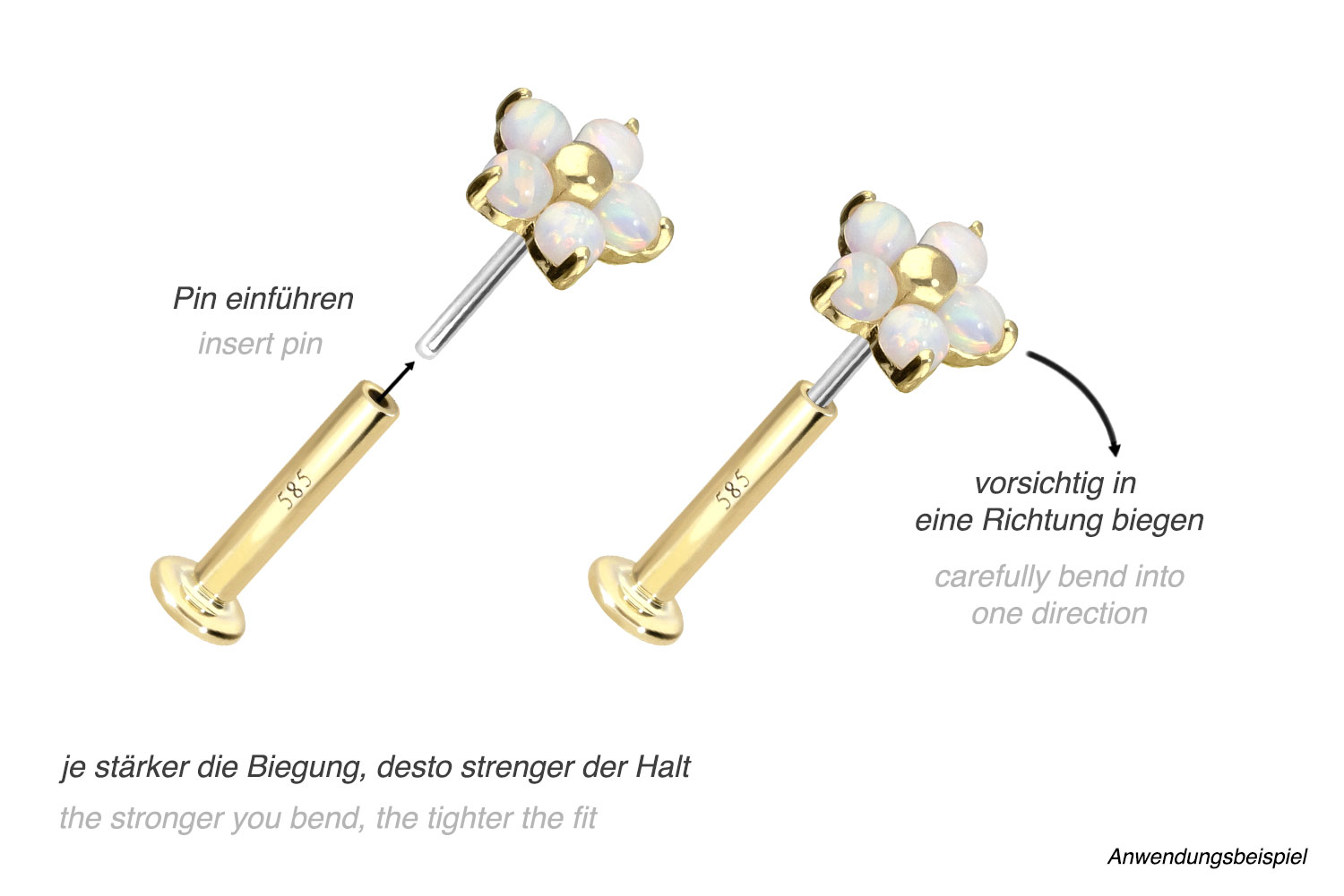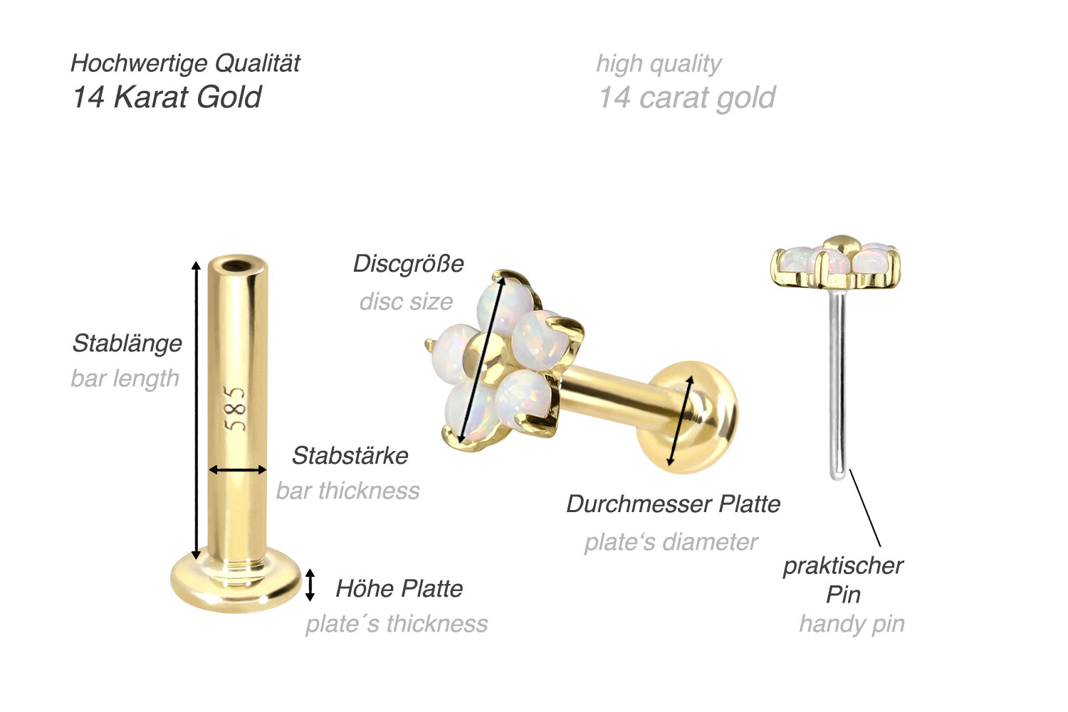 Except for the synthetic opals, this labret is made of high-quality 14 carat (585) gold, which, in addition to its excellent quality, also impresses with properties such as good skin compatibility and high durability. It is available in yellow gold, rose gold and rhodium-plated white gold. The labret is supplied with a timelessly beautiful attachment with titanium push pin in form of a flower, has a bar thickness of either 1 or 1.2 mm and is available in the bar lengths listed below. Every single one of our gold items is handcrafted with great attention to detail and is therefore unique. Thanks to the push fit technology used, the labret can be combined with any of our gold attachments with titanium push pin.