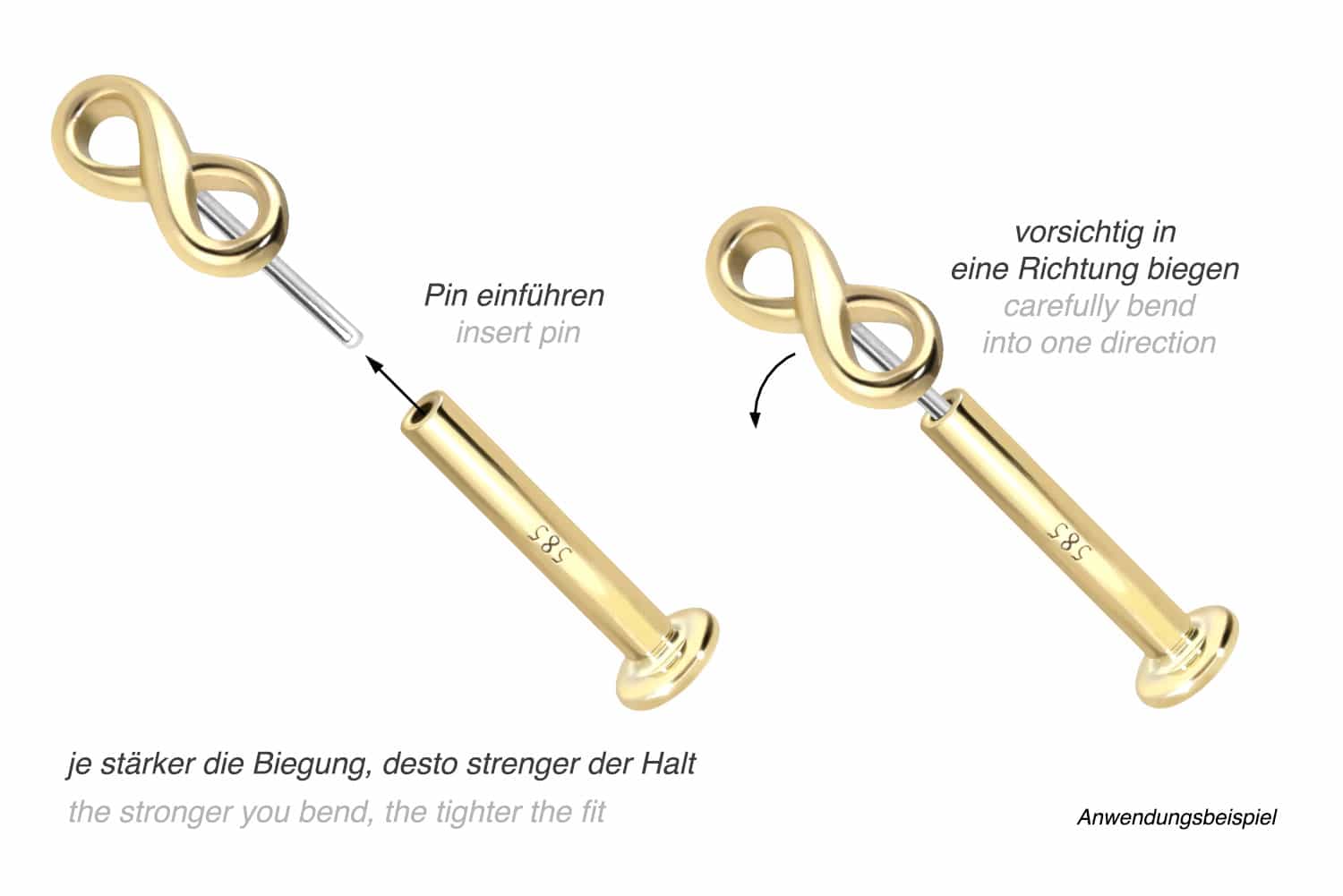 This labret is made of high-quality 14 carat (585) gold, which, in addition to its excellent quality, also impresses with properties such as good skin compatibility and high durability. It is available in yellow gold, rose gold and rhodium-plated white gold. The labret is supplied with a timelessly beautiful attachment with titanium push pin in form of a infinity sign , has a bar thickness of either 1 or 1.2 mm and is available in the bar lengths listed below. Every single one of our gold items is handcrafted with great attention to detail and is therefore unique. Thanks to the push fit technology used, the labret can be combined with any of our gold attachments with titanium push pin.