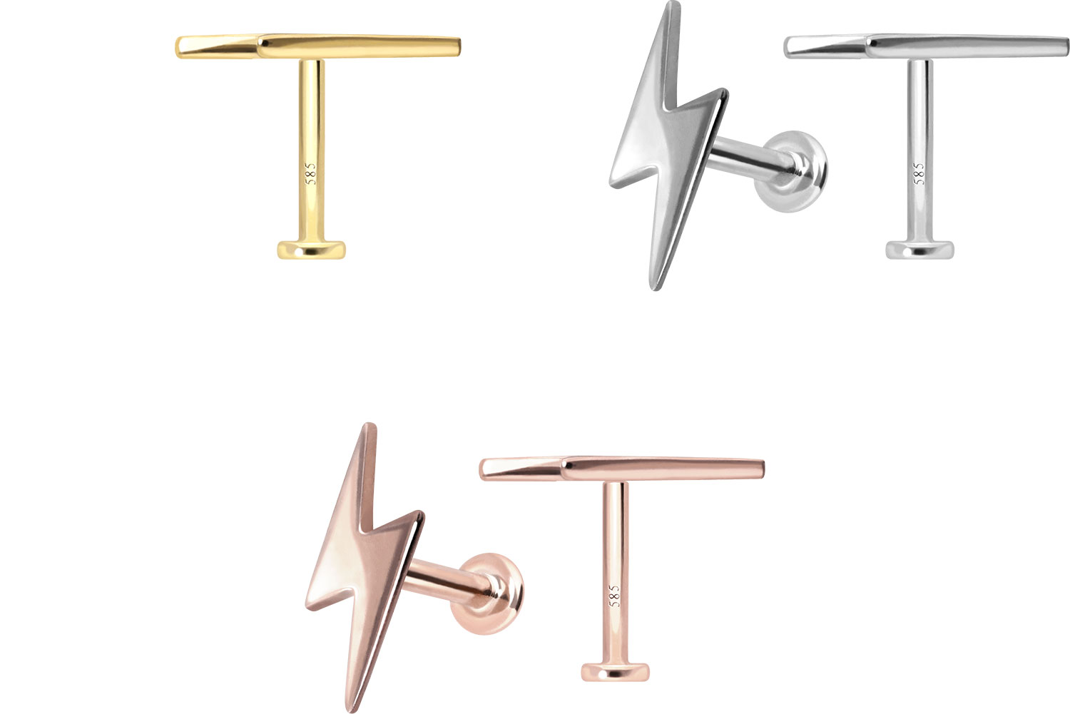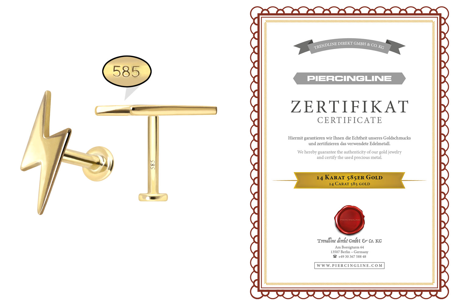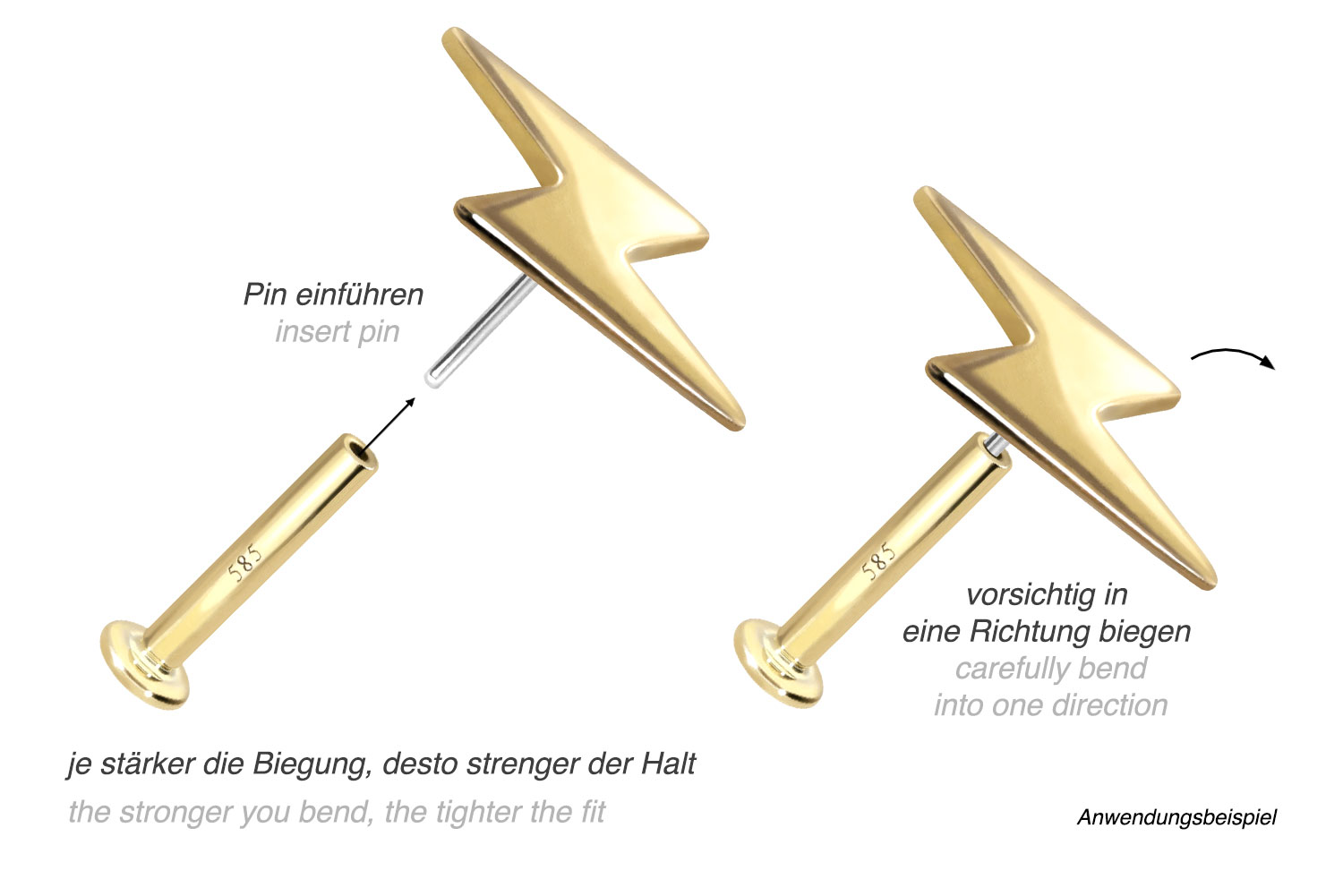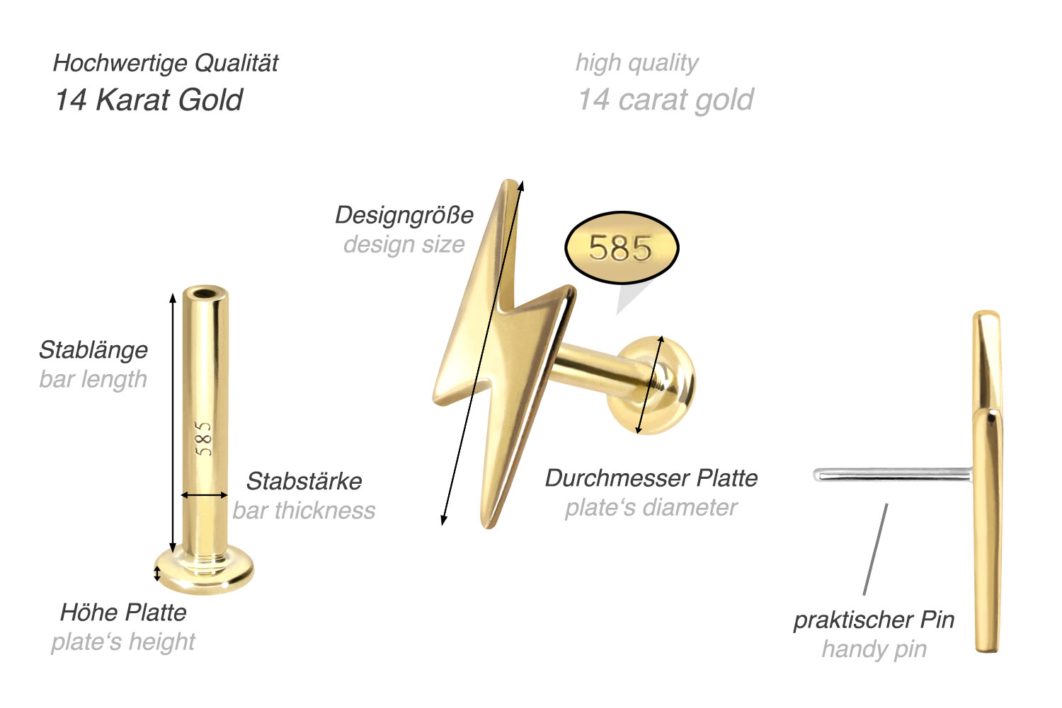 This labret is made of high-quality 14 carat (585) gold, which, in addition to its excellent quality, also impresses with properties such as good skin compatibility and high durability. It is available in yellow gold, rose gold and rhodium-plated white gold. The labret is supplied with a timelessly beautiful attachment with titanium push pin in form of a lightning, has a bar thickness of either 1 or 1.2 mm and is available in the bar lengths listed below. Every single one of our gold items is handcrafted with great attention to detail and is therefore unique. Thanks to the push fit technology used, the labret can be combined with any of our gold attachments with titanium push pin.