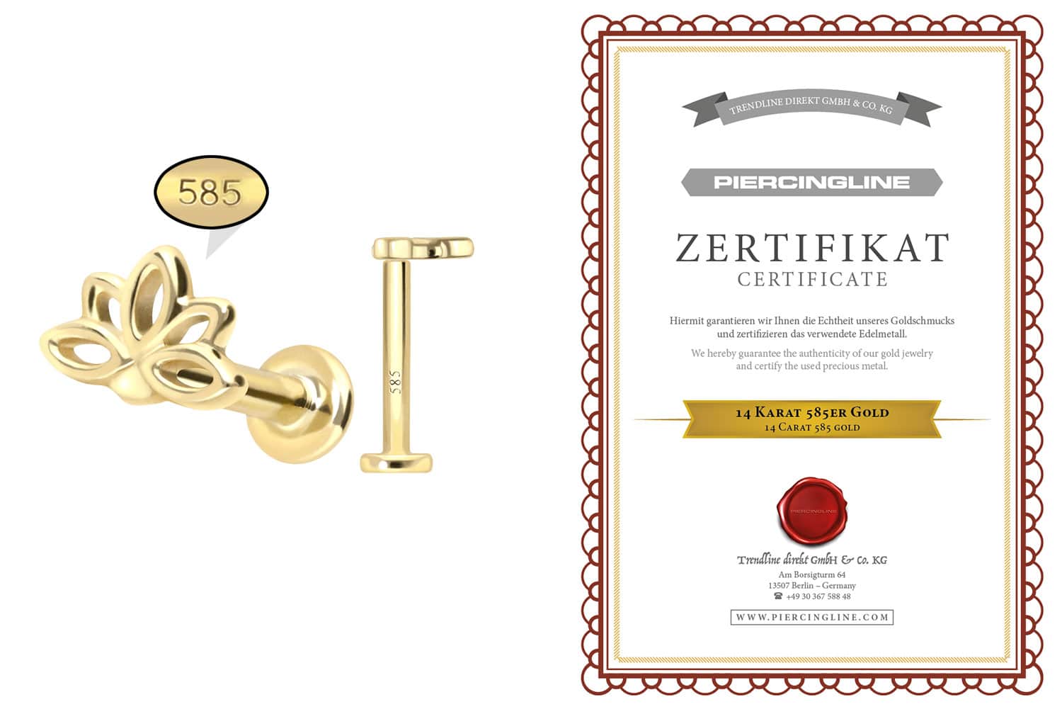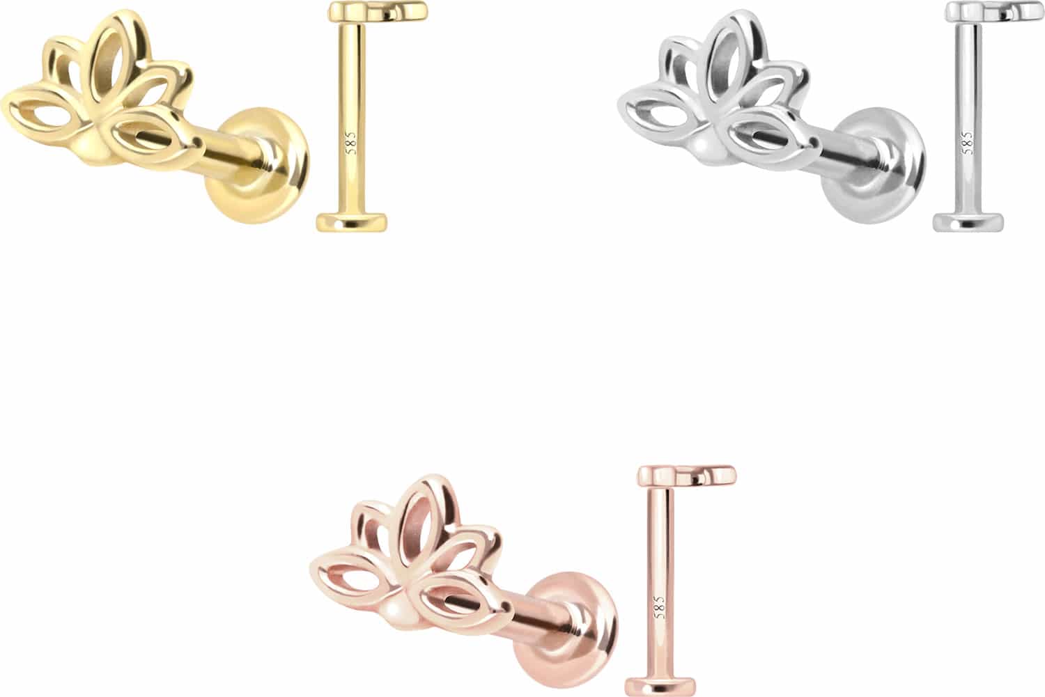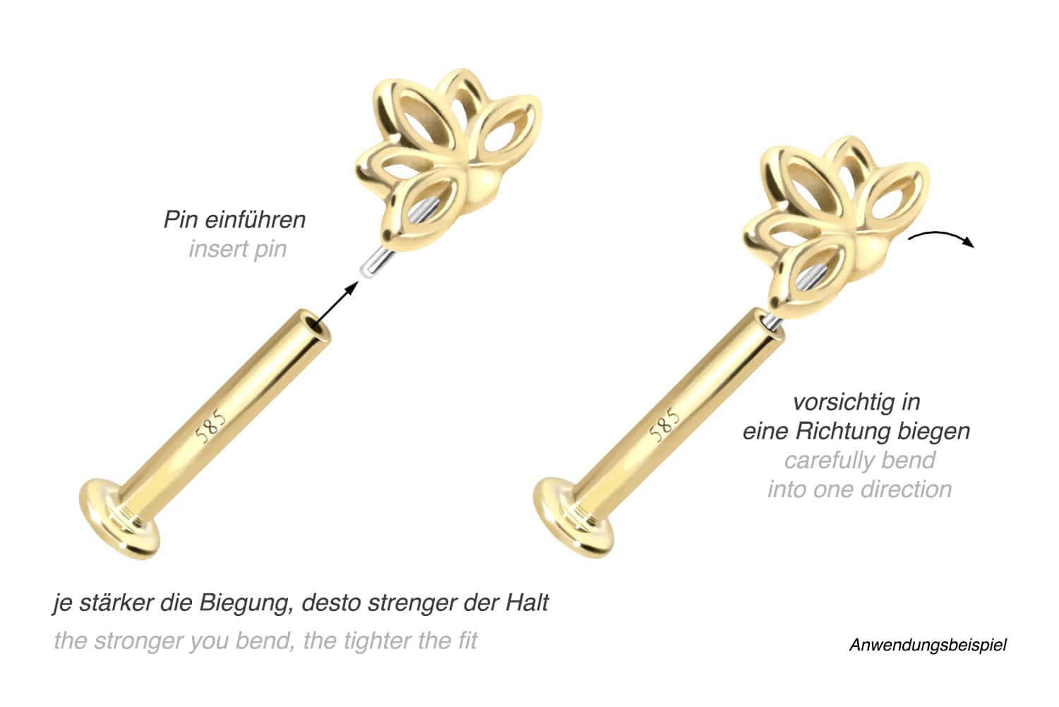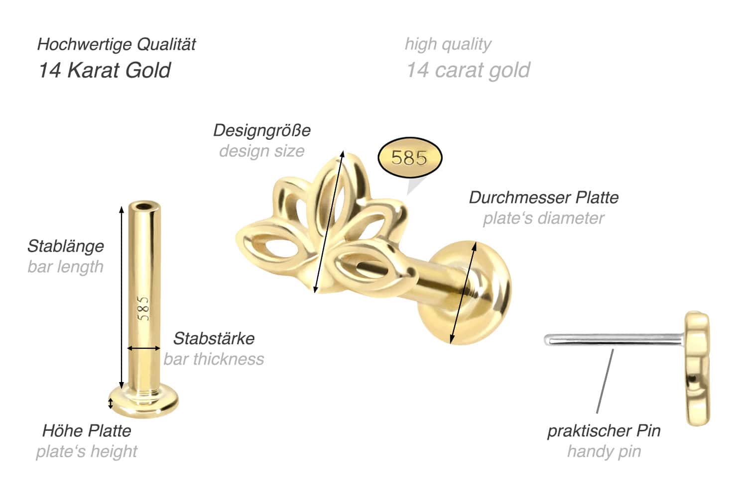 This labret is made of high-quality 14 carat (585) gold, which, in addition to its excellent quality, also impresses with properties such as good skin compatibility and high durability. It is available in yellow gold, rose gold and rhodium-plated white gold. The labret is supplied with a timelessly beautiful attachment with titanium push pin in form of a lotus blossom, has a bar thickness of either 1 or 1.2 mm and is available in the bar lengths listed below. Every single one of our gold items is handcrafted with great attention to detail and is therefore unique. Thanks to the push fit technology used, the labret can be combined with any of our gold attachments with titanium push pin.