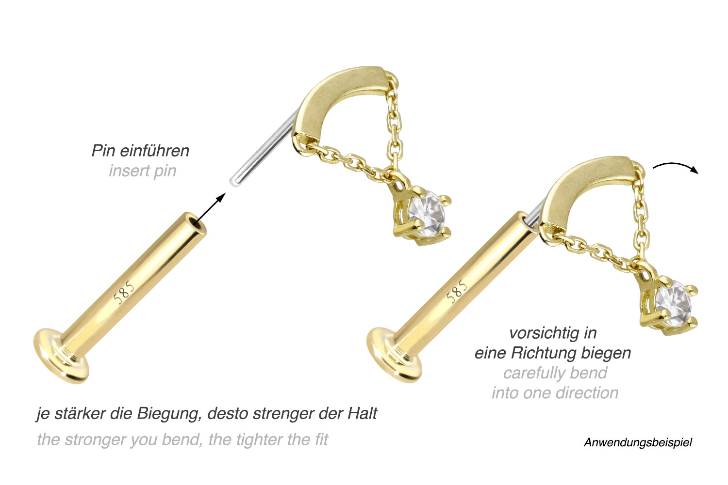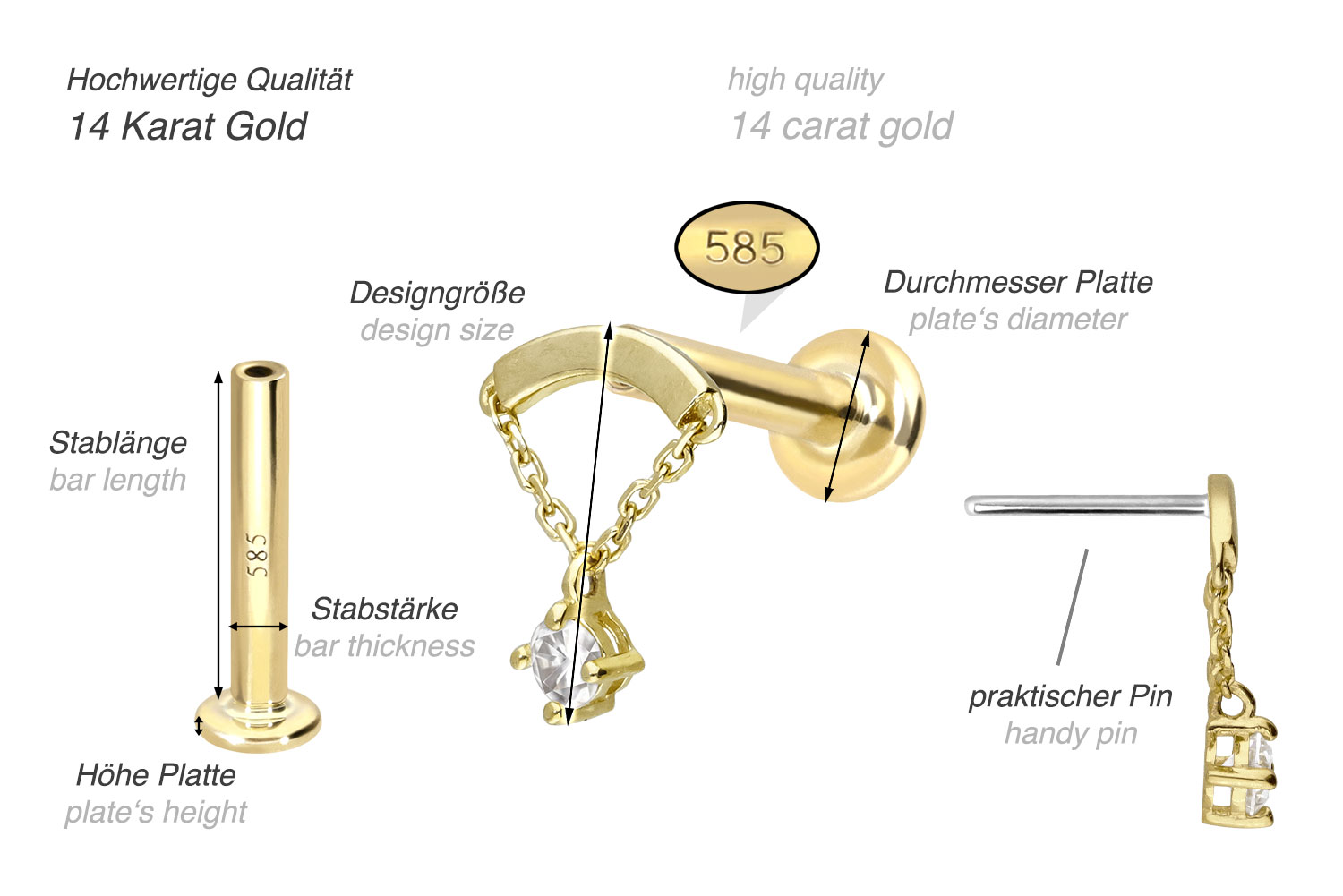 Except for the moissanite, this labret is made of high-quality 14 carat (585) gold, which, in addition to its excellent quality, also impresses with properties such as good skin compatibility and high durability. It is available in yellow gold, rose gold and rhodium-plated white gold. The labret is supplied with a timelessly beautiful attachment with titanium push pin in form of an arch, to which a chain and a moissanite are attached, has a bar thickness of either 1 or 1.2 mm and is available in the bar lengths listed below. The moissanite gives the piece of jewellery its extraordinary, diamond-like shine. Every single one of our gold items is handcrafted with great attention to detail and is therefore unique. Thanks to the push fit technology used, the labret can be combined with any of our gold attachments with titanium push pin.