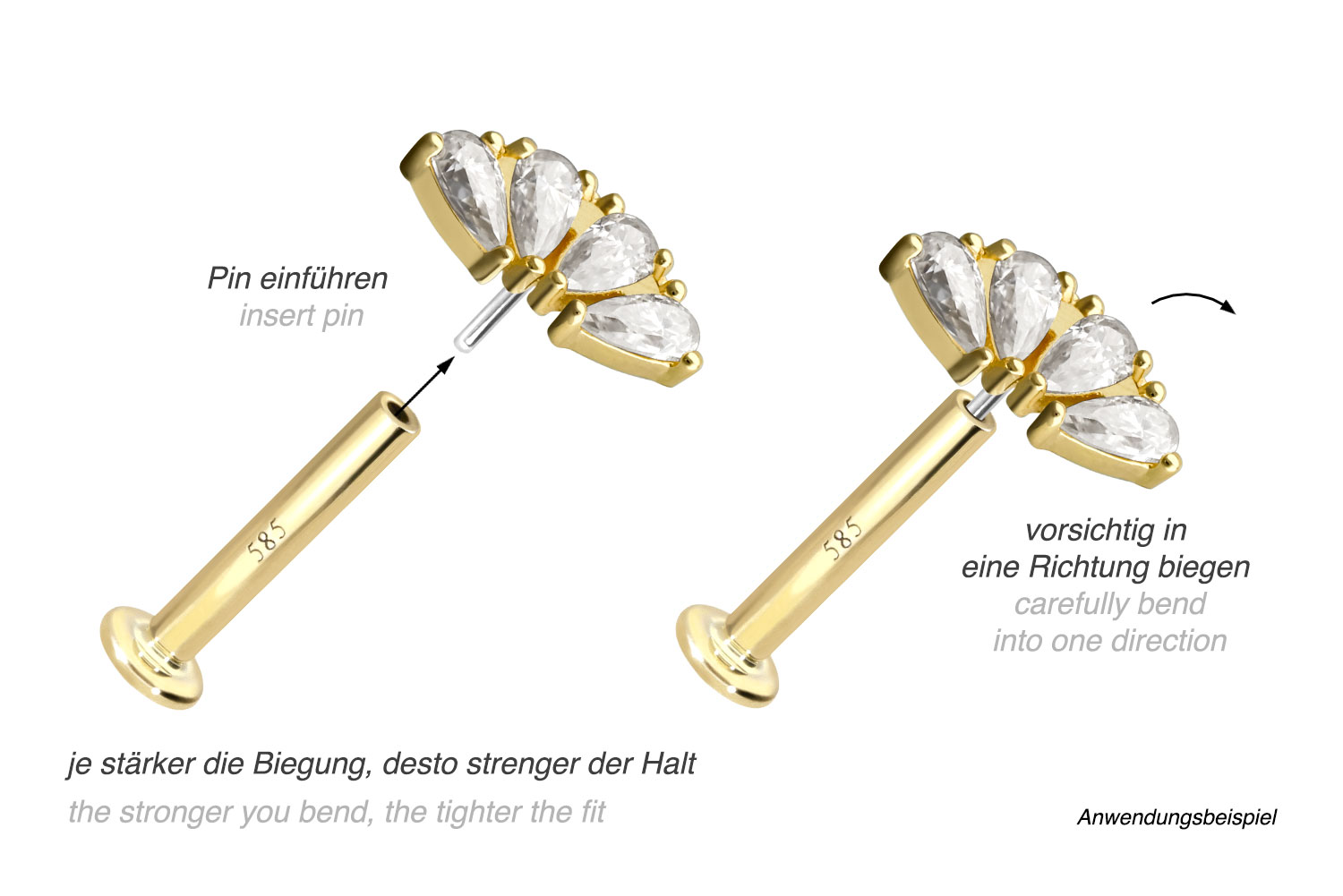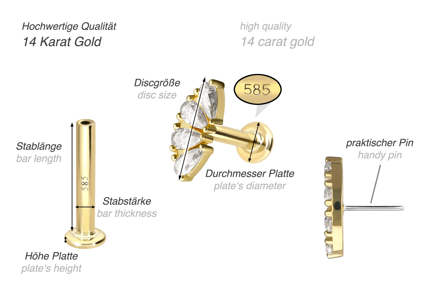 Except for the moissanites, this labret is made of high-quality 14 carat (585) gold, which, in addition to its excellent quality, also impresses with properties such as good skin compatibility and high durability. It is available in yellow gold, rose gold and rhodium-plated white gold. The labret is supplied with a timelessly beautiful attachment with titanium push pin in form of an arch, has a bar thickness of either 1 or 1.2 mm and is available in the bar lengths listed below. The moissanite gives the piece of jewellery its extraordinary, diamond-like shine. Every single one of our gold items is handcrafted with great attention to detail and is therefore unique. Thanks to the push fit technology used, the labret can be combined with any of our gold attachments with titanium push pin.