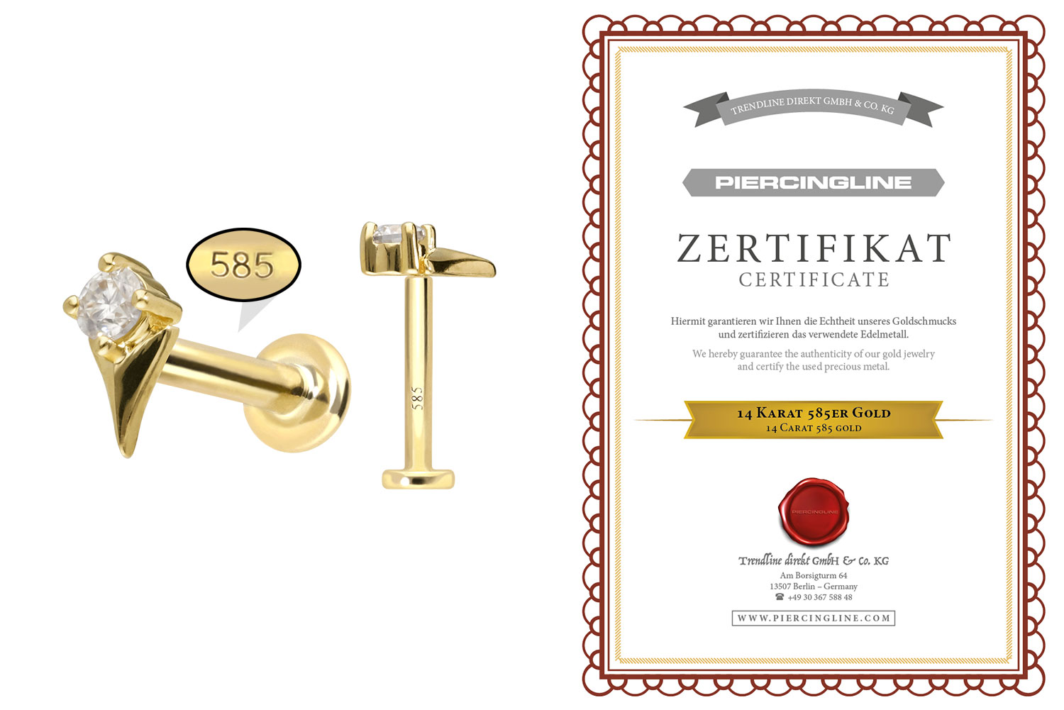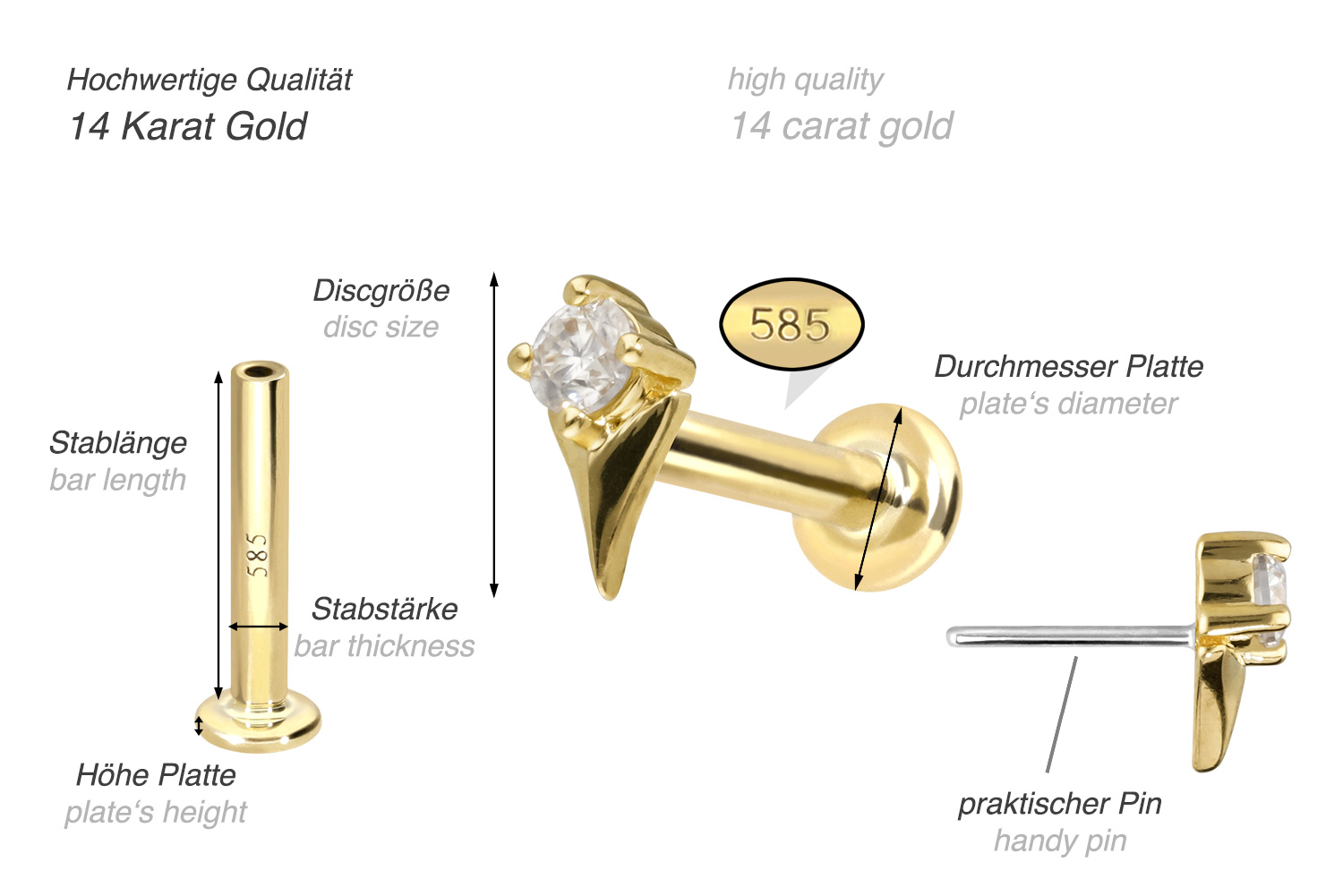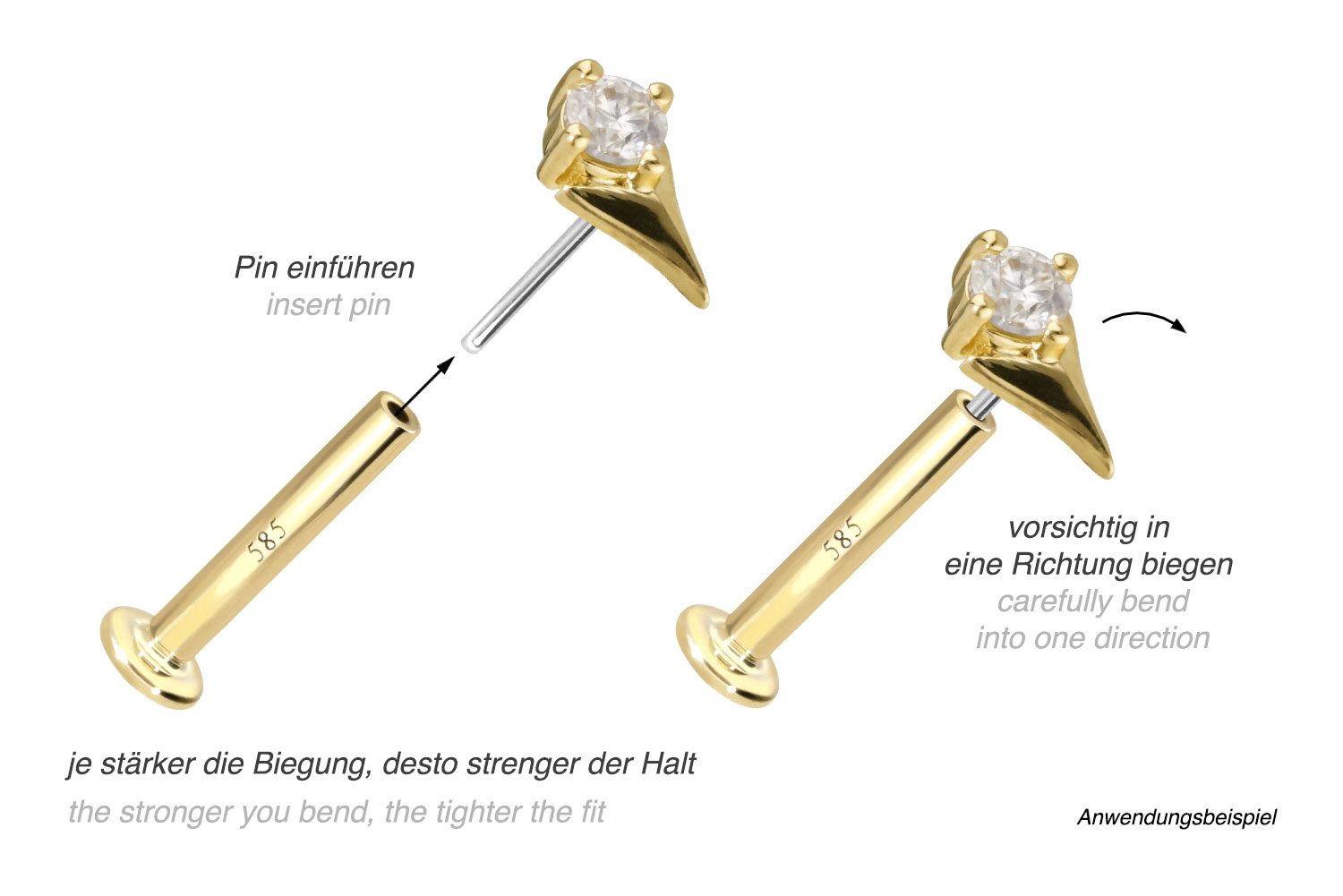 Except for the moissanite, this labret is made of high-quality 14 carat (585) gold, which, in addition to its excellent quality, also impresses with properties such as good skin compatibility and high durability. It is available in yellow gold, rose gold and rhodium-plated white gold. The labret is supplied with a timelessly beautiful attachment with titanium push pin in form of an arrowhead, has a bar thickness of either 1 or 1.2 mm and is available in the bar lengths listed below. The moissanite gives the piece of jewellery its extraordinary, diamond-like shine. Every single one of our gold items is handcrafted with great attention to detail and is therefore unique. Thanks to the push fit technology used, the labret can be combined with any of our gold attachments with titanium push pin.