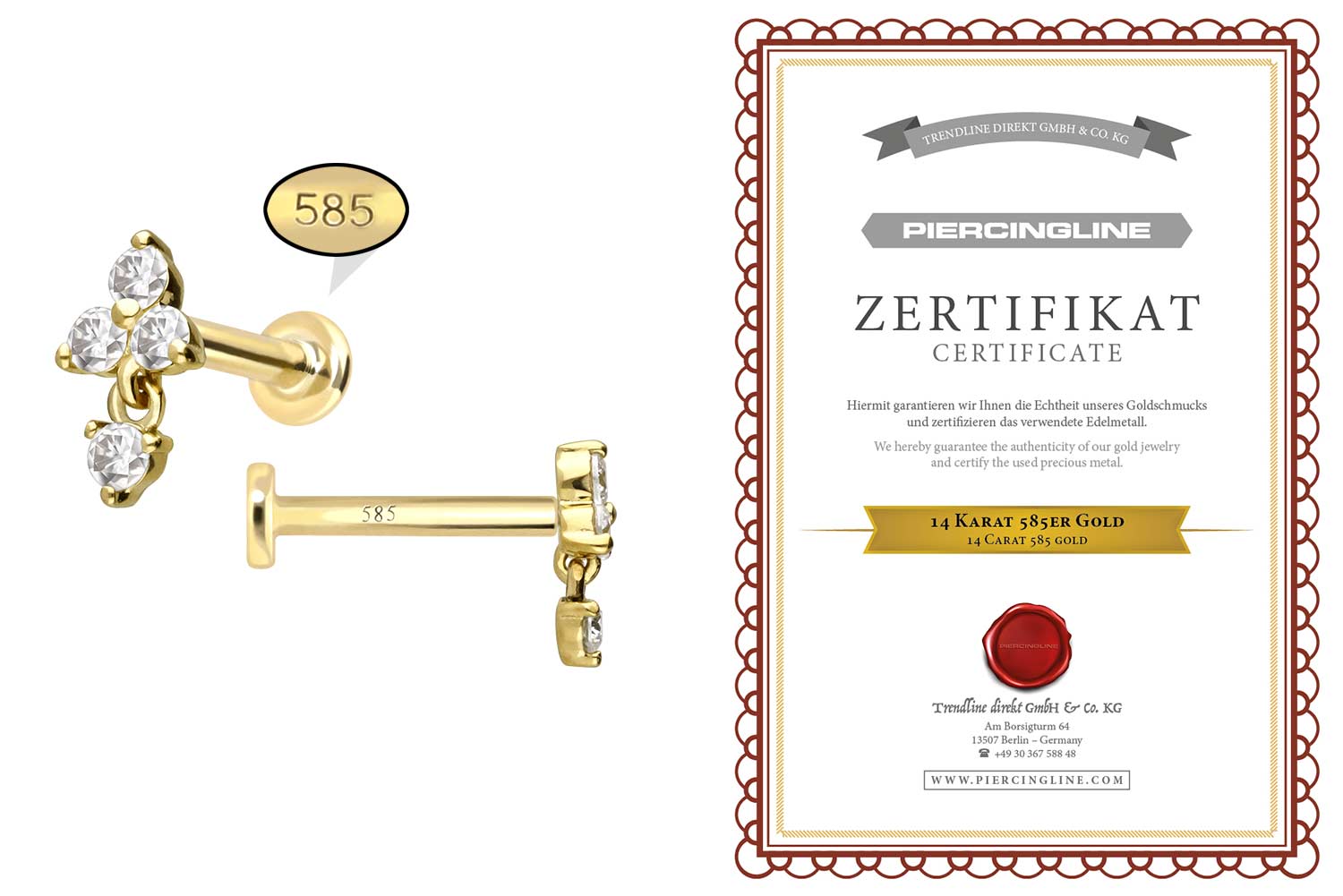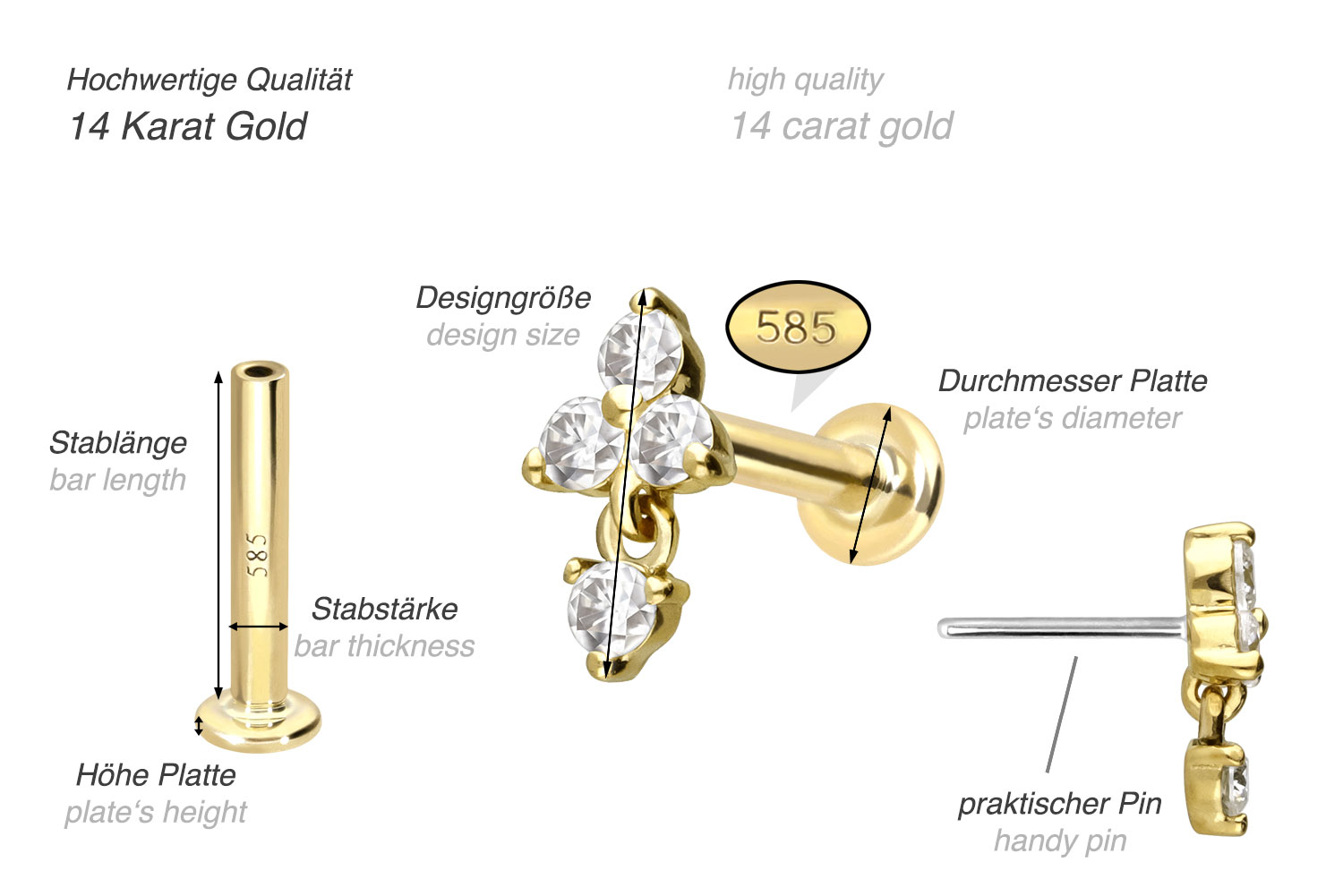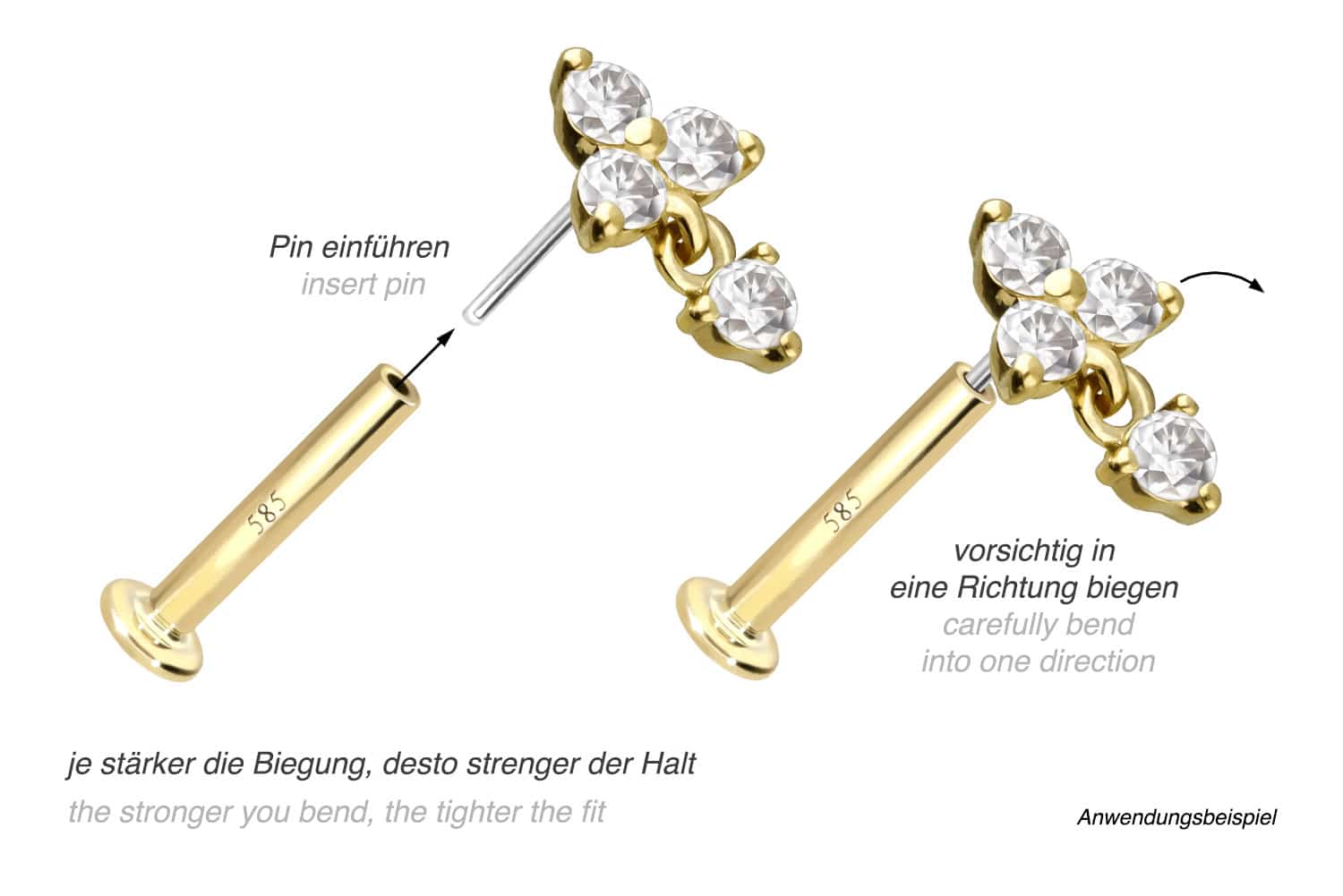Except for the moissanites, this labret is made of high-quality 14 carat (585) gold, which, in addition to its excellent quality, also impresses with properties such as good skin compatibility and high durability. It is available in yellow gold, rose gold and rhodium-plated white gold. The labret is supplied with a timelessly beautiful attachment with titanium push pin in form of a flower, has a bar thickness of either 1 or 1.2 mm and is available in the bar lengths listed below. The moissanite gives the piece of jewellery its extraordinary, diamond-like shine. Every single one of our gold items is handcrafted with great attention to detail and is therefore unique. Thanks to the push fit technology used, the labret can be combined with any of our gold attachments with titanium push pin.