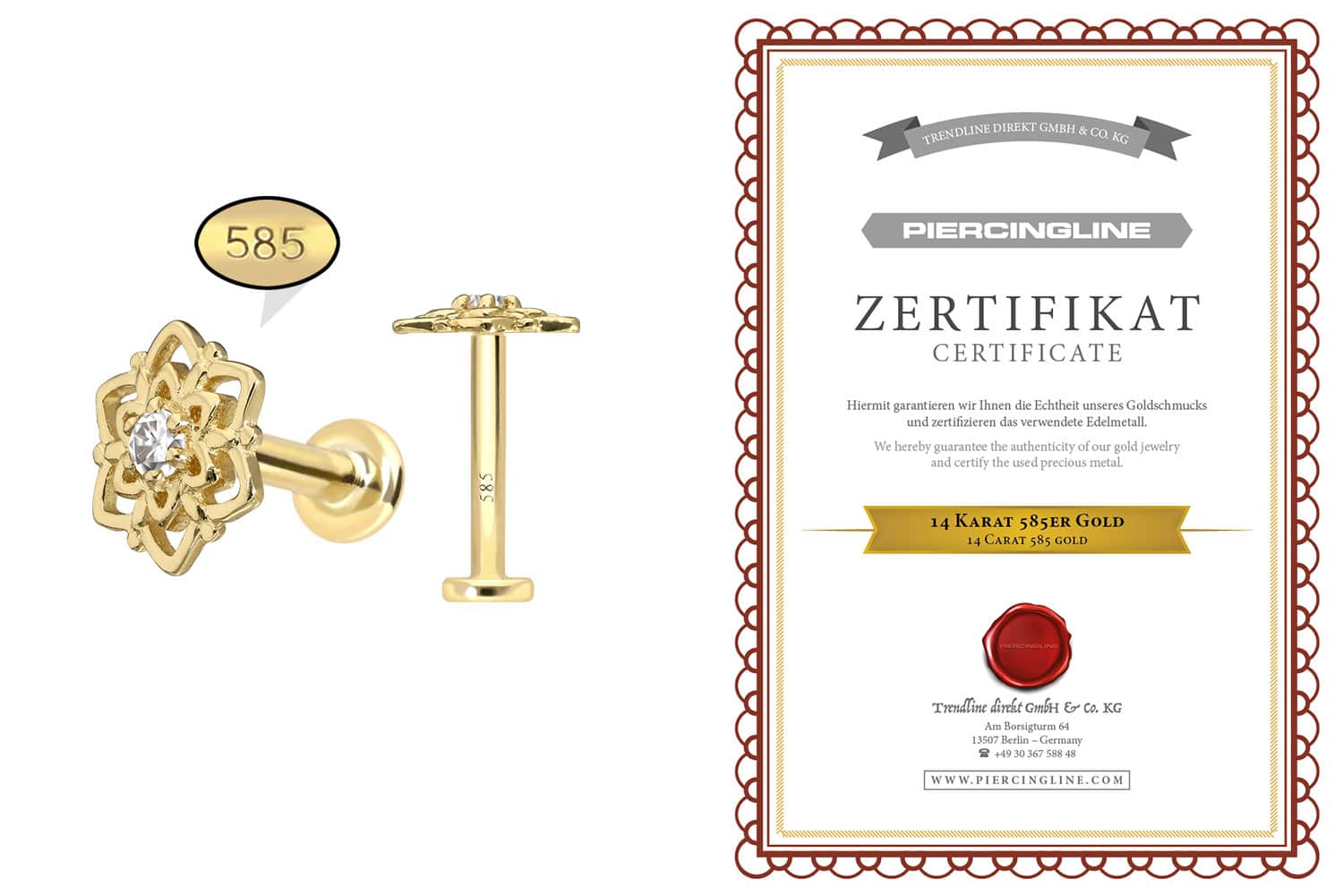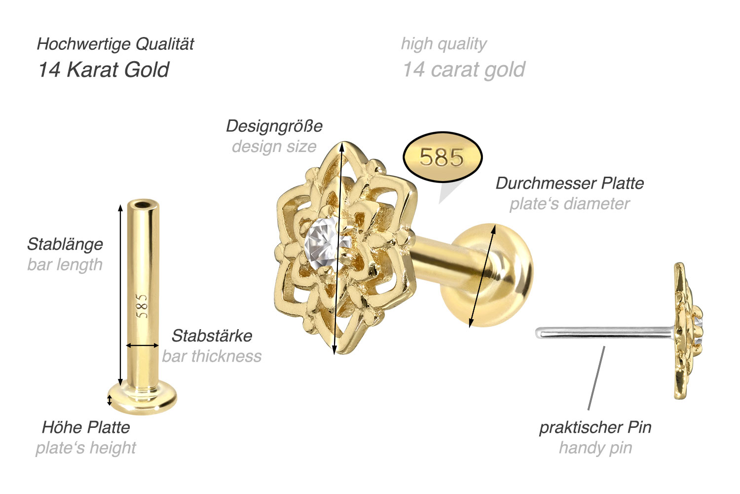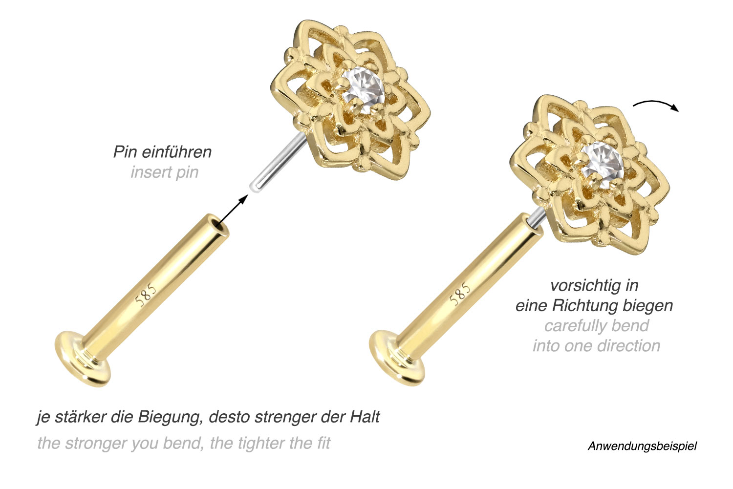 Except for the moissanite, this labret is made of high-quality 14 carat (585) gold, which, in addition to its excellent quality, also impresses with properties such as good skin compatibility and high durability. It is available in yellow gold, rose gold and rhodium-plated white gold. The labret is supplied with a timelessly beautiful attachment with titanium push pin in form of a flower, has a bar thickness of either 1 or 1.2 mm and is available in the bar lengths listed below. The moissanite gives the piece of jewellery its extraordinary, diamond-like shine. Every single one of our gold items is handcrafted with great attention to detail and is therefore unique. Thanks to the push fit technology used, the labret can be combined with any of our gold attachments with titanium push pin.