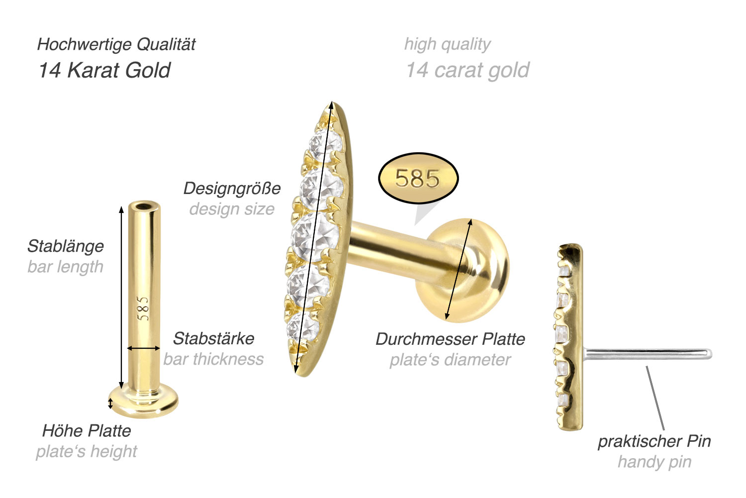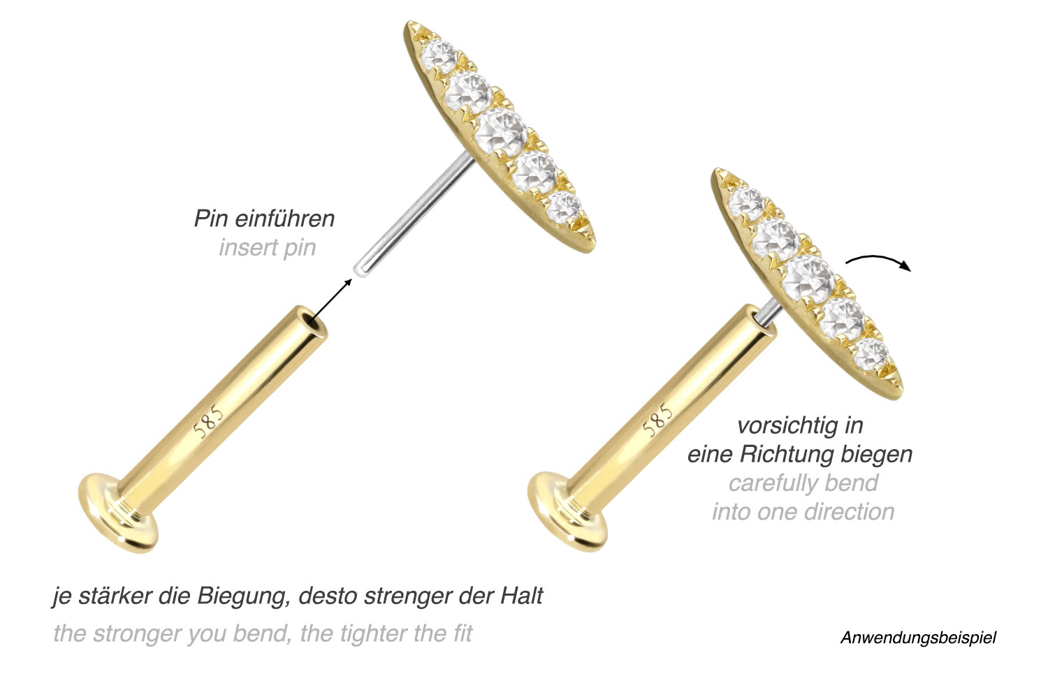 Except for the moissanites, this labret is made of high-quality 14 carat (585) gold, which, in addition to its excellent quality, also impresses with properties such as good skin compatibility and high durability. It is available in yellow gold, rose gold and rhodium-plated white gold. The labret is supplied with a timelessly beautiful attachment with titanium push pin in form of an Oval, has a bar thickness of either 1 or 1.2 mm and is available in the bar lengths listed below. The moissanite gives the piece of jewellery its extraordinary, diamond-like shine. Every single one of our gold items is handcrafted with great attention to detail and is therefore unique. Thanks to the push fit technology used, the labret can be combined with any of our gold attachments with titanium push pin.