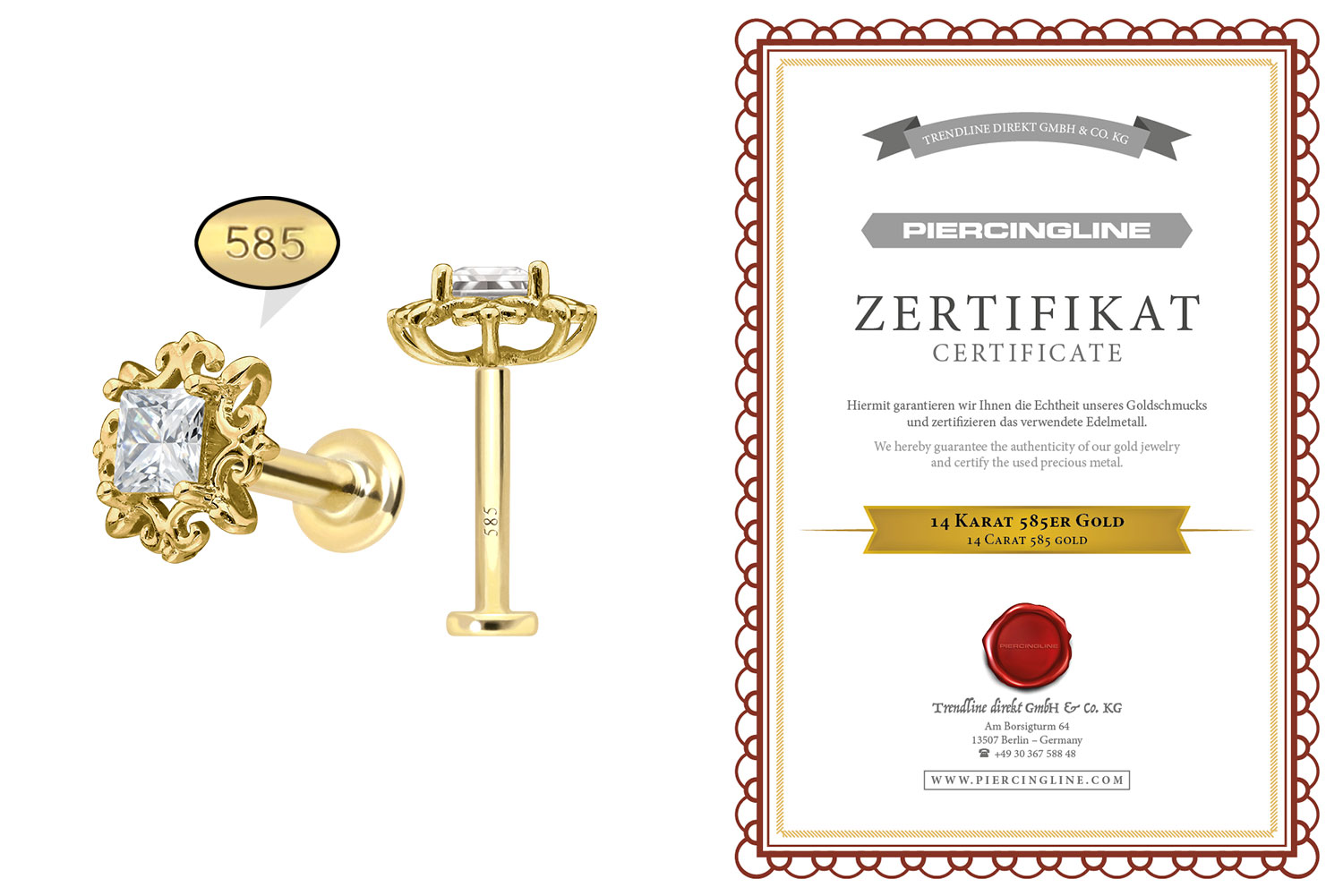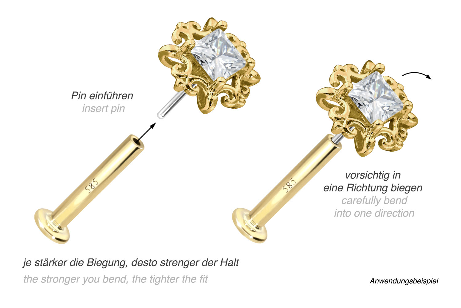 Except for the moissanite, this labret is made of high-quality 14 carat (585) gold, which, in addition to its excellent quality, also impresses with properties such as good skin compatibility and high durability. It is available in yellow gold, rose gold and rhodium-plated white gold. The labret is supplied with a timelessly beautiful attachment with titanium push pin in form of a square, has a bar thickness of either 1 or 1.2 mm and is available in the bar lengths listed below. The moissanite gives the piece of jewellery its extraordinary, diamond-like shine. Every single one of our gold items is handcrafted with great attention to detail and is therefore unique. Thanks to the push fit technology used, the labret can be combined with any of our gold attachments with titanium push pin.