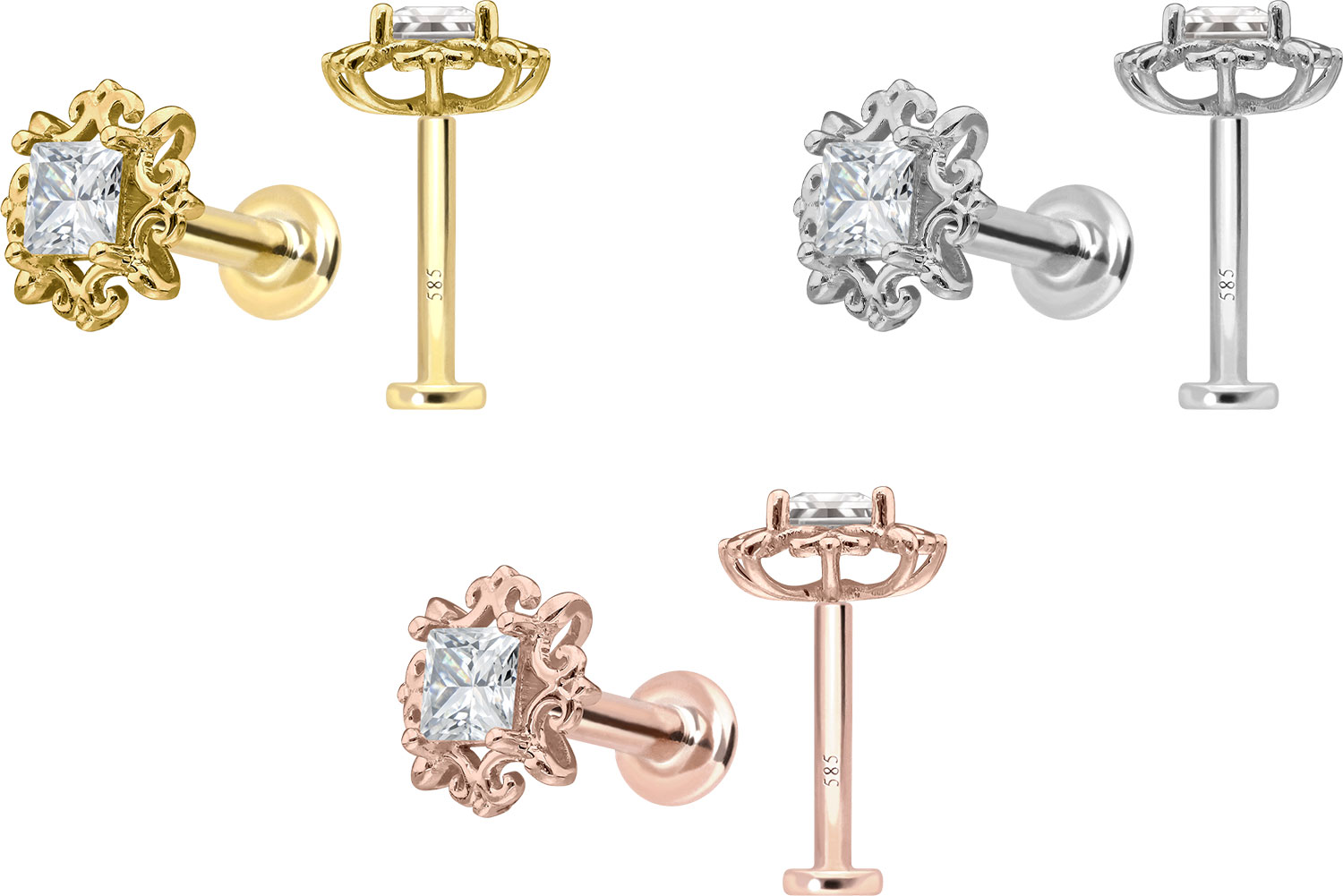 14 Carat Gold - Labret with Push Fit Moissanite Square + Ornaments
