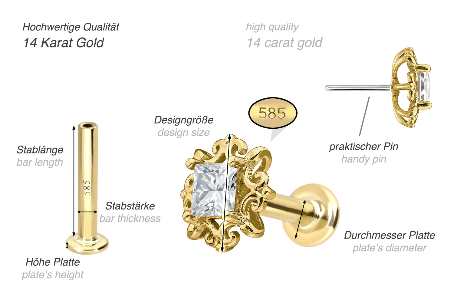 14 carat gold labret with push fit MOISSANITE SQUARE + ORNAMENTS