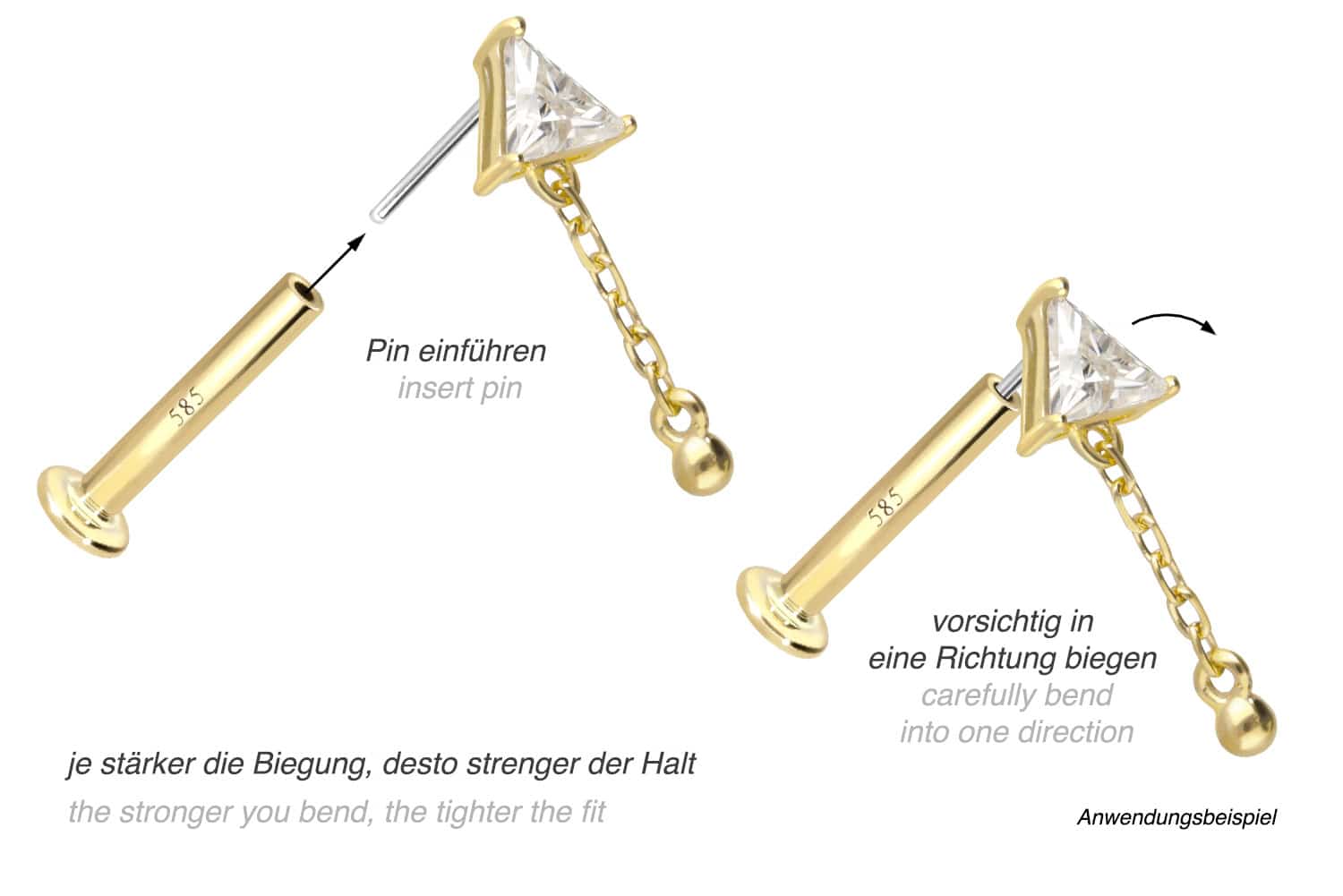 Except for the moissanite, this labret is made of high-quality 14 carat (585) gold, which, in addition to its excellent quality, also impresses with properties such as good skin compatibility and high durability. It is available in yellow gold, rose gold and rhodium-plated white gold. The labret is supplied with a timelessly beautiful attachment with titanium push pin in form of a triangle, to which a chain is attached, has a bar thickness of either 1 or 1.2 mm and is available in the bar lengths listed below. The moissanite gives the piece of jewellery its extraordinary, diamond-like shine. Every single one of our gold items is handcrafted with great attention to detail and is therefore unique. Thanks to the push fit technology used, the labret can be combined with any of our gold attachments with titanium push pin.