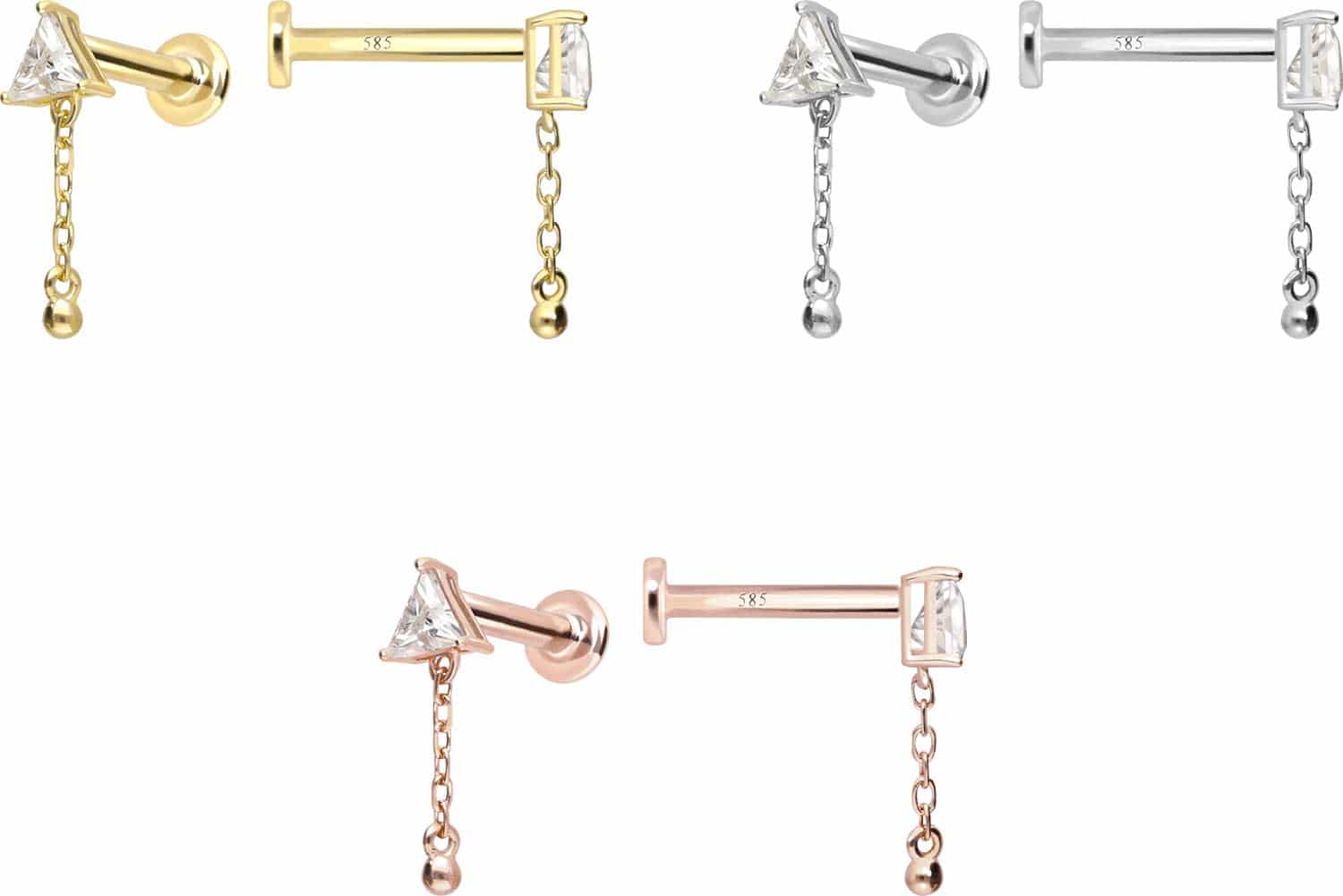14 carat gold labret with push fit MOISSANITE TRIANGLE + CHAIN
