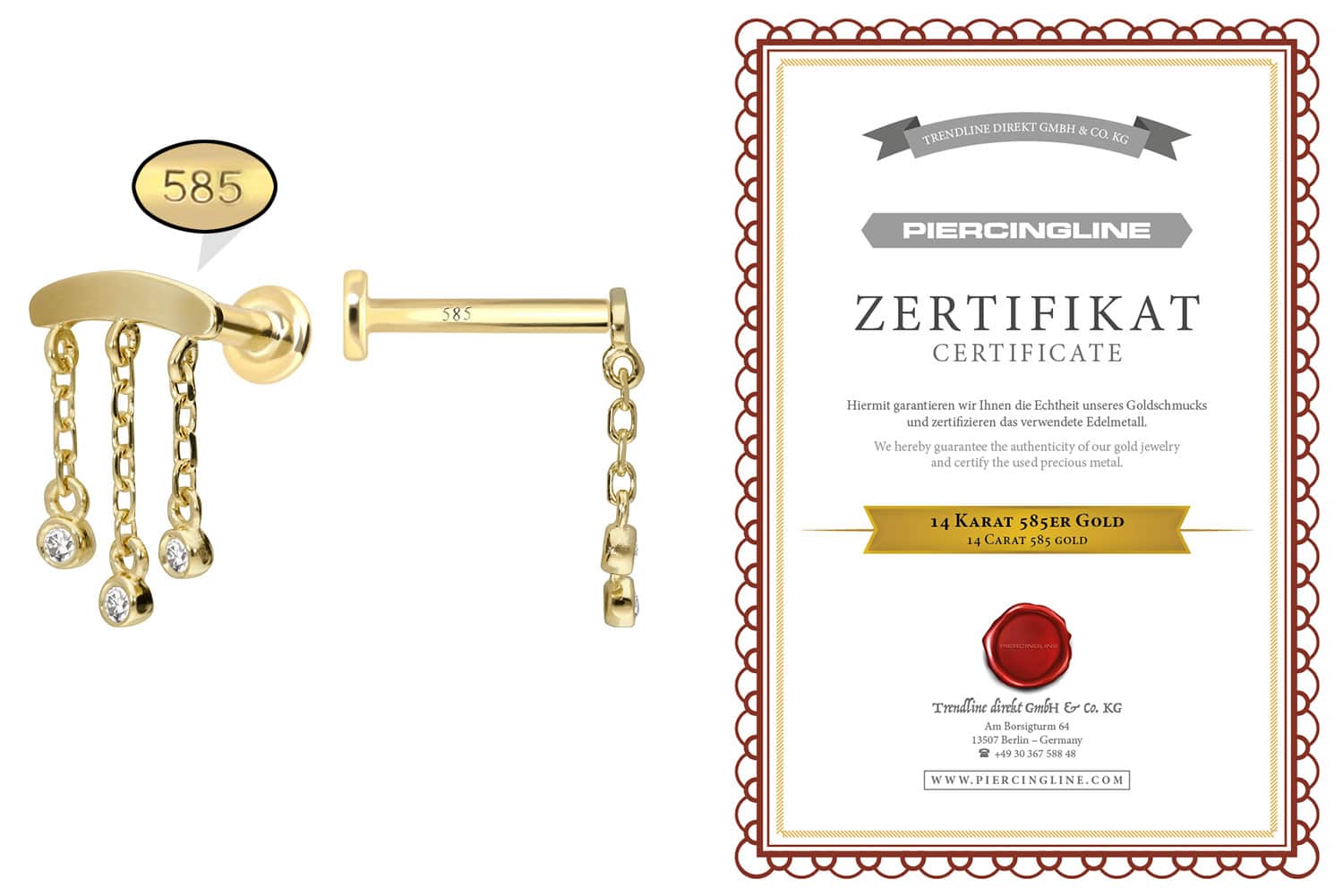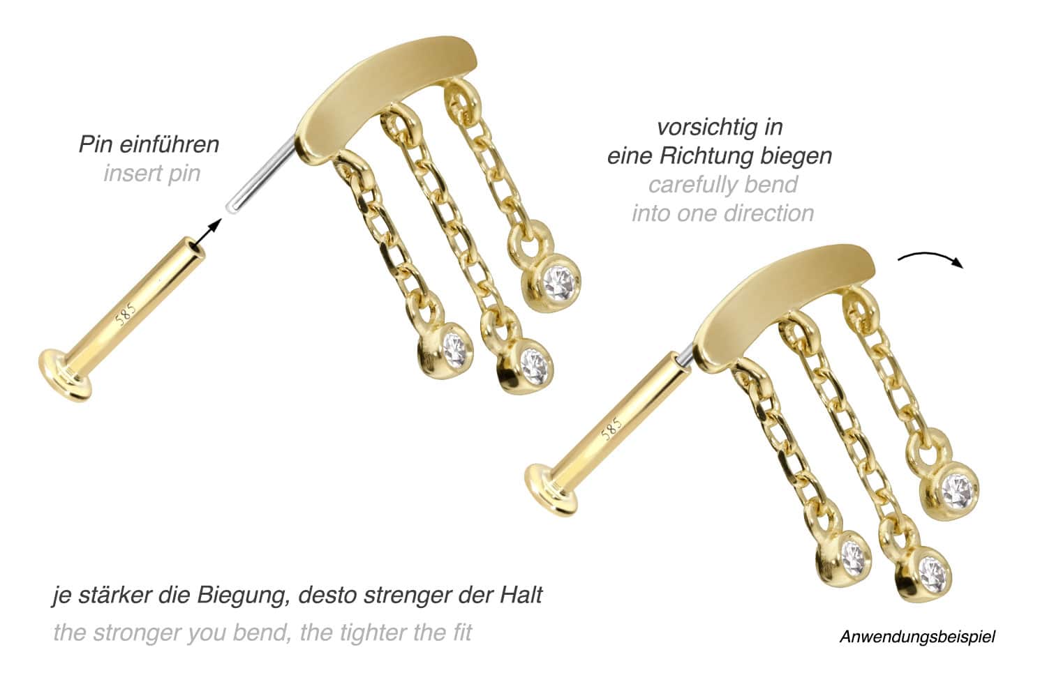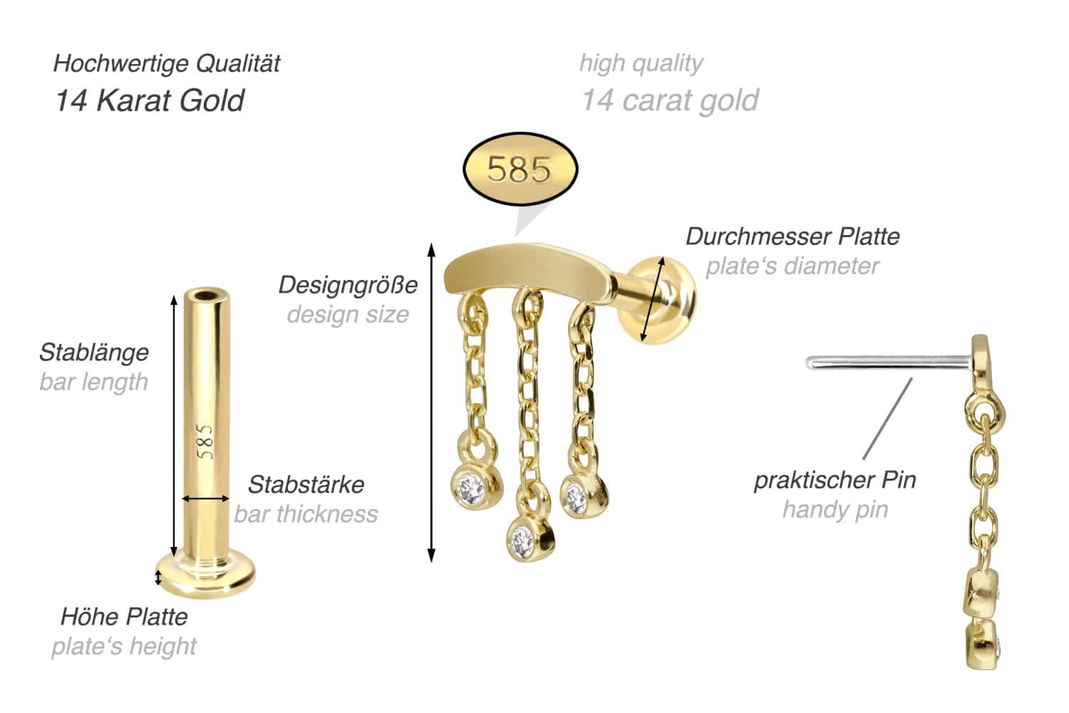 Except for the moissanites, this labret is made of high-quality 14 carat (585) gold, which, in addition to its excellent quality, also impresses with properties such as good skin compatibility and high durability. It is available in yellow gold, rose gold and rhodium-plated white gold. The labret is supplied with a timelessly beautiful attachment with titanium push pin in form of a wind chimes, has a bar thickness of either 1 or 1.2 mm and is available in the bar lengths listed below. The moissanite gives the piece of jewellery its extraordinary, diamond-like shine. Every single one of our gold items is handcrafted with great attention to detail and is therefore unique. Thanks to the push fit technology used, the labret can be combined with any of our gold attachments with titanium push pin.