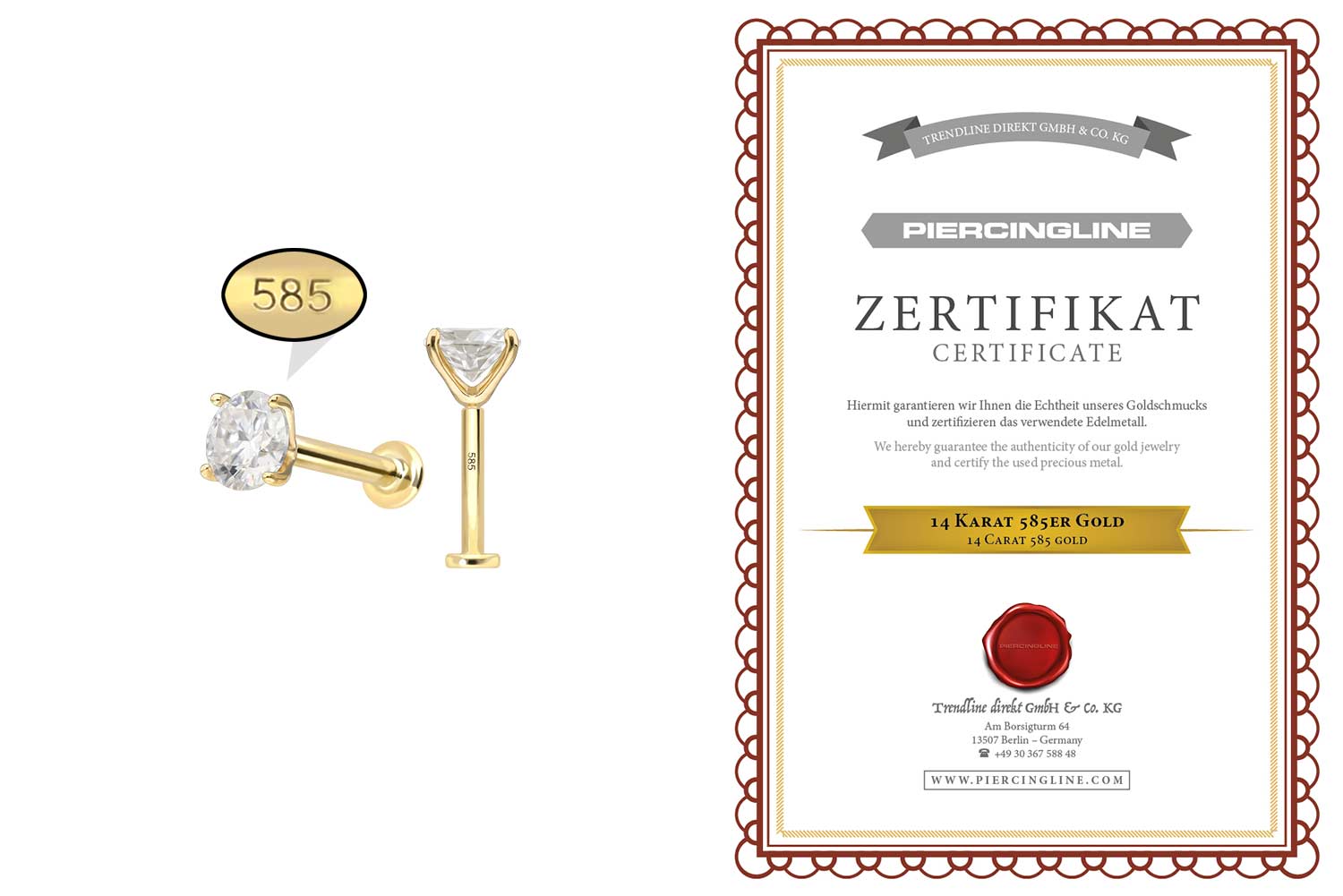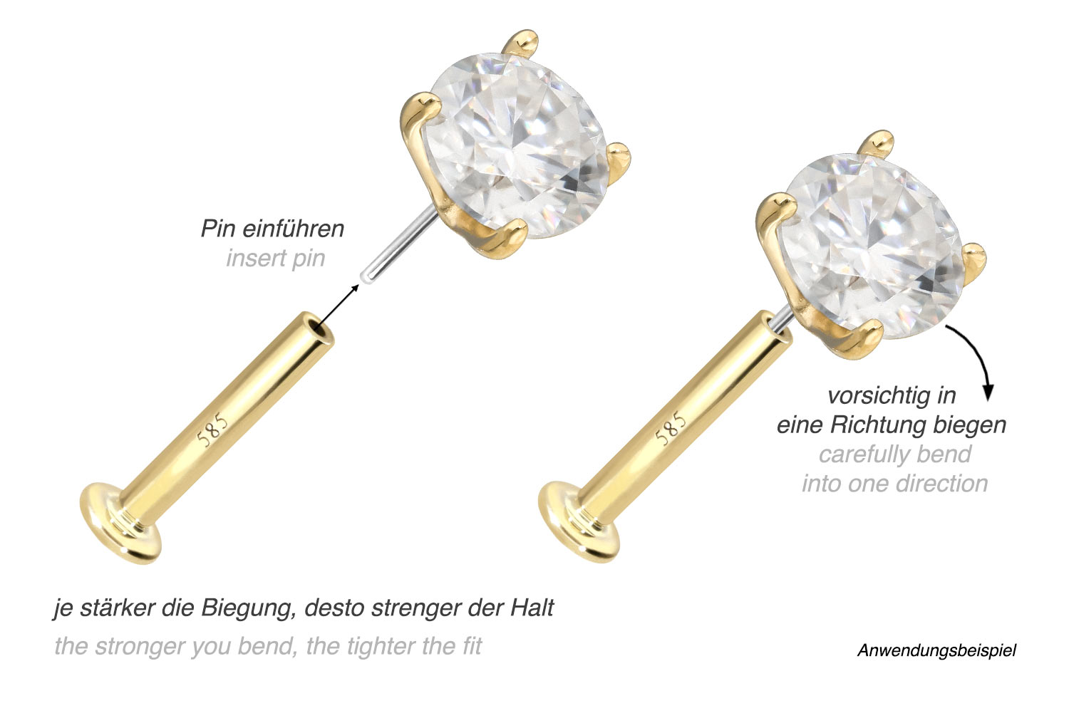 Except for the moissanite, this labret is made of high-quality 14 carat (585) gold, which, in addition to its excellent quality, also impresses with properties such as good skin compatibility and high durability. It is available in yellow gold, rose gold and rhodium-plated white gold. The labret is supplied with a timelessly beautiful attachment with titanium push pin, has a bar thickness of either 1 or 1.2 mm and is available in the bar lengths listed below. The moissanite gives the piece of jewellery its extraordinary, diamond-like shine. Every single one of our gold items is handcrafted with great attention to detail and is therefore unique. Thanks to the push fit technology used, the labret can be combined with any of our gold attachments with titanium push pin.