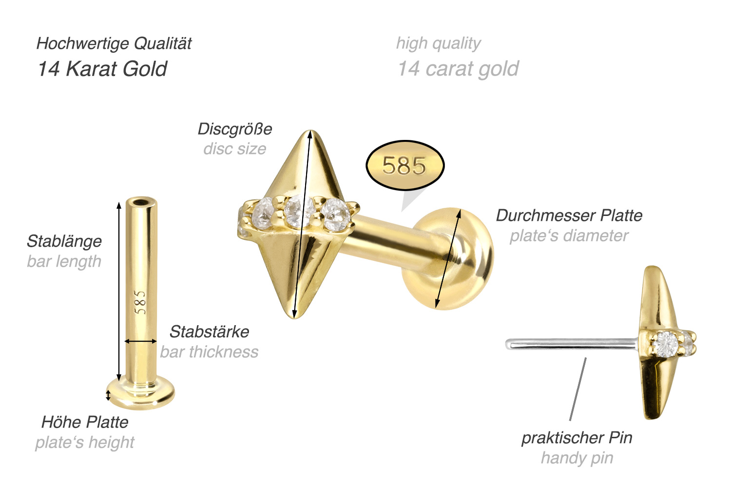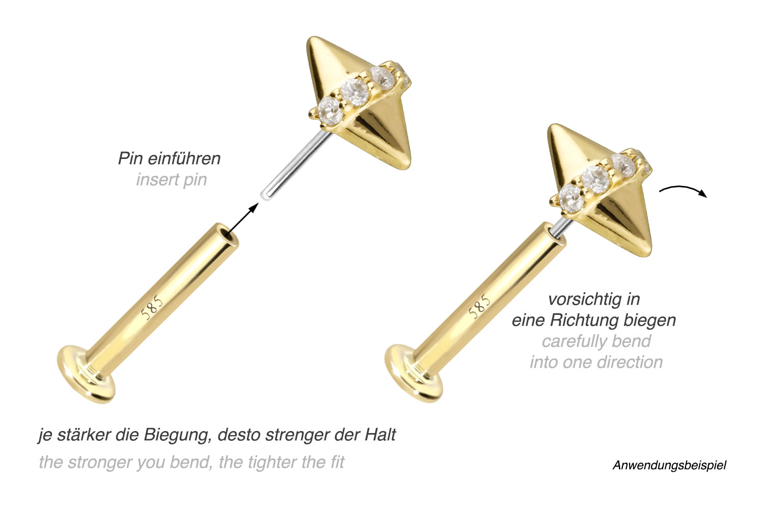 Except for the moissanites, this labret is made of high-quality 14 carat (585) gold, which, in addition to its excellent quality, also impresses with properties such as good skin compatibility and high durability. It is available in yellow gold, rose gold and rhodium-plated white gold. The labret is supplied with a timelessly beautiful attachment with titanium push pin in form of two cones, has a bar thickness of either 1 or 1.2 mm and is available in the bar lengths listed below. The moissanite gives the piece of jewellery its extraordinary, diamond-like shine. Every single one of our gold items is handcrafted with great attention to detail and is therefore unique. Thanks to the push fit technology used, the labret can be combined with any of our gold attachments with titanium push pin.