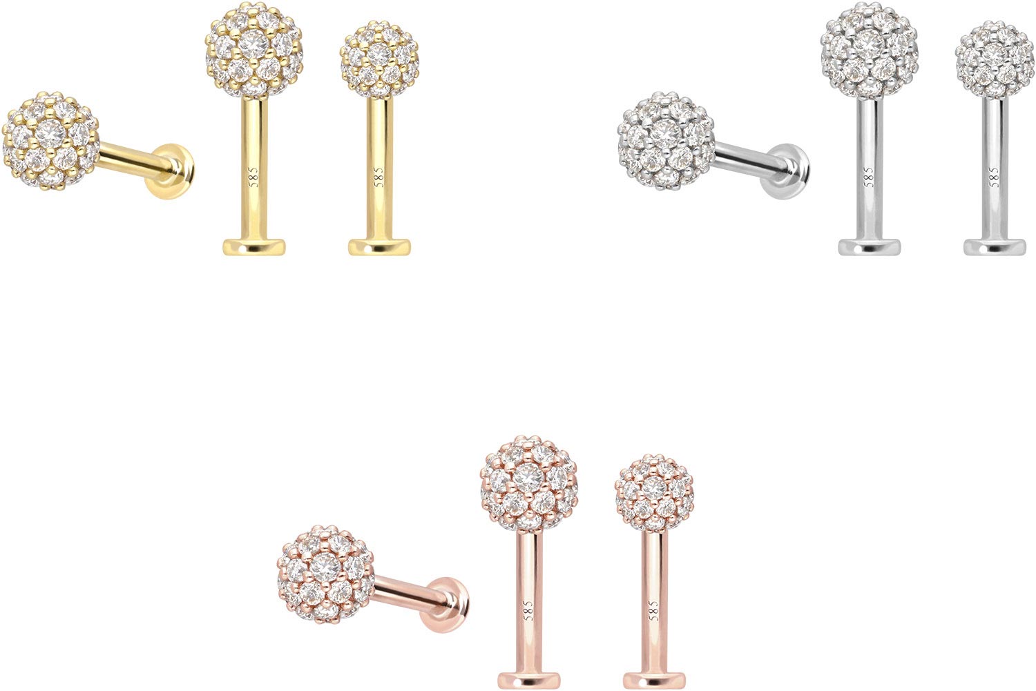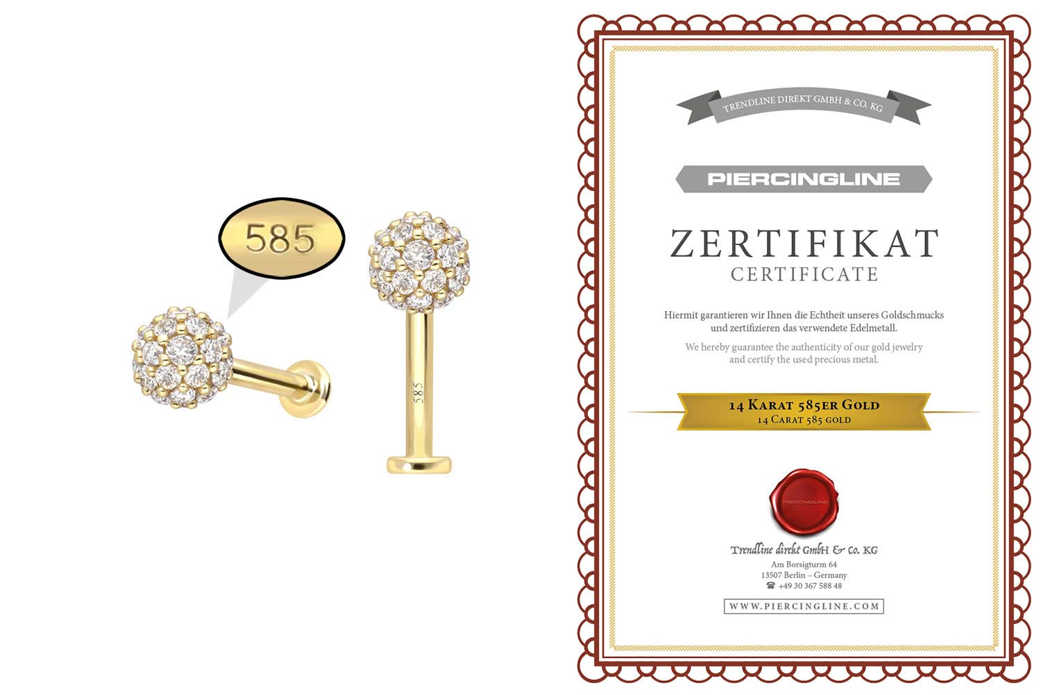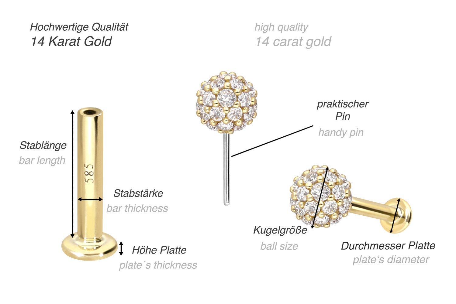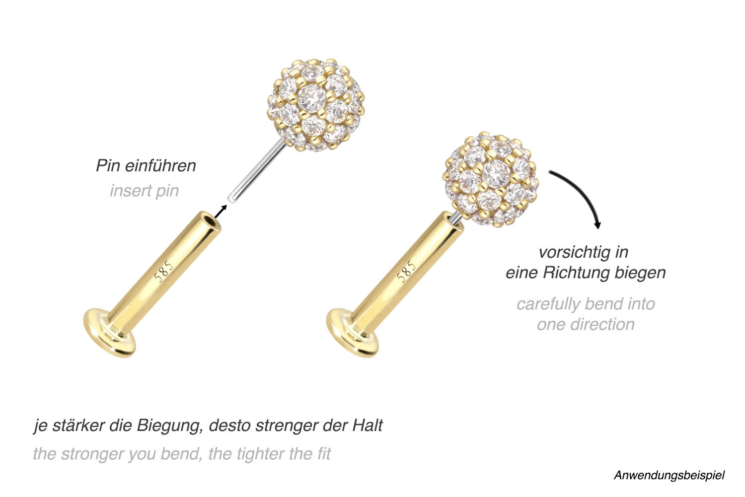 Except for the moissanites, this labret is made of high-quality 14 carat (585) gold, which, in addition to its excellent quality, also impresses with properties such as good skin compatibility and high durability. It is available in yellow gold, rose gold and rhodium-plated white gold. The labret is supplied with a timelessly beautiful attachment with titanium push pin, has a bar thickness of either 1 or 1.2 mm and is available in the bar lengths listed below. The moissanite gives the piece of jewellery its extraordinary, diamond-like shine. Every single one of our gold items is handcrafted with great attention to detail and is therefore unique. Thanks to the push fit technology used, the labret can be combined with any of our gold attachments with titanium push pin.
