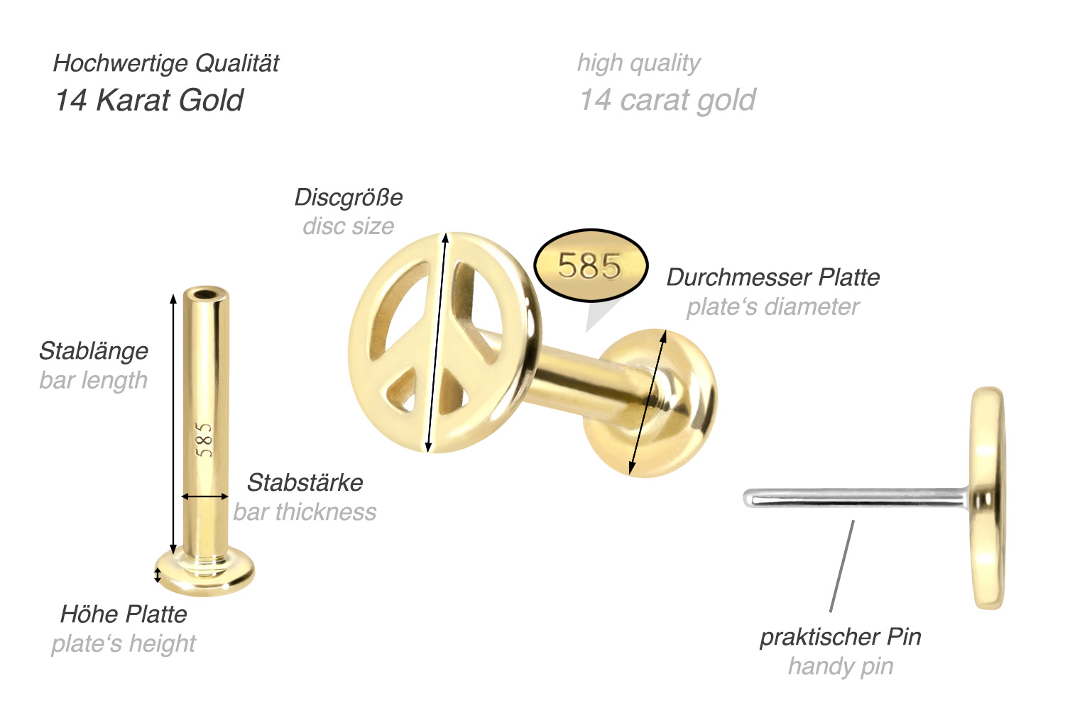 This labret is made of high-quality 14 carat (585) gold, which, in addition to its excellent quality, also impresses with properties such as good skin compatibility and high durability. It is available in yellow gold, rose gold and rhodium-plated white gold. The labret is supplied with a timelessly beautiful attachment with titanium push pin in form of a peace sign, has a bar thickness of either 1 or 1.2 mm and is available in the bar lengths listed below. Every single one of our gold items is handcrafted with great attention to detail and is therefore unique. Thanks to the push fit technology used, the labret can be combined with any of our gold attachments with titanium push pin.