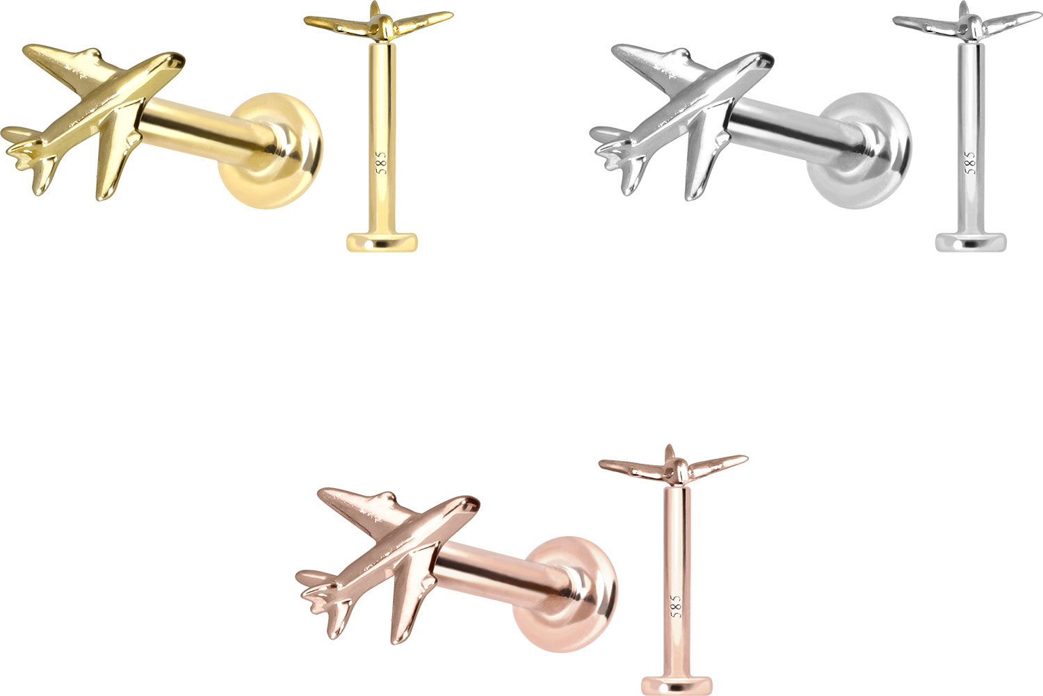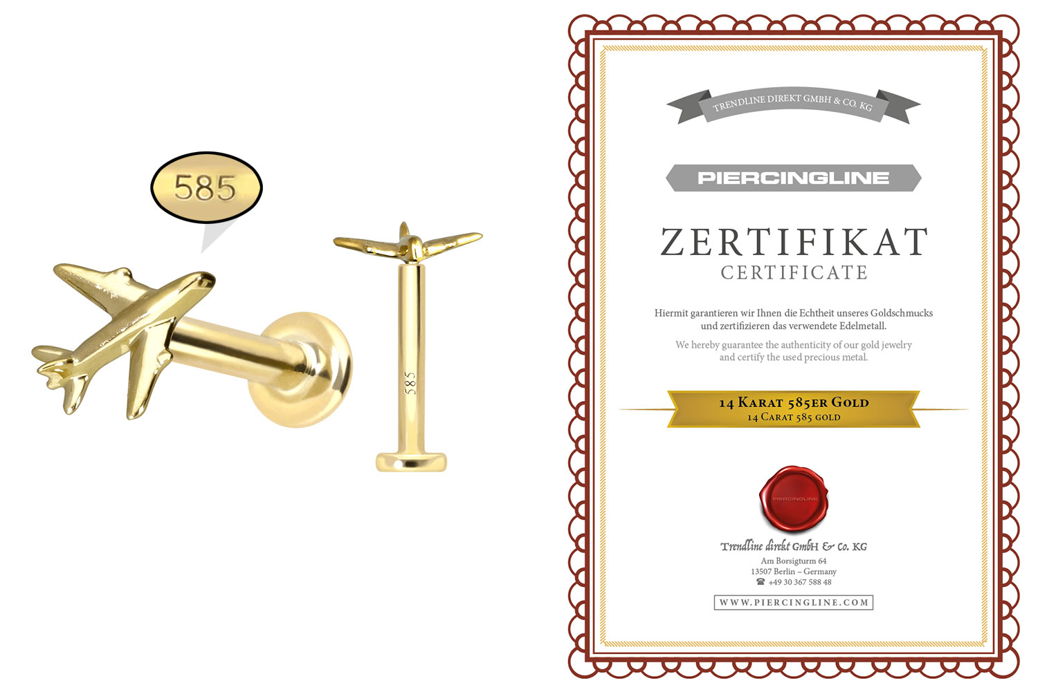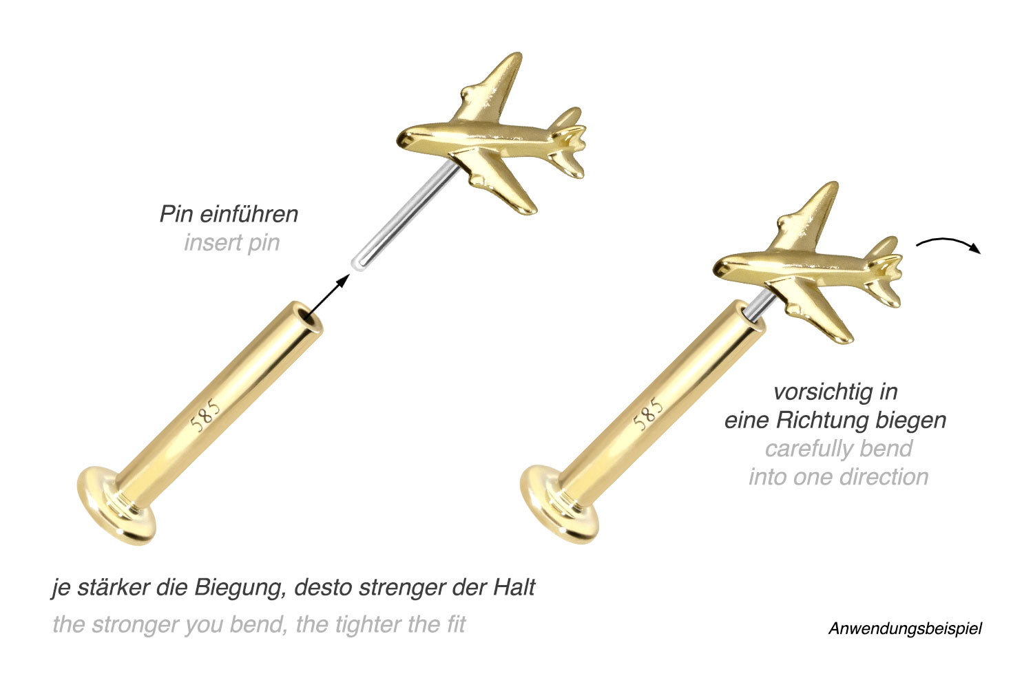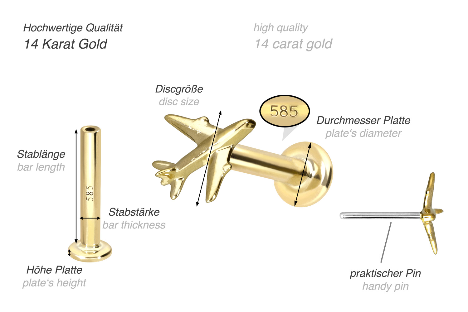 This labret is made of high-quality 14 carat (585) gold, which, in addition to its excellent quality, also impresses with properties such as good skin compatibility and high durability. It is available in yellow gold, rose gold and rhodium-plated white gold. The labret is supplied with a timelessly beautiful attachment with titanium push pin in form of a plane, has a bar thickness of either 1 or 1.2 mm and is available in the bar lengths listed below. Every single one of our gold items is handcrafted with great attention to detail and is therefore unique. Thanks to the push fit technology used, the labret can be combined with any of our gold attachments with titanium push pin.