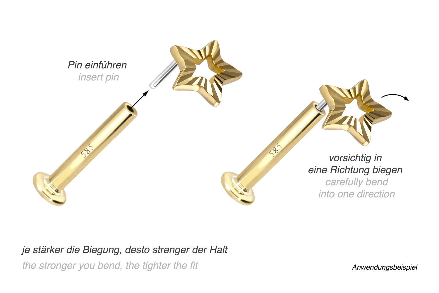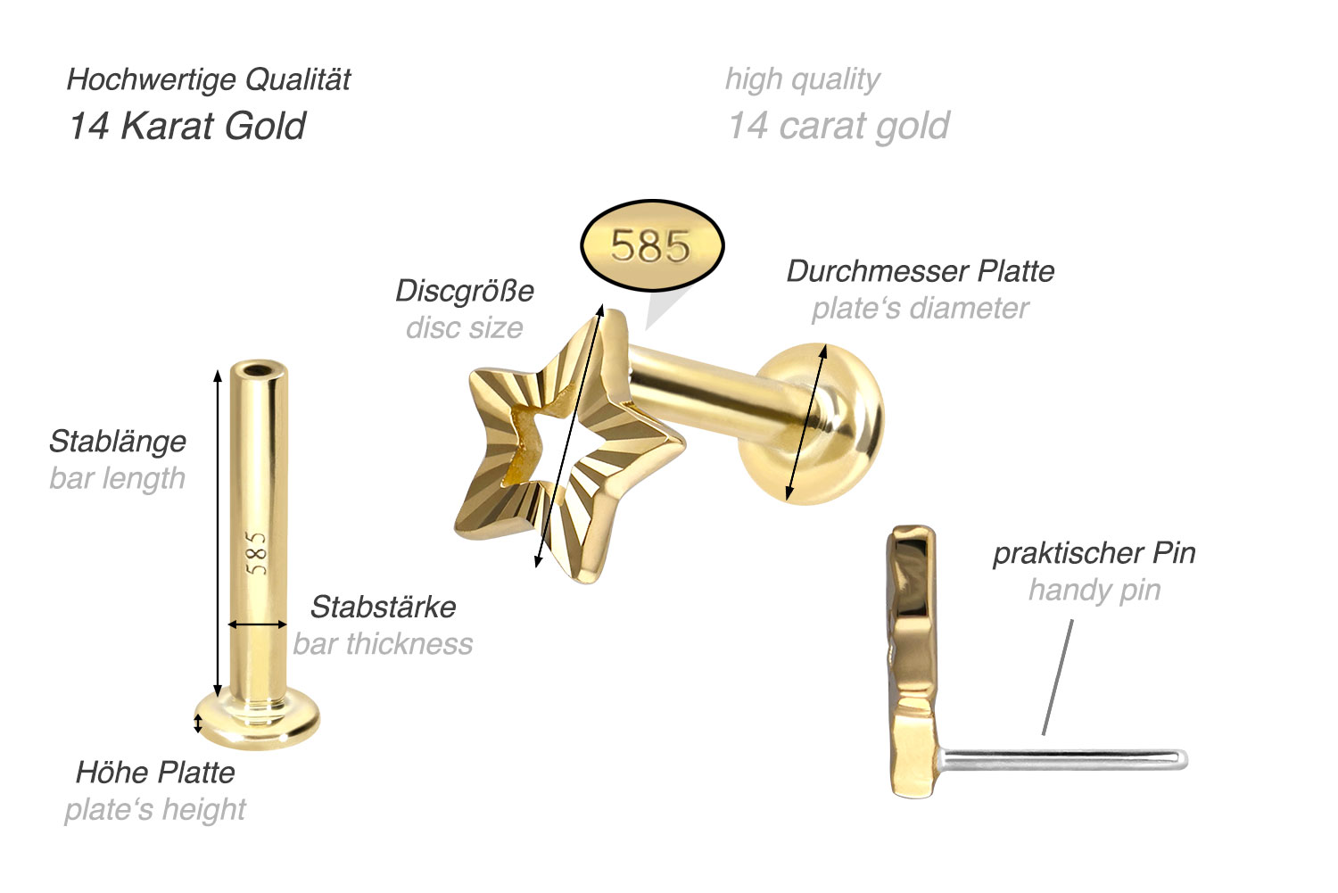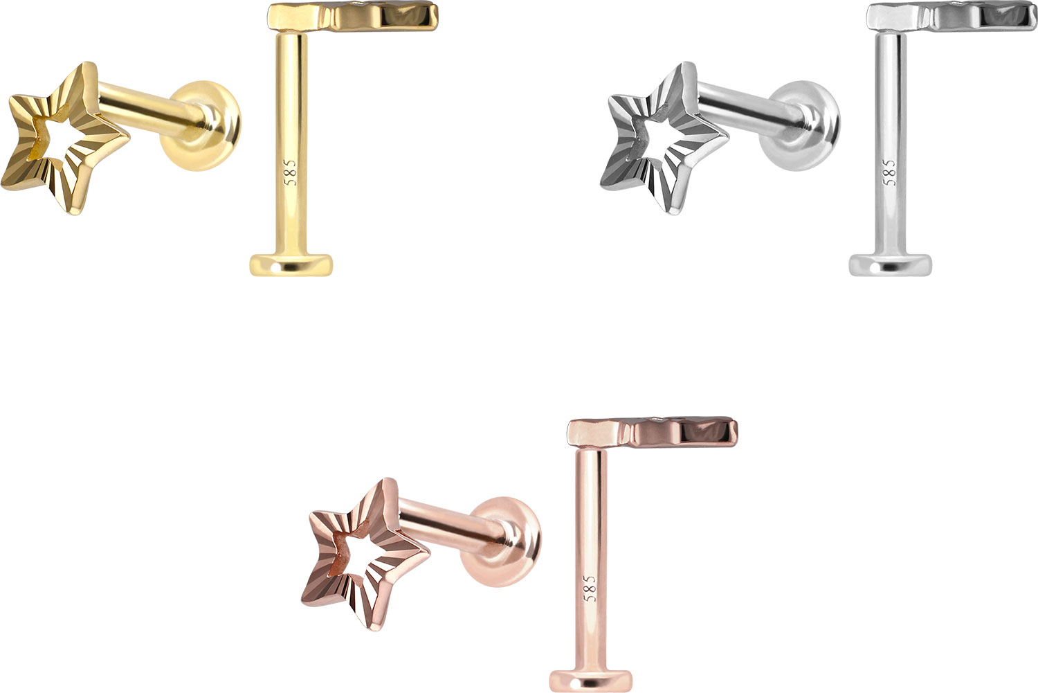 This labret is made of high-quality 14 carat (585) gold, which, in addition to its excellent quality, also impresses with properties such as good skin compatibility and high durability. It is available in yellow gold, rose gold and rhodium-plated white gold. The labret is supplied with a timelessly beautiful attachment with titanium push pin in form of a star, has a bar thickness of either 1 or 1.2 mm and is available in the bar lengths listed below. Every single one of our gold items is handcrafted with great attention to detail and is therefore unique. Thanks to the push fit technology used, the labret can be combined with any of our gold attachments with titanium push pin.
