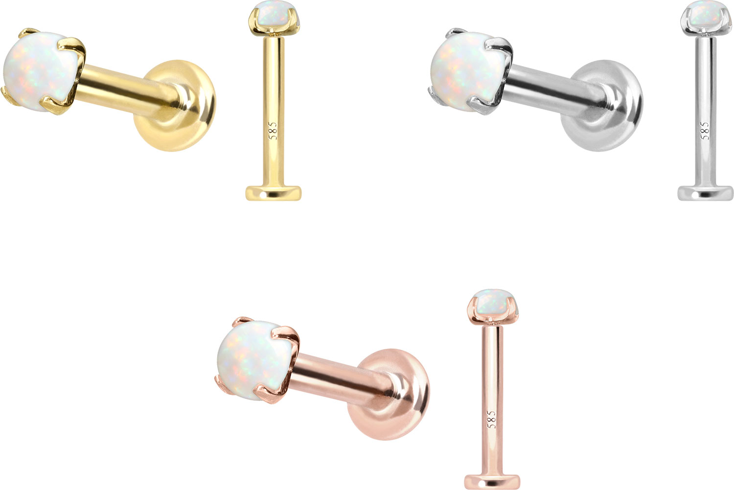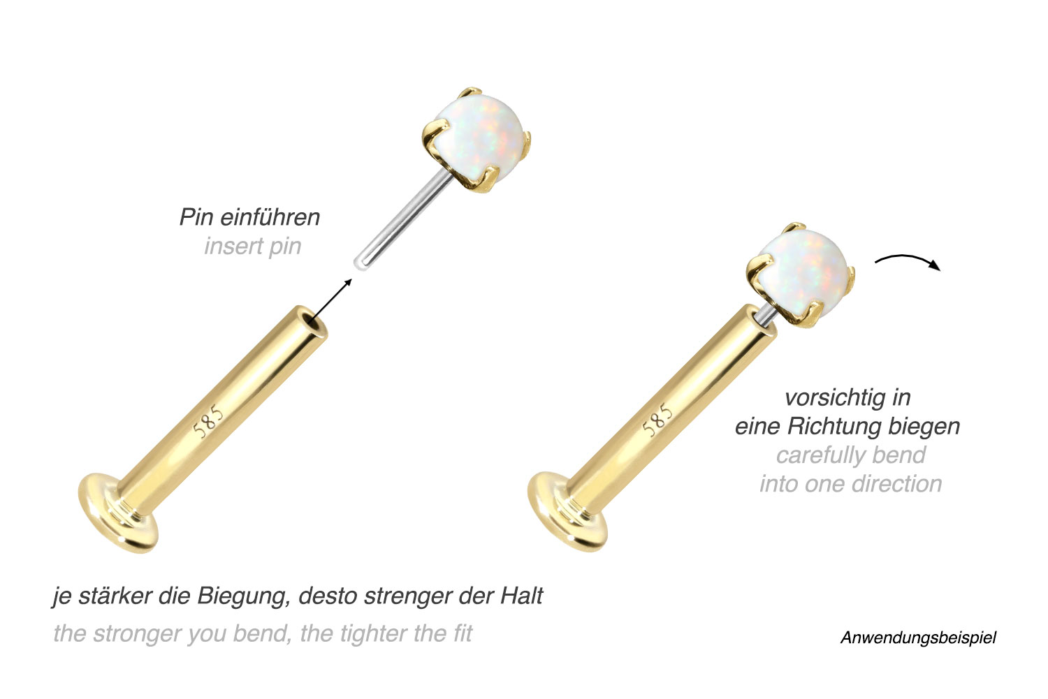 Except for the synthetic opal, this labret is made of high-quality 14 carat (585) gold, which, in addition to its excellent quality, also impresses with properties such as good skin compatibility and high durability. It is available in yellow gold, rose gold and rhodium-plated white gold. The labret is supplied with a timelessly beautiful attachment with titanium push pin, has a bar thickness of either 1 or 1.2 mm and is available in the bar lengths listed below. Every single one of our gold items is handcrafted with great attention to detail and is therefore unique. Thanks to the push fit technology used, the labret can be combined with any of our gold attachments with titanium push pin.