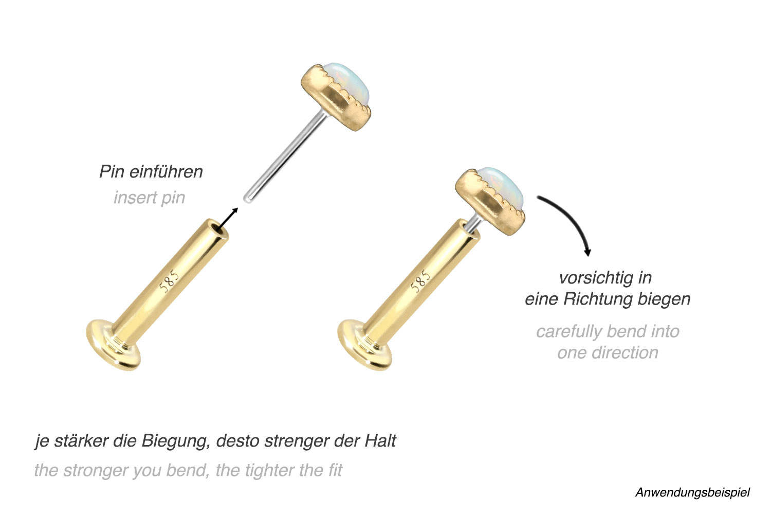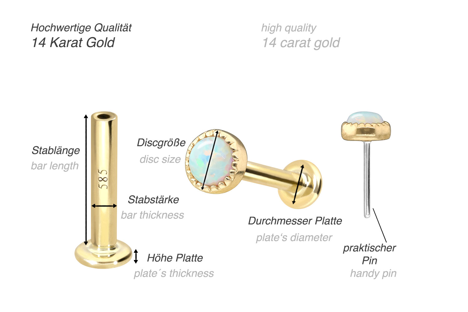 Except for the synthetic opal, this labret is made of high-quality 14 carat (585) gold, which, in addition to its excellent quality, also impresses with properties such as good skin compatibility and high durability. It is available in yellow gold, rose gold and rhodium-plated white gold. The labret is supplied with a timelessly beautiful attachment with titanium push pin, has a bar thickness of either 1 or 1.2 mm and is available in the bar lengths listed below. Every single one of our gold items is handcrafted with great attention to detail and is therefore unique. Thanks to the push fit technology used, the labret can be combined with any of our gold attachments with titanium push pin.