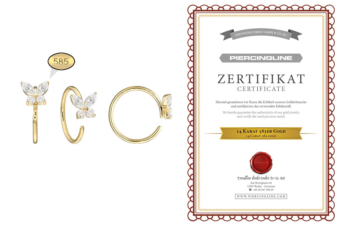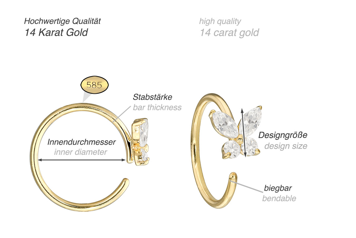 Except for the moissanites, this nose ring with the design in form of a butterfly is made entirely of high quality 14 carat (585) yellow gold, which in addition to its excellent quality also knows how to impress with properties such as good skin compatibility and high durability. The moissanite gives the piece of jewellery its extraordinary, diamond-like shine. Each and every one of our gold items is handcrafted with great attention to detail, making it one of a kind. Since this piece of jewelry is bendable, an ideal adjustment to the individual nose shape can be made, so that the wearing experience proves to be even more comfortable. The nose ring always has a bar thickness of 0.8 mm, whereas its inner diameter is 7 mm.