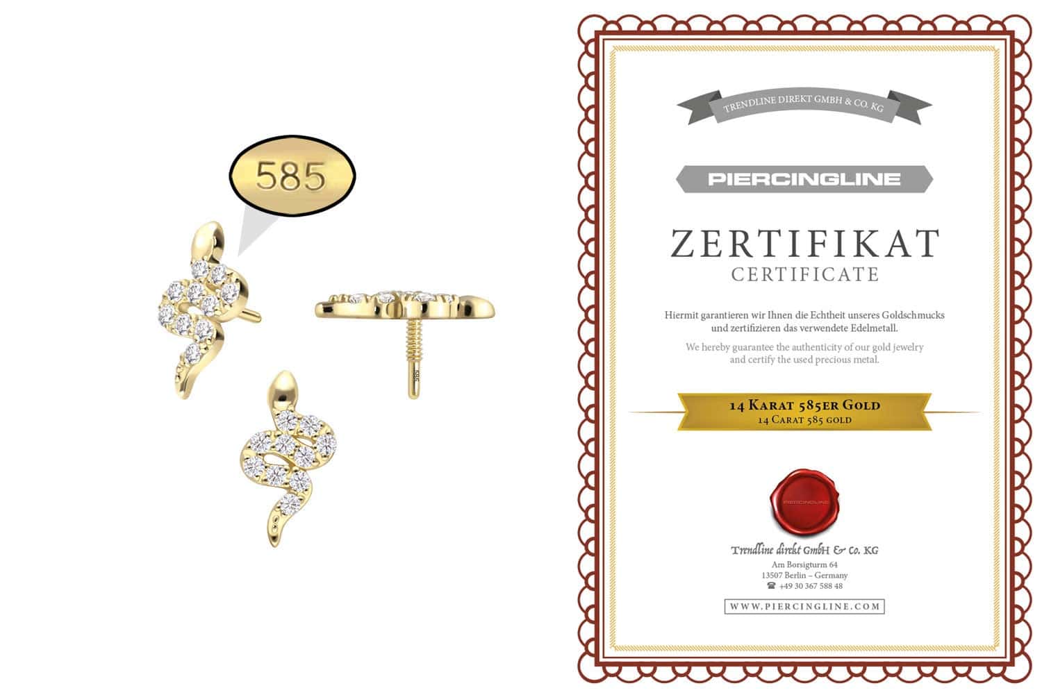 Except for the moissanites, this timelessly beautiful screw-in attachment in form of a snake is made entirely of high quality 14 carat (585) gold, which in addition to its excellent quality also knows how to impress with properties such as good skin compatibility and high durability. Color-wise, it is available in yellow gold, rose gold and rhodium-plated white gold. The moissanite gives the piece of jewellery its extraordinary, diamond-like shine. Each and every one of our gold items is handcrafted with great attention to detail, making it one of a kind. Since the 0.8 mm external thread of the attachment is compatible with all our 14 carat (585) gold products with this kind of internal thread, there are various combination possibilities.