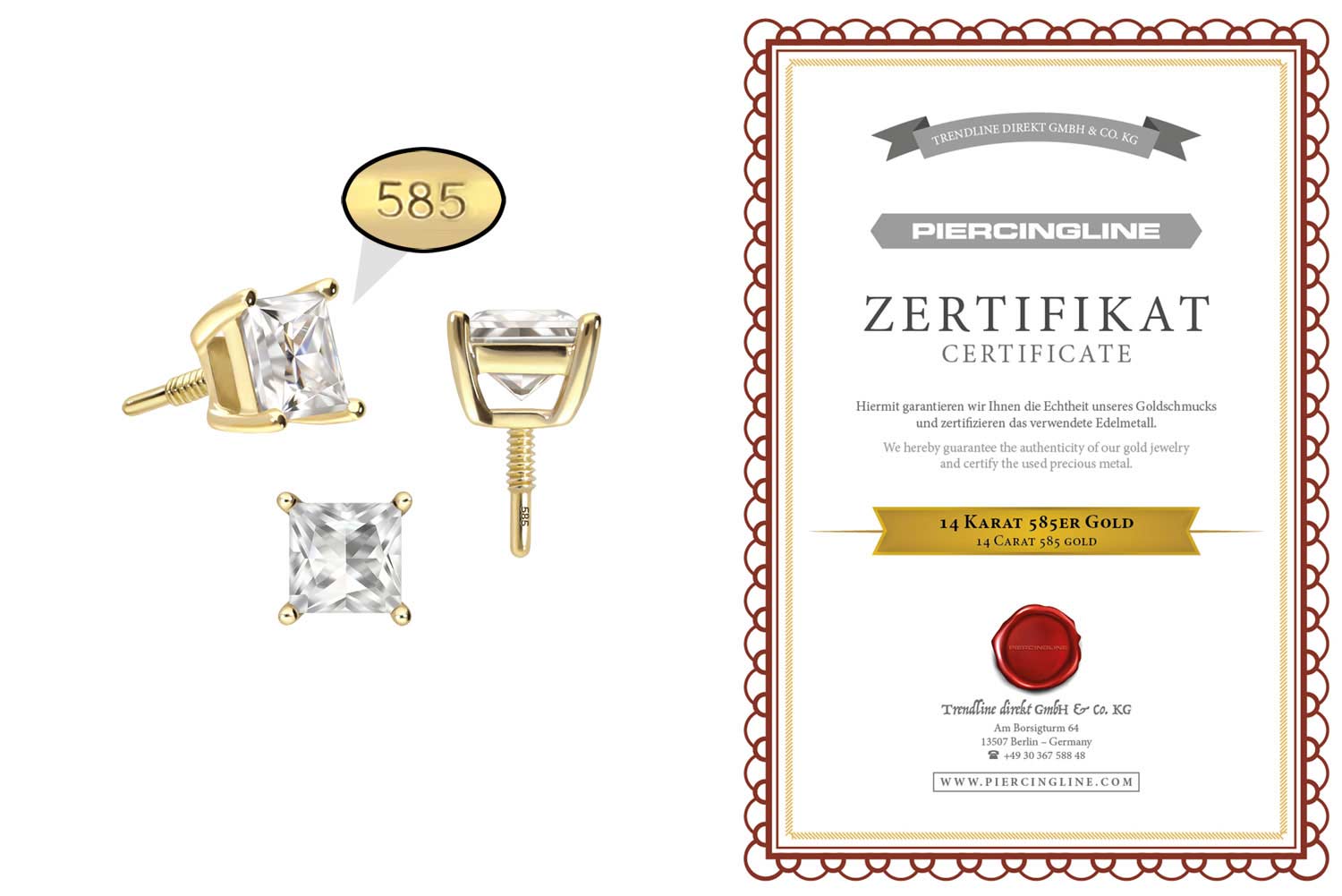 Except for the moissanite in form of a square, this timelessly beautiful screw-in attachment is made entirely of high quality 14 carat (585) gold, which in addition to its excellent quality also knows how to impress with properties such as good skin compatibility and high durability. Color-wise, it is available in yellow gold, rose gold and rhodium-plated white gold. The moissanite gives the piece of jewellery its extraordinary, diamond-like shine. Each and every one of our gold items is handcrafted with great attention to detail, making it one of a kind. Since the 0.8 mm external thread of the attachment is compatible with all our 14 carat (585) gold products with this kind of internal thread, there are various combination possibilities.