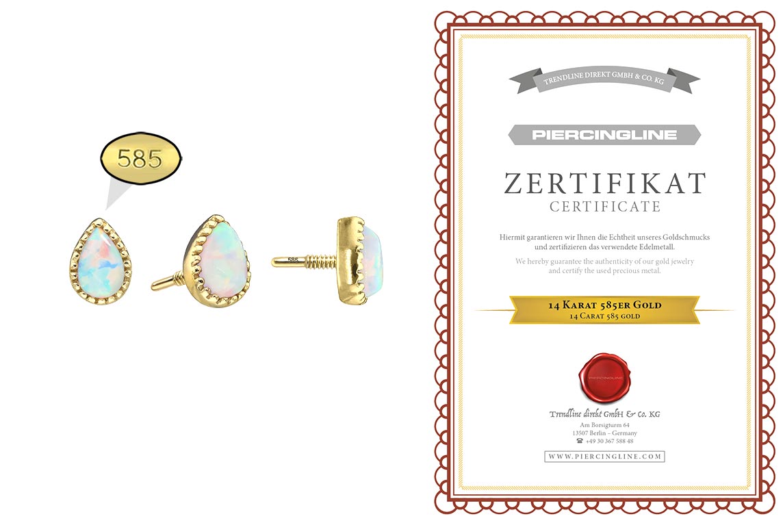 Except for the synthetic opal drop, this timelessly beautiful screw-in attachment in form of a opal ball is made entirely of high quality 14 carat (585) gold, which in addition to its excellent quality also knows how to impress with properties such as good skin compatibility and high durability. Color-wise, it is available in yellow gold, rose gold and rhodium-plated white gold. Each and every one of our gold items is handcrafted with great attention to detail, making it one of a kind. Since the 0.8 mm external thread of the attachment is compatible with all our 14 carat (585) gold products with this kind of internal thread, there are various combination possibilities.