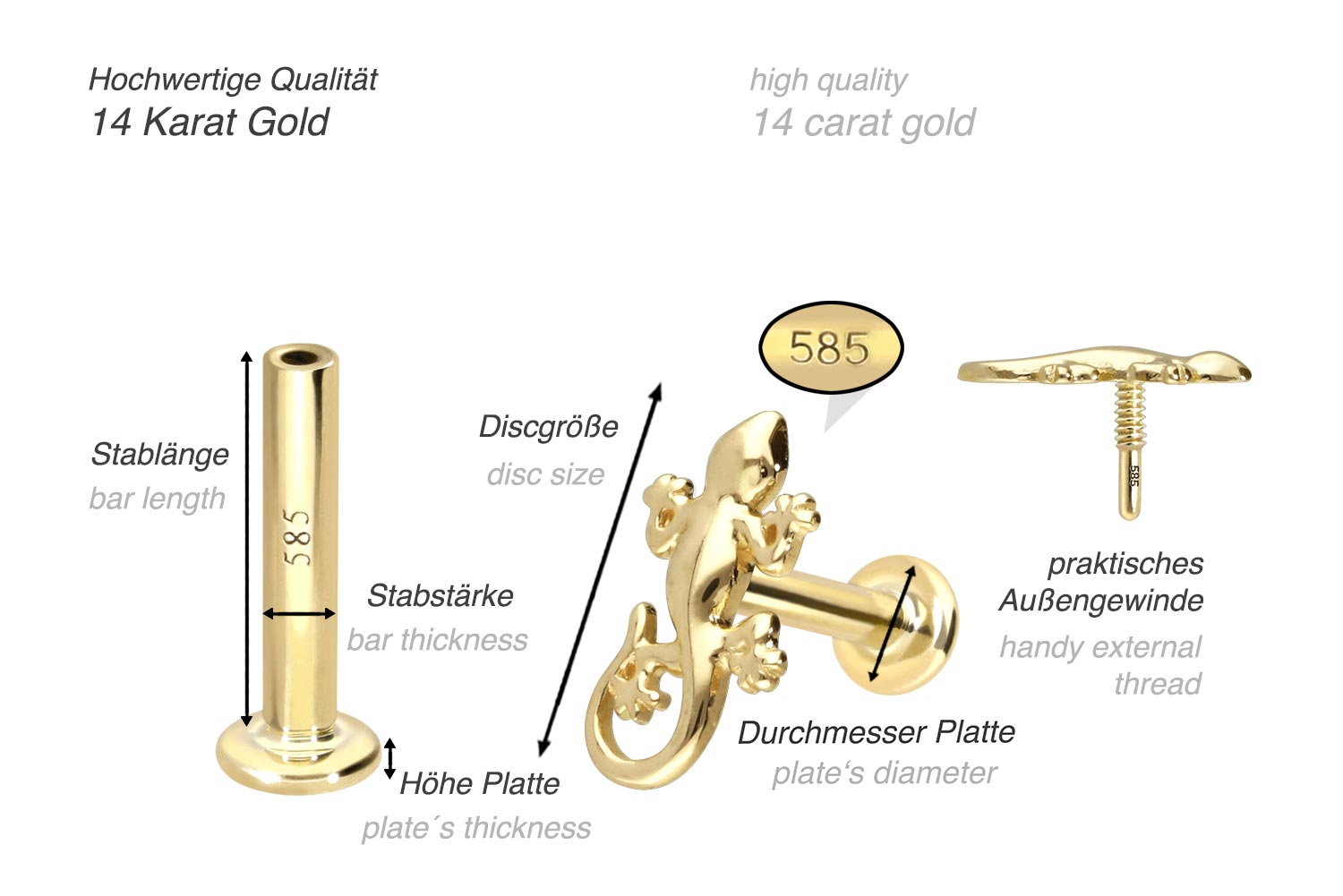 This labret is made entirely of high quality 14 carat (585) gold, which in addition to its excellent quality also knows how to impress with properties such as good skin compatibility and high durability. Color-wise, it is available in yellow gold, rose gold and rhodium-plated white gold. The labret is supplied with a timelessly beautiful screw-in attachment with external thread in form of a gecko, has a bar thickness of either 1 or 1.2 mm and is available with the bar lengths listed below. Each and every one of our gold items is handcrafted with great attention to detail, making it one of a kind. Since the 0.8 mm internal thread of the labret is compatible with all our 14 carat (585) gold products with this kind of external thread, there are various combination possibilities.
