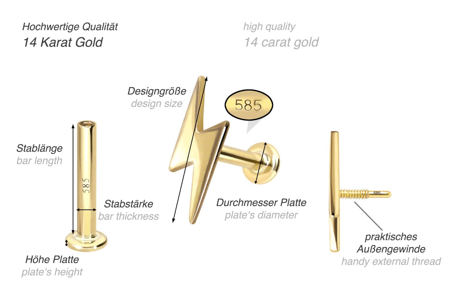 This labret is made entirely of high quality 14 carat (585) gold, which in addition to its excellent quality also knows how to impress with properties such as good skin compatibility and high durability. Color-wise, it is available in yellow gold, rose gold and rhodium-plated white gold. The labret is supplied with a timelessly beautiful screw-in attachment with external thread in form of a lightning, has a bar thickness of either 1 or 1.2 mm and is available with the bar lengths listed below. The moissanite gives the piece of jewellery its extraordinary, diamond-like shine. Each and every one of our gold items is handcrafted with great attention to detail, making it one of a kind. Since the 0.8 mm internal thread of the labret is compatible with all our gold products with this kind of external thread, there are various combination possibilities.