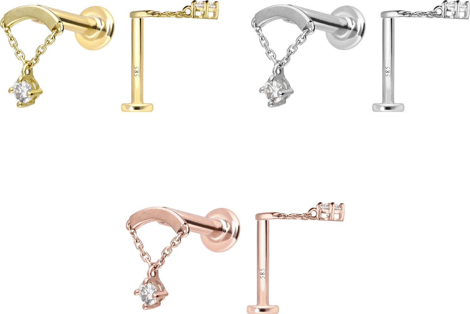 Except for the moissanite, this labret is made entirely of high quality 14 carat (585) gold, which in addition to its excellent quality also knows how to impress with properties such as good skin compatibility and high durability. Color-wise, it is available in yellow gold, rose gold and rhodium-plated white gold. The labret is supplied with a timelessly beautiful screw-in attachment with external thread in form of an arch, to which a chain is attached, has a bar thickness of either 1 or 1.2 mm and is available with the bar lengths listed below. The moissanite gives the piece of jewellery its extraordinary, diamond-like shine. Each and every one of our gold items is handcrafted with great attention to detail, making it one of a kind. Since the 0.8 mm internal thread of the labret is compatible with all our gold products with this kind of external thread, there are various combination possibilities.