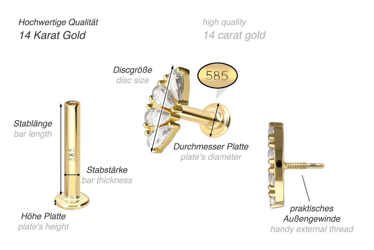 Except for the moissanites, this labret is made entirely of high quality 14 carat (585) gold, which in addition to its excellent quality also knows how to impress with properties such as good skin compatibility and high durability. Color-wise, it is available in yellow gold, rose gold and rhodium-plated white gold. The labret is supplied with a timelessly beautiful screw-in attachment with external thread in form of an arch, has a bar thickness of either 1 or 1.2 mm and is available with the bar lengths listed below. The moissanite gives the piece of jewellery its extraordinary, diamond-like shine. Each and every one of our gold items is handcrafted with great attention to detail, making it one of a kind. Since the 0.8 mm internal thread of the labret is compatible with all our gold products with this kind of external thread, there are various combination possibilities.