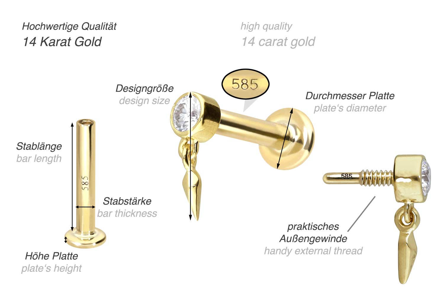 Except for the moissanite, this labret is made entirely of high quality 14 carat (585) gold, which in addition to its excellent quality also knows how to impress with properties such as good skin compatibility and high durability. Color-wise, it is available in yellow gold, rose gold and rhodium-plated white gold. The labret is supplied with a timelessly beautiful screw-in attachment with external thread in form of a moissanite, to which a cone is attached, has a bar thickness of either 1 or 1.2 mm and is available with the bar lengths listed below. The moissanite gives the piece of jewellery its extraordinary, diamond-like shine. Each and every one of our gold items is handcrafted with great attention to detail, making it one of a kind. Since the 0.8 mm internal thread of the labret is compatible with all our gold products with this kind of external thread, there are various combination possibilities.