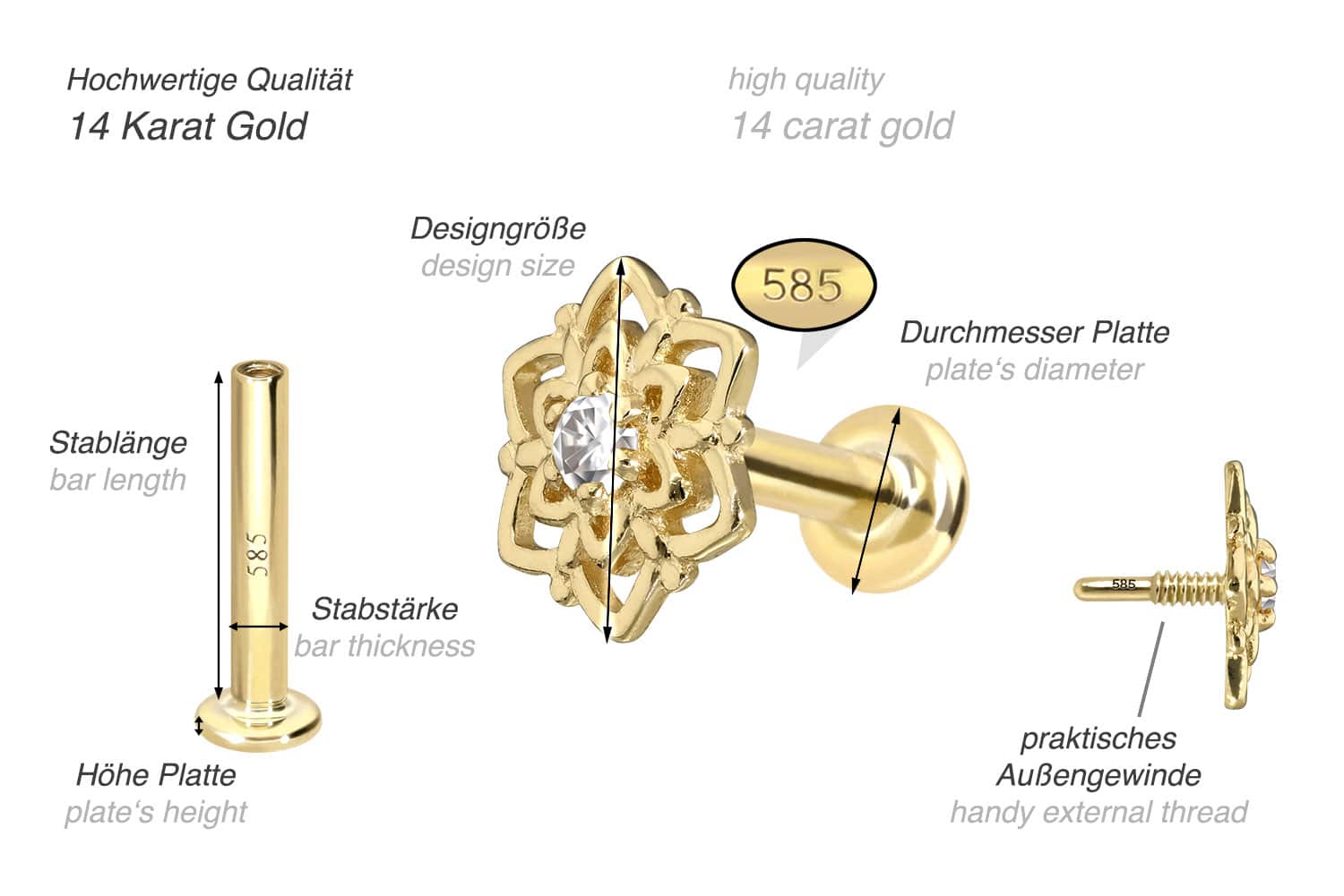 Except for the moissanite, this labret is made entirely of high quality 14 carat (585) gold, which in addition to its excellent quality also knows how to impress with properties such as good skin compatibility and high durability. Color-wise, it is available in yellow gold, rose gold and rhodium-plated white gold. The labret is supplied with a timelessly beautiful screw-in attachment with external thread in form of a flower, has a bar thickness of either 1 or 1.2 mm and is available with the bar lengths listed below. The moissanite gives the piece of jewellery its extraordinary, diamond-like shine. Each and every one of our gold items is handcrafted with great attention to detail, making it one of a kind. Since the 0.8 mm internal thread of the labret is compatible with all our gold products with this kind of external thread, there are various combination possibilities.