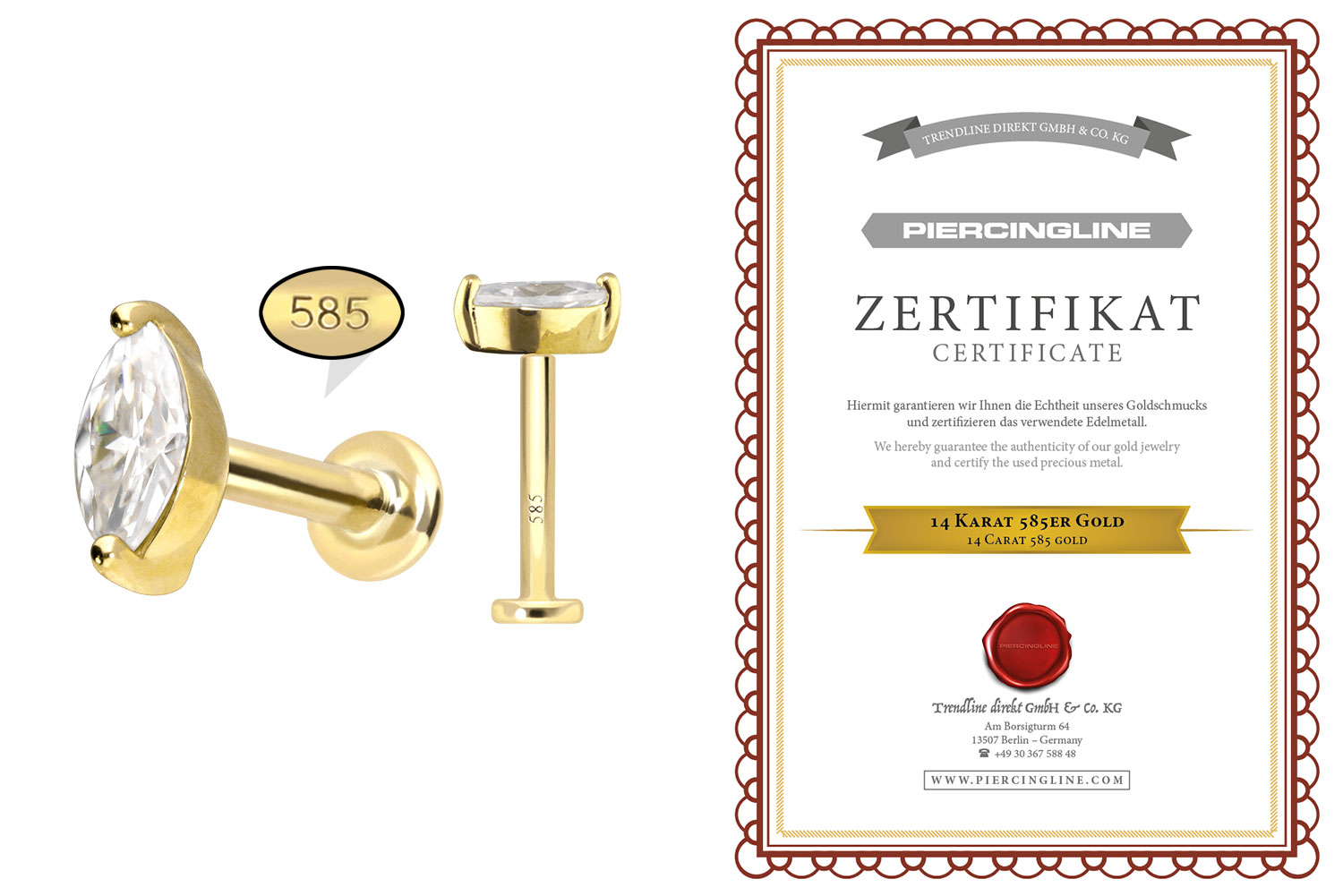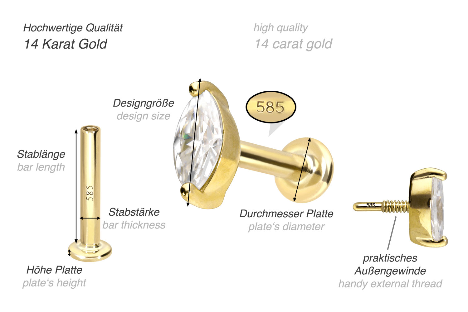 Except for the moissanite, this labret is made entirely of high quality 14 carat (585) gold, which in addition to its excellent quality also knows how to impress with properties such as good skin compatibility and high durability. Color-wise, it is available in yellow gold, rose gold and rhodium-plated white gold. The labret is supplied with a timelessly beautiful screw-in attachment with external thread in form of an oval, has a bar thickness of either 1 or 1.2 mm and is available with the bar lengths listed below. The moissanite gives the piece of jewellery its extraordinary, diamond-like shine. Each and every one of our gold items is handcrafted with great attention to detail, making it one of a kind. Since the 0.8 mm internal thread of the labret is compatible with all our gold products with this kind of external thread, there are various combination possibilities.